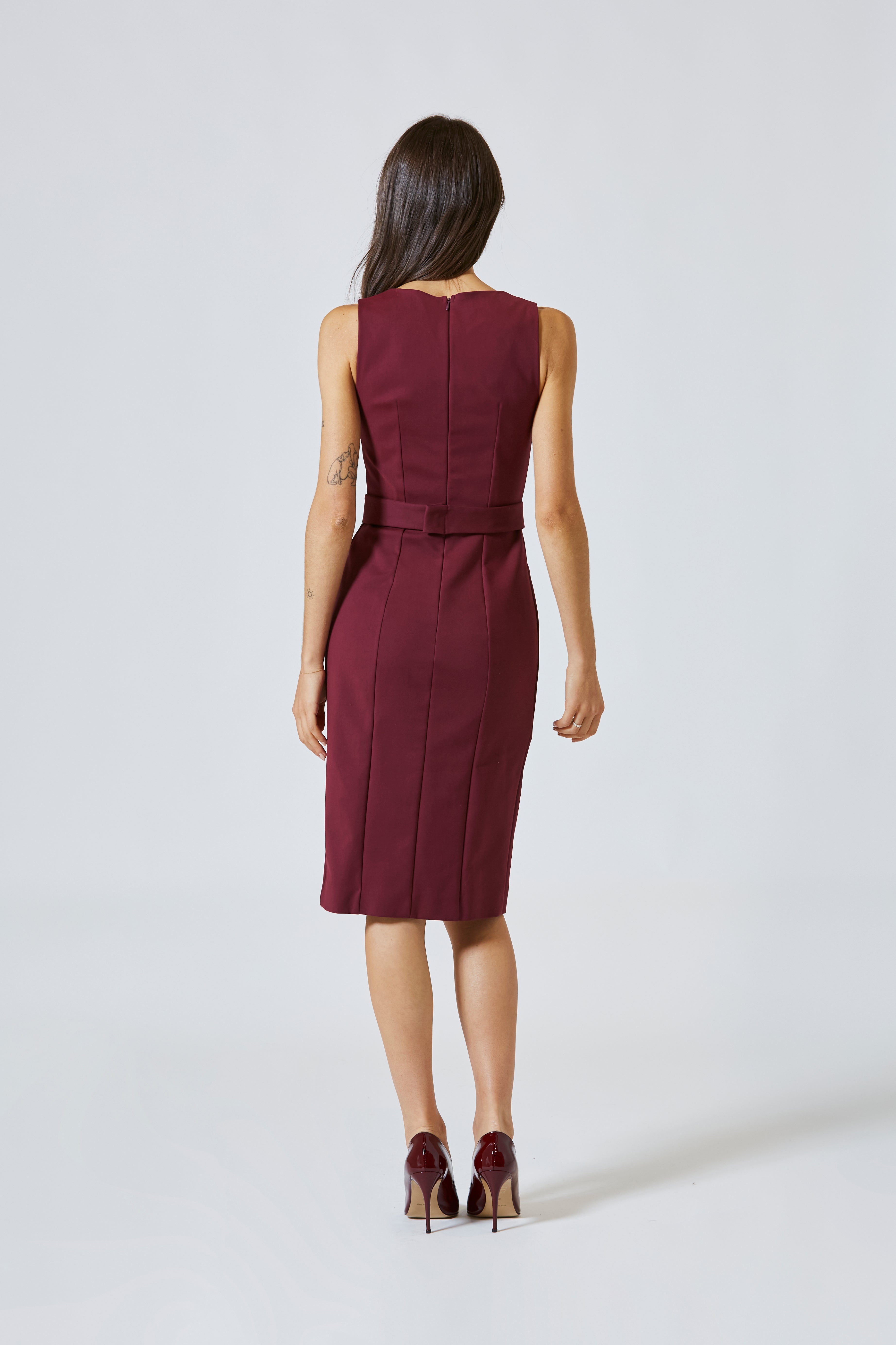 La linea tubino esalta la figura con sobrietà strategica: niente eccessi, nessun artificio. Solo proporzione, armonia, e quel dettaglio calibrato che cambia tutto —