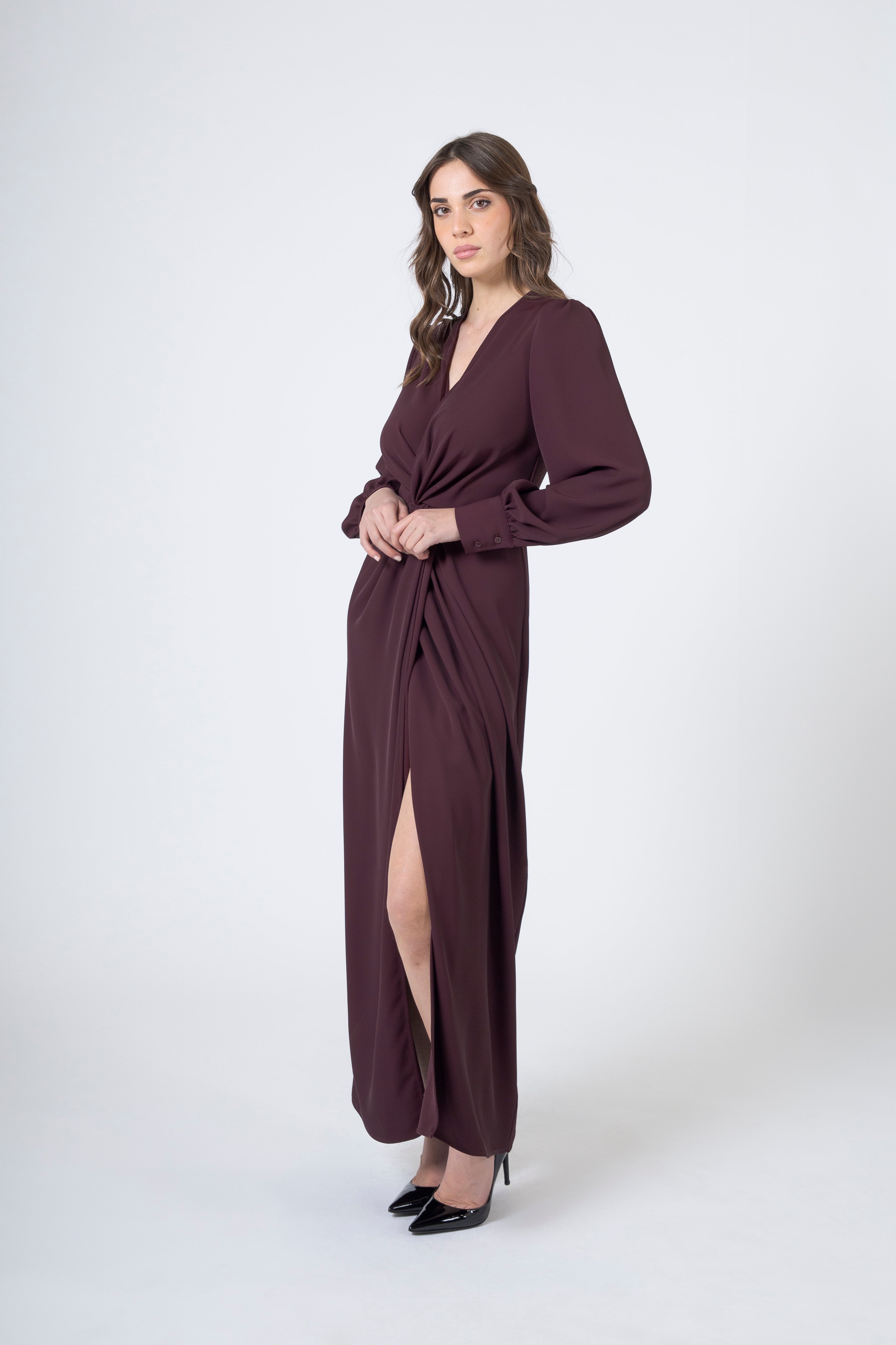 Immagina un capo che si muove con te, che scivola leggero come un soffio di vento e accarezza la figura con la morbidezza di un gesto gentile: l’abito lungo in tessuto fluido, con scollo a V, manica lunga e un simil nodo in vita che si apre in un elegante spacco frontale, è la celebrazione perfetta della femminilità moderna, sicura e luminosa.