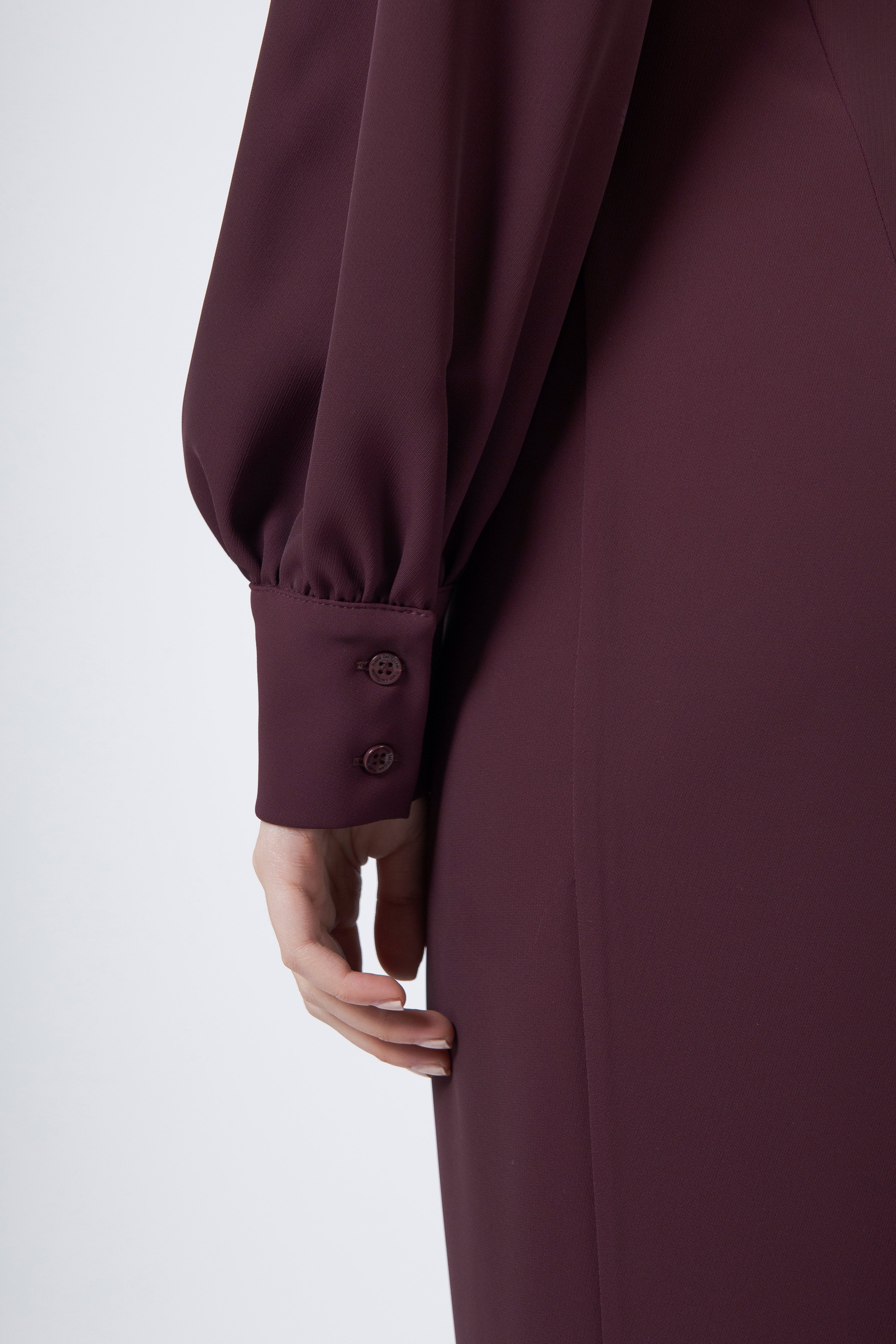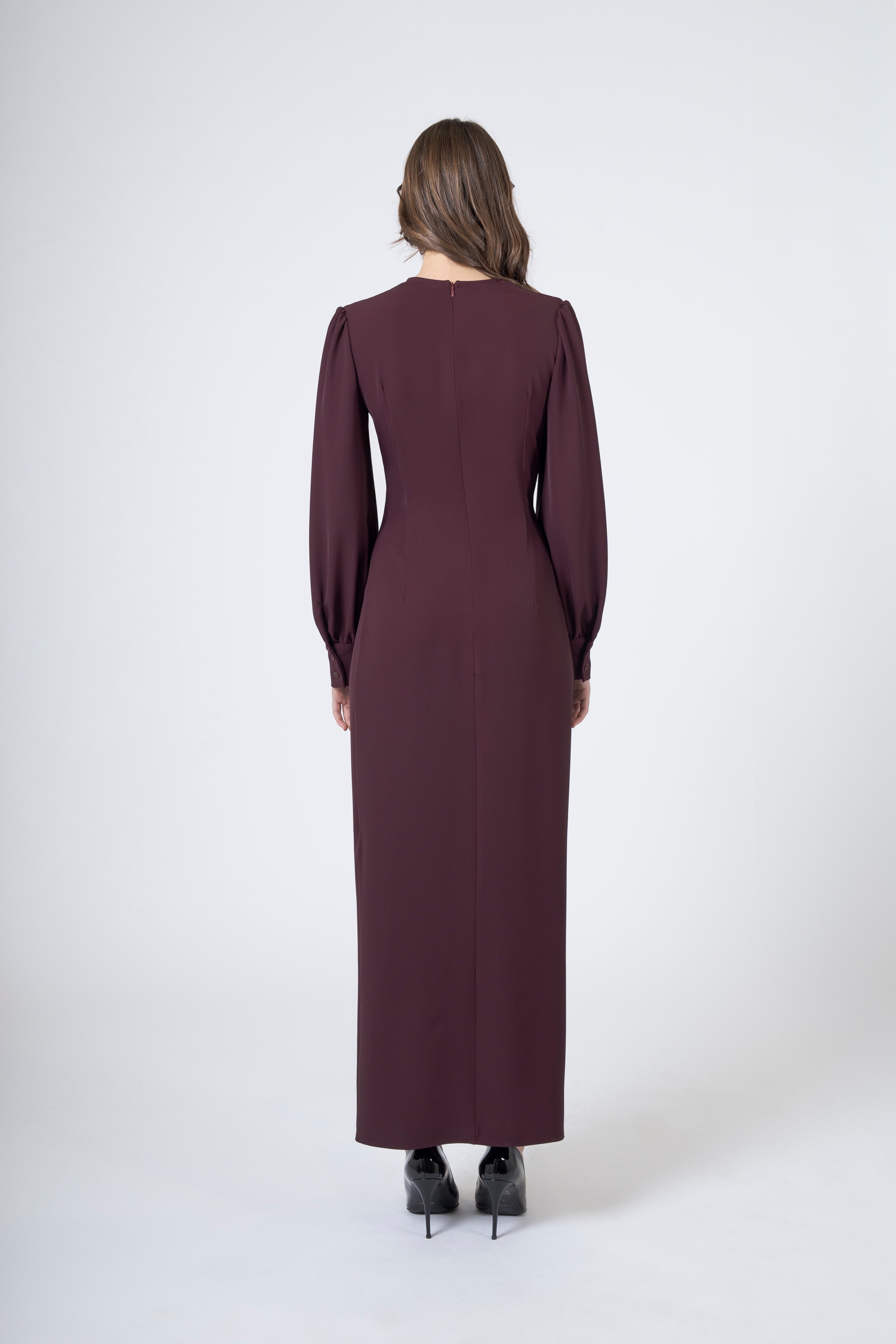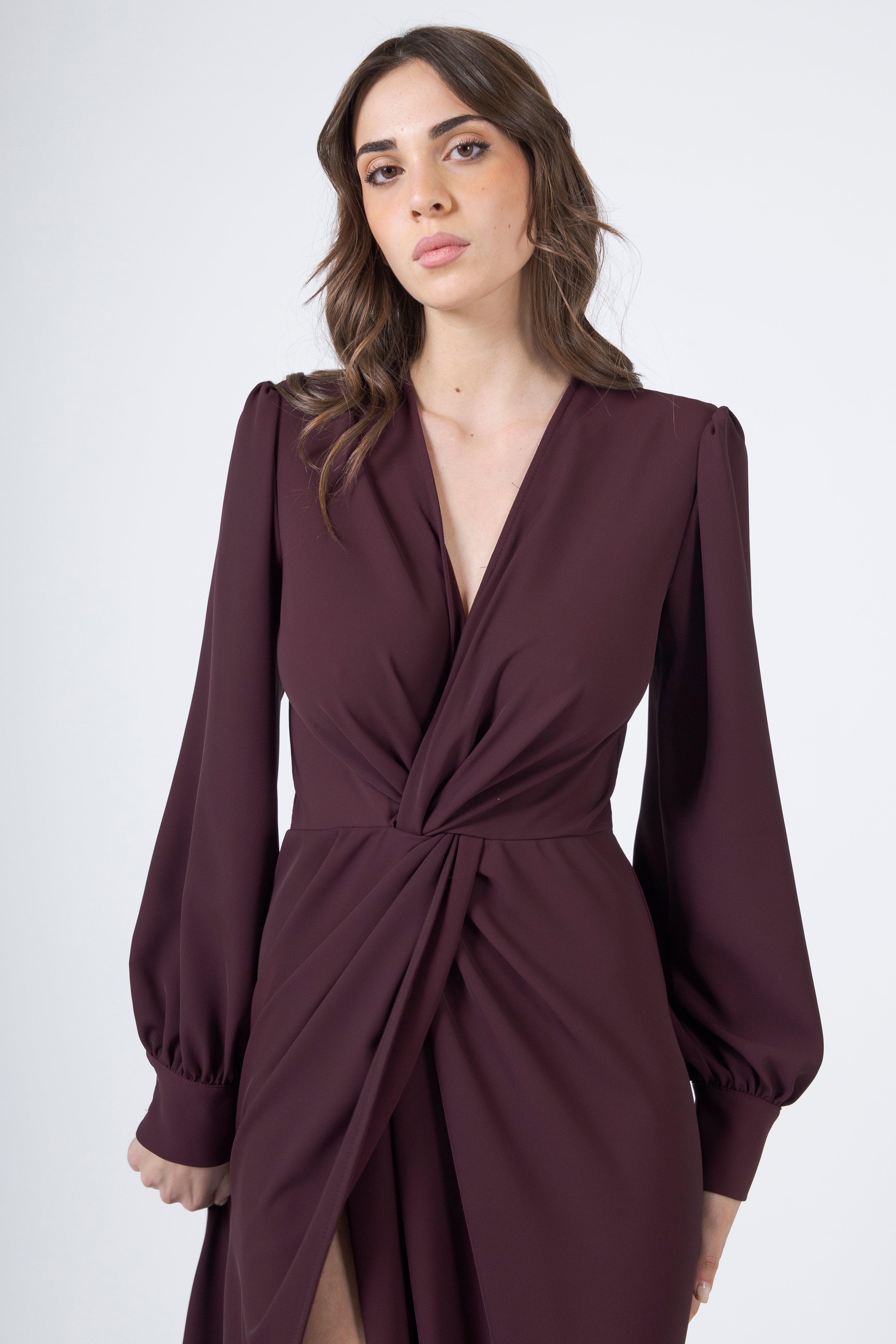 Lo scollo a V, profondo quanto basta, illumina il décolleté con raffinata discrezione. Allunga la linea del collo, dona verticalità alla figura e aggiunge un tocco di sensualità misurata, elegante, sempre equilibrata. La manica lunga, morbida e leggermente avvolgente, completa la parte superiore con un’eleganza vellutata, rendendo il capo ideale anche nelle serate più fresche o nelle occasioni in cui si desidera una presenza più sofisticata.