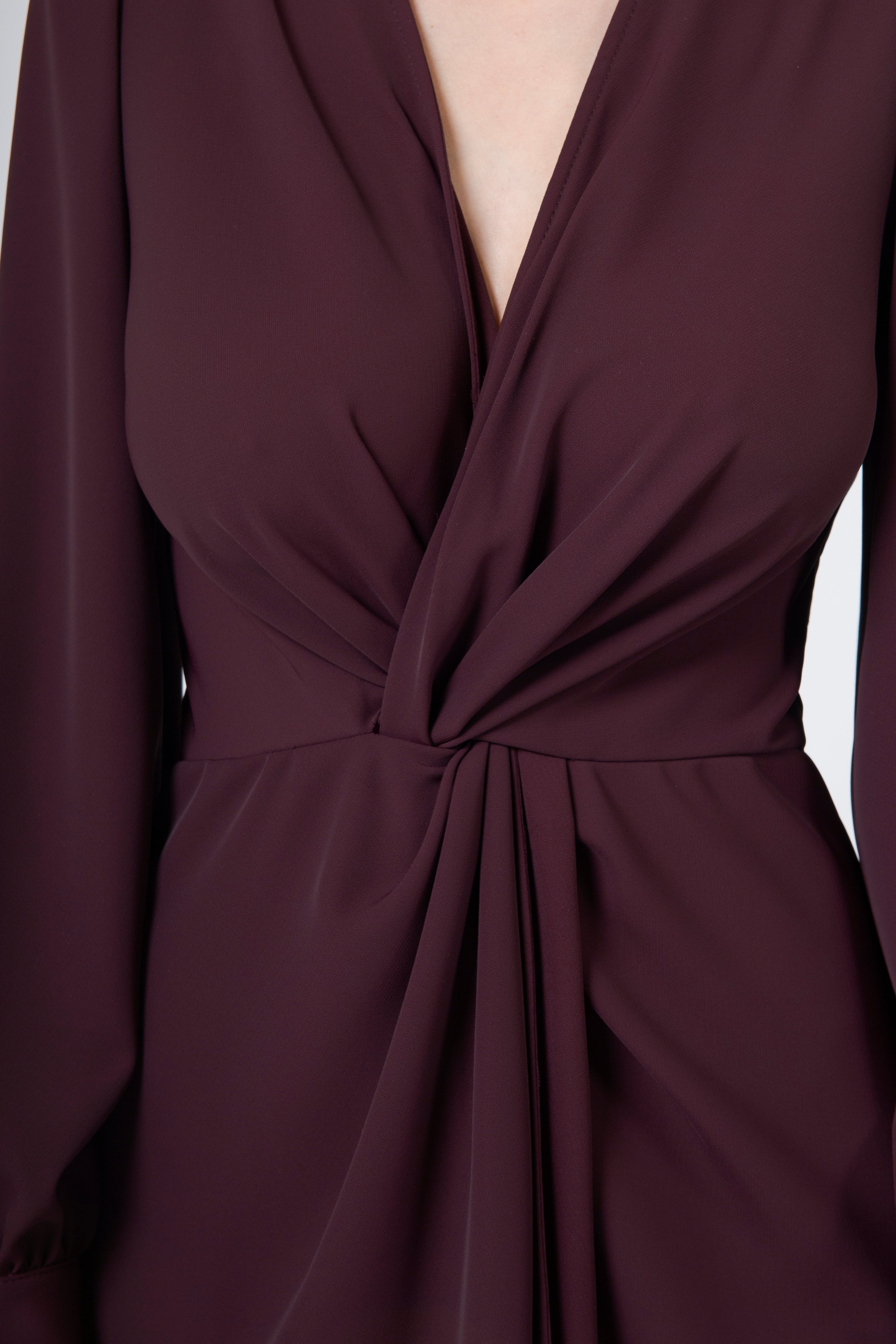 Il vero cuore dell’abito, però, è il nodo in vita: un dettaglio studiato per valorizzare la silhouette con maestria. Il nodo crea un punto focale che sottolinea la linea della vita, modella il busto e dona slancio alla parte inferiore dell’abito. Da esso si apre lo spacco frontale, un taglio deciso ma raffinato, che lascia intravedere la gamba con grazia e naturalezza. È un dettaglio che aggiunge dinamismo, femminilità e un pizzico di audacia senza mai risultare eccessivo.