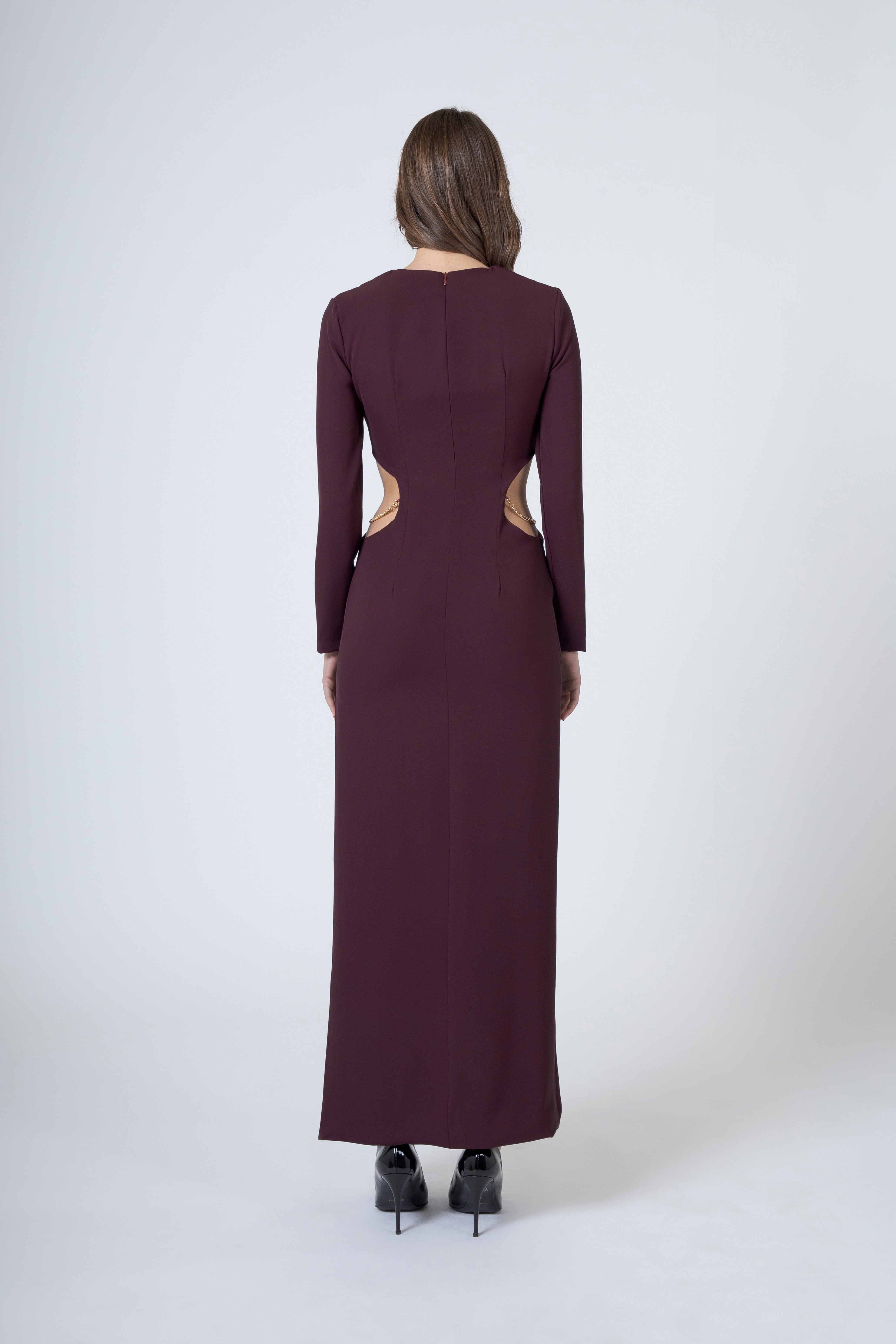 Immagina un abito che sembra nato da un sogno notturno, dove la luce si posa solo sui dettagli giusti, e l’aria stessa sembra piegarsi al movimento di chi lo indossa: così appare l’abito lungo a paricollo, manica lunga, con catene oro applicate sui cut-out ai fianchi.