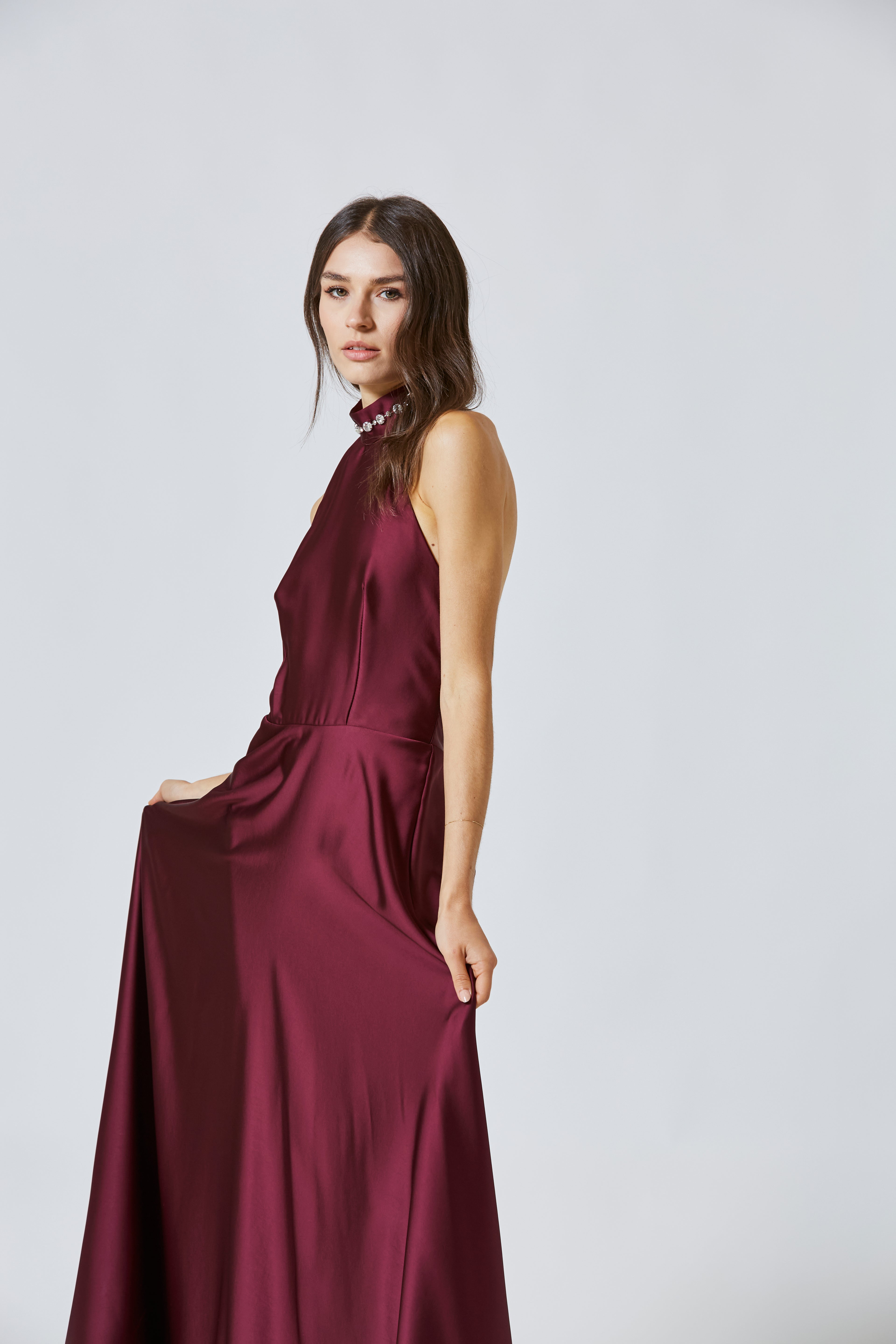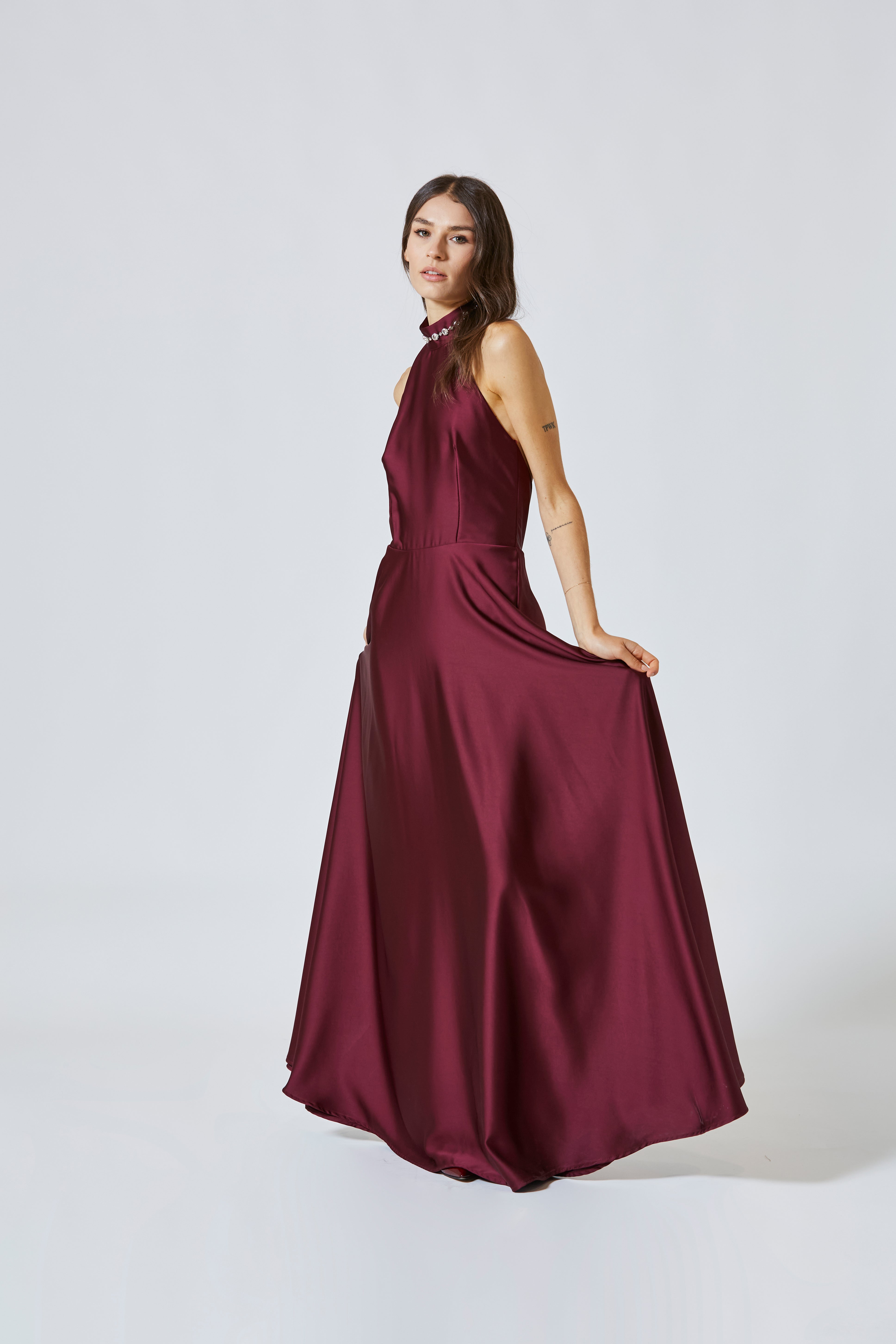 È l’abito lungo in raso con gioiello sul collo e schiena scoperta, capolavoro di sensualità raffinata, disegnato per una donna che sa che il vero lusso non è ostentazione, ma silenzio carico di significato.