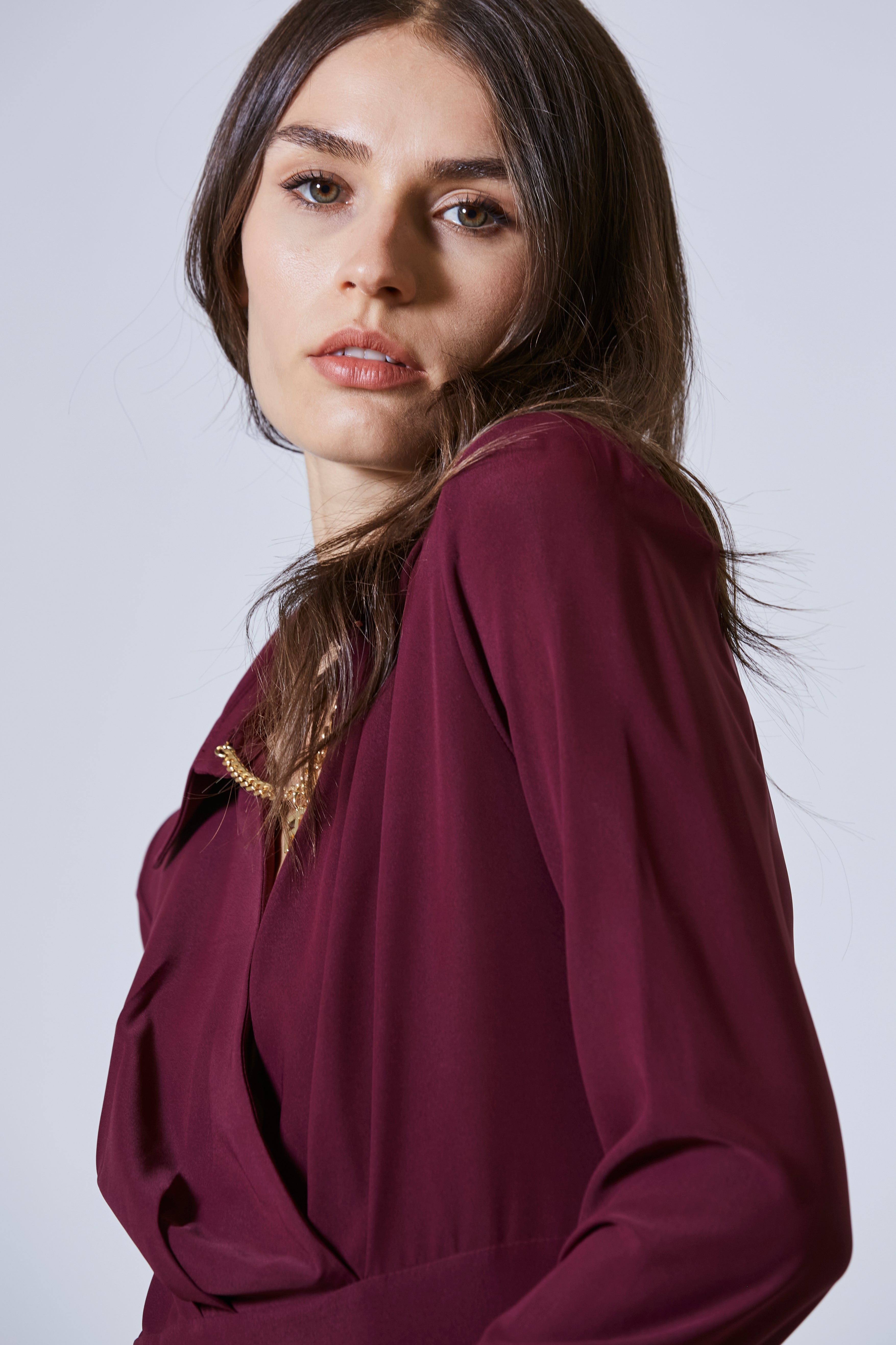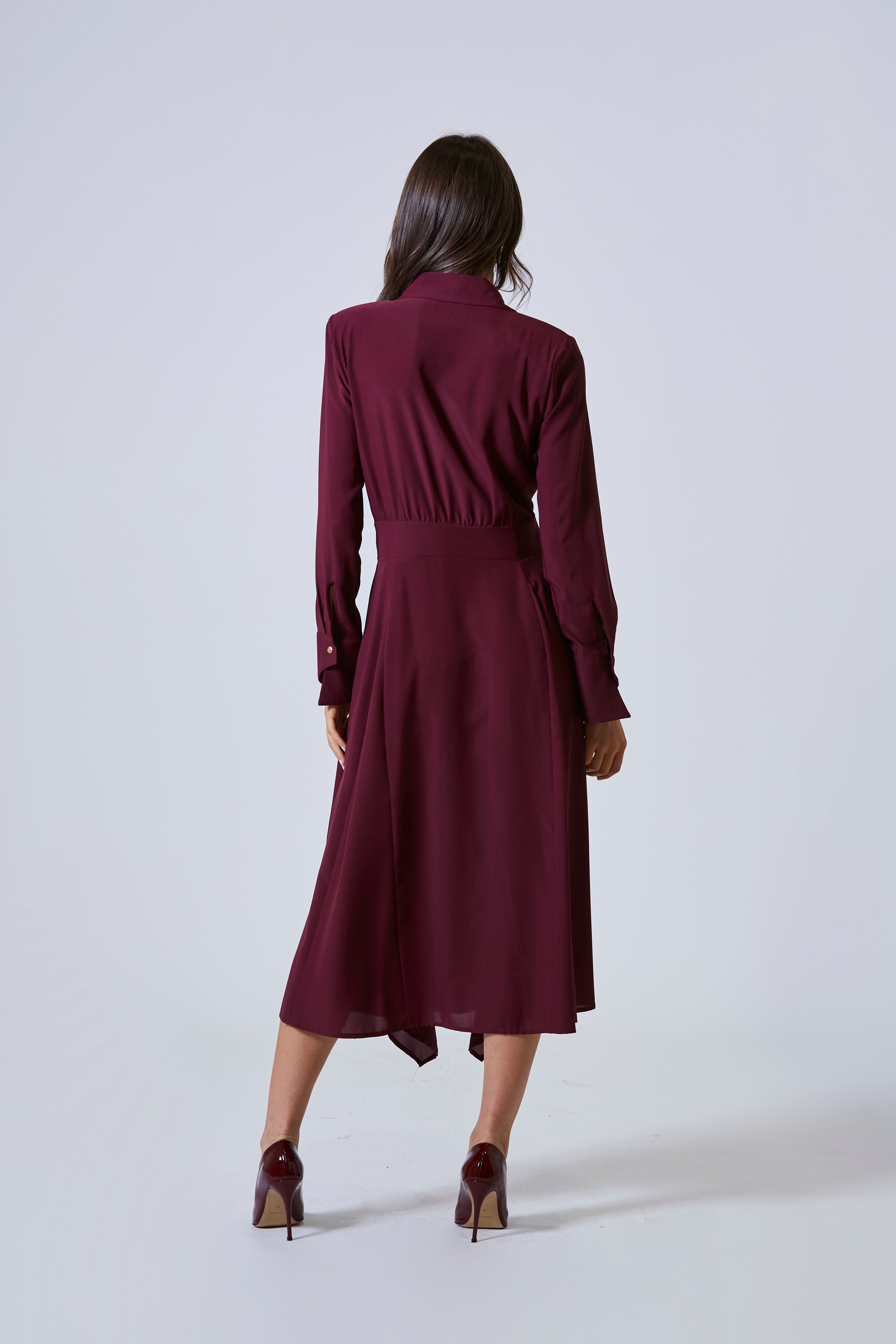 Lo scollo a V, profondo il giusto, incornicia il décolleté con grazia e carattere. Ma è il collo camicia, definito e sartoriale, a rompere la prevedibilità e aggiungere struttura, trasformando un abito fluido in un capo che unisce forza e delicatezza.