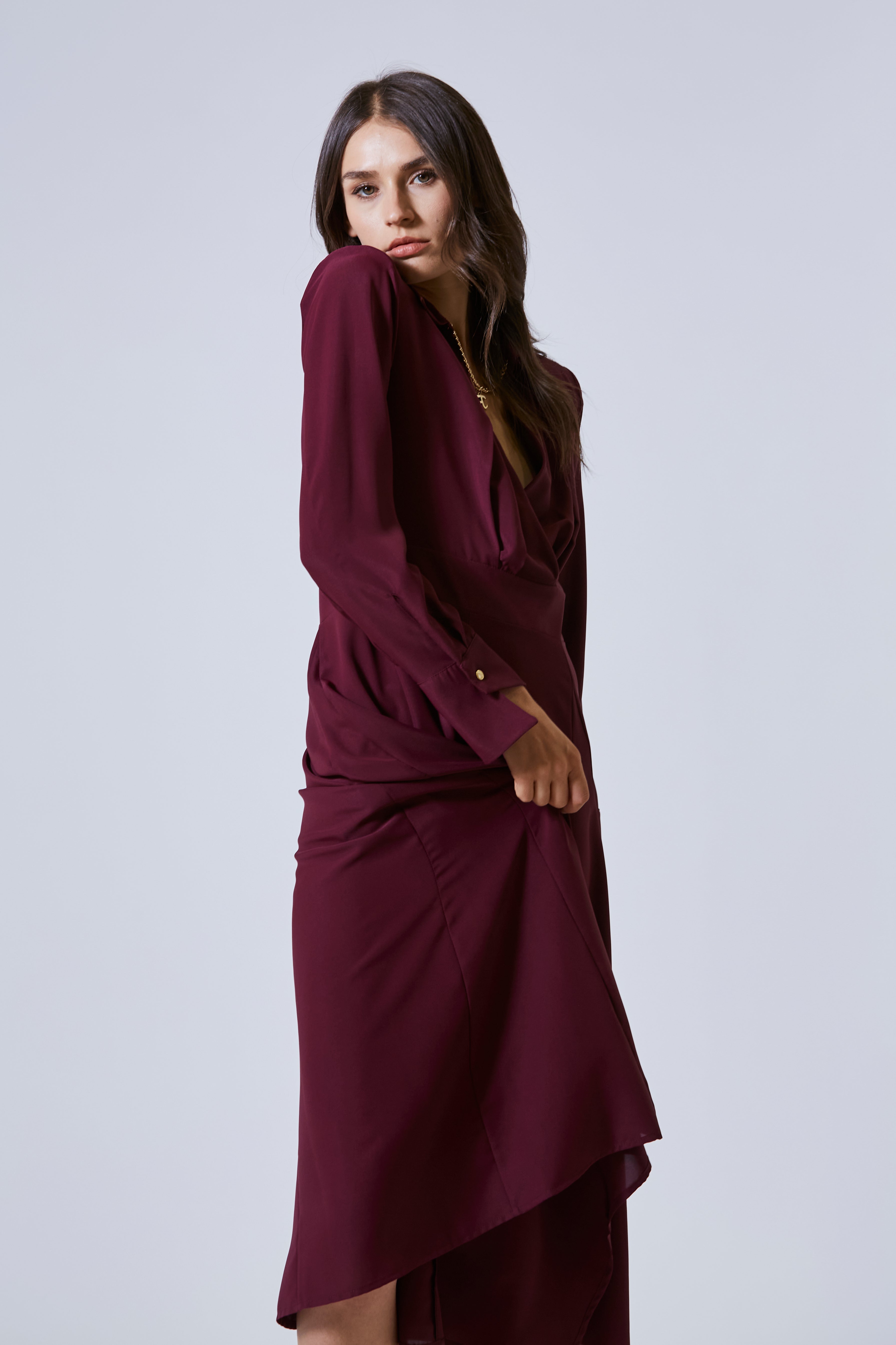 Realizzato in un tessuto leggero e scivolato, l’abito cade con naturalezza lungo le curve del corpo, disegnando una silhouette sofisticata, libera, viva. La lunghezza midi è perfettamente bilanciata: moderna ma senza tempo, raffinata senza essere rigida. Il movimento del tessuto accompagna i tuoi, sfiorando le gambe con discrezione, mentre la gonna asimmetrica regala ritmo e leggerezza — come se l’abito stesso fosse sempre sul punto di iniziare una danza.