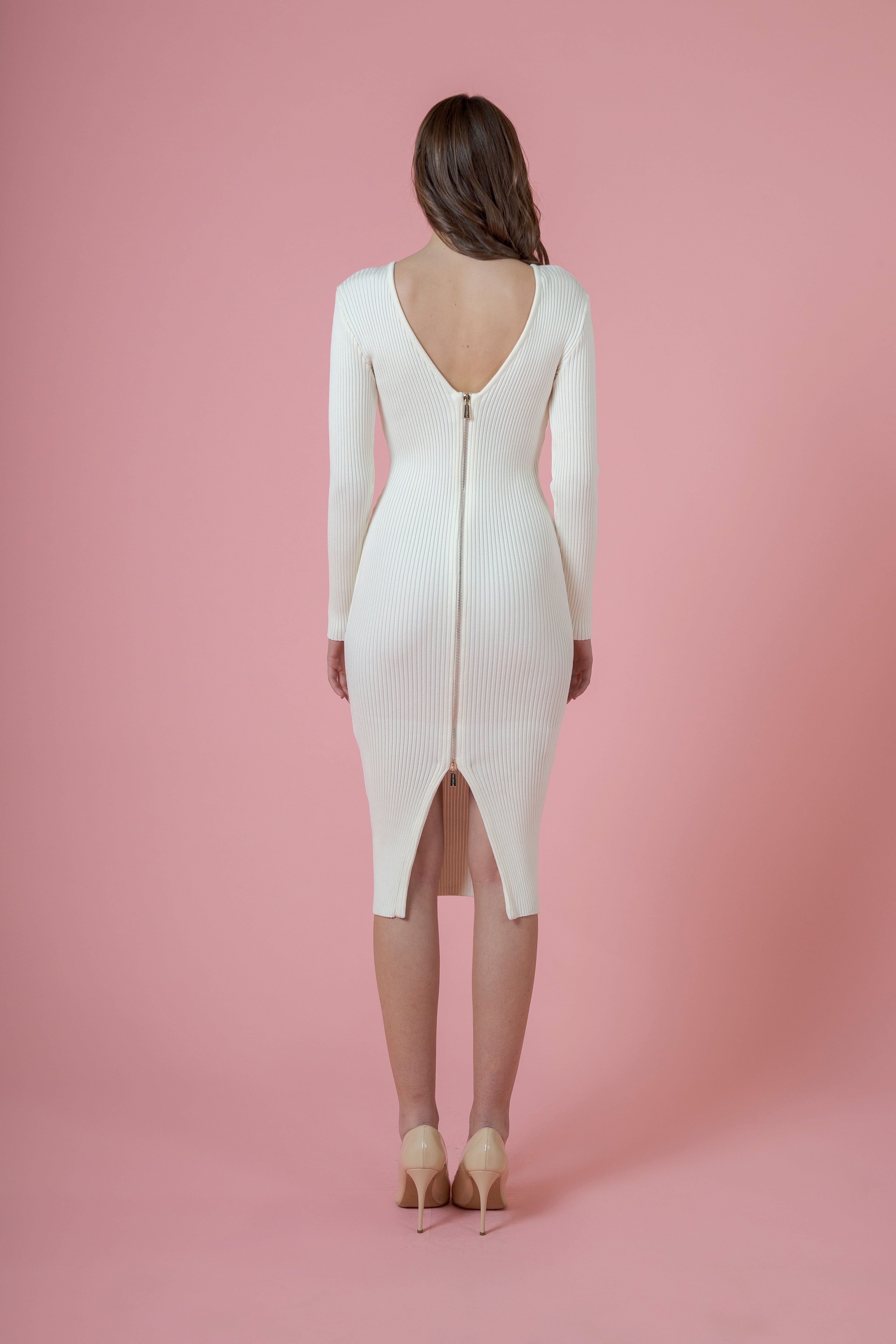 La maglia a costine, compatta ma morbida, avvolge il corpo con una naturalezza sorprendente, seguendone le linee senza costringerle. Ogni movimento diventa un gioco di luci ed ombre, un ondeggiare elegante che valorizza la figura e dona slancio. La lunghezza dell’abito amplifica questo effetto: scende dritto, pulito, raffinato, creando una verticalità che slancia e affina, quasi come se il tessuto fosse un’estensione armoniosa della pelle.