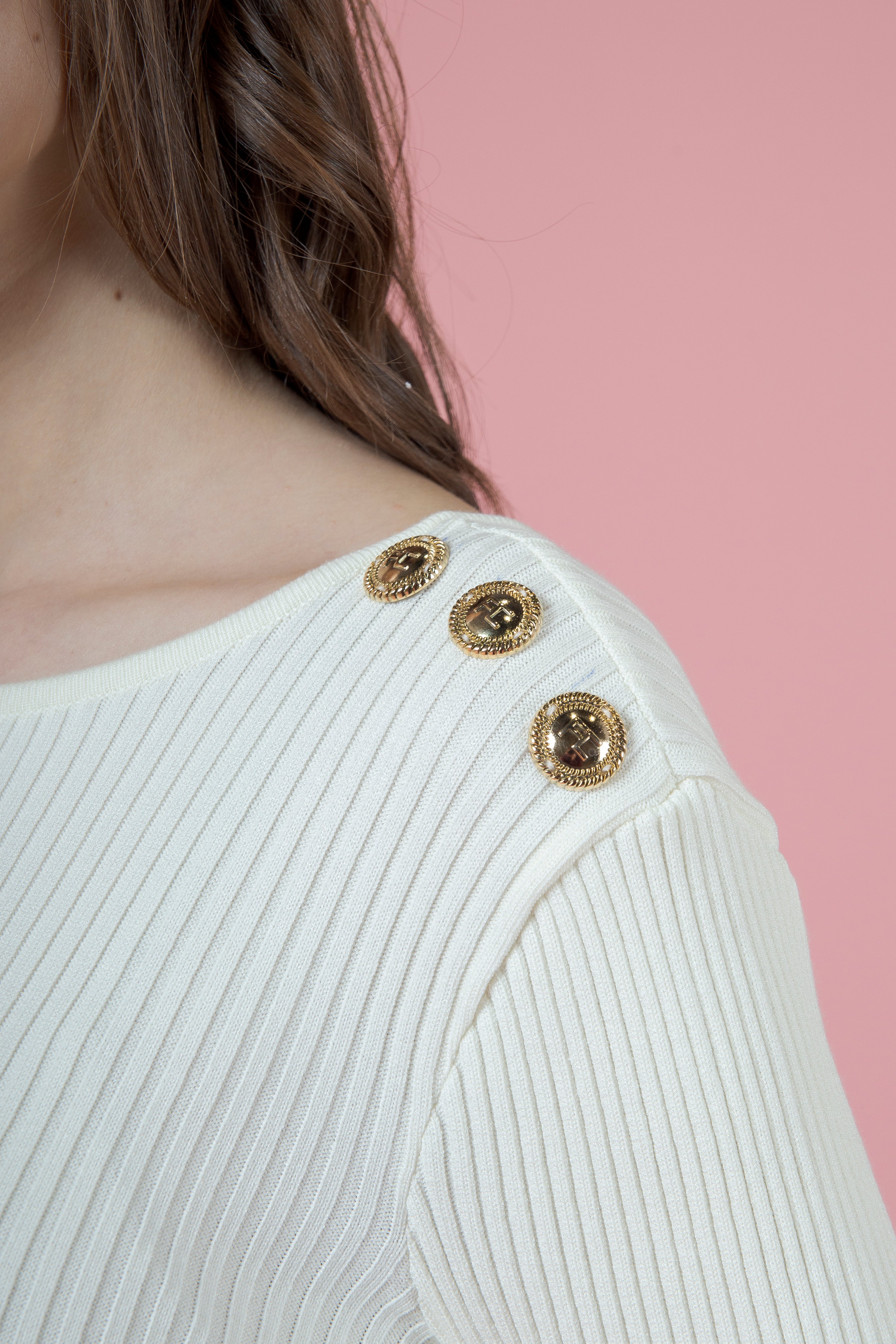 I bottoni oro, firma inconfondibile di Flavio Castellani, completano la visione con un tocco di lusso misurato. Sono come minuscoli gioielli applicati al tessuto, piccoli accenti luminosi che impreziosiscono la maglia, rivelando la cura estrema per il dettaglio e per la bellezza.