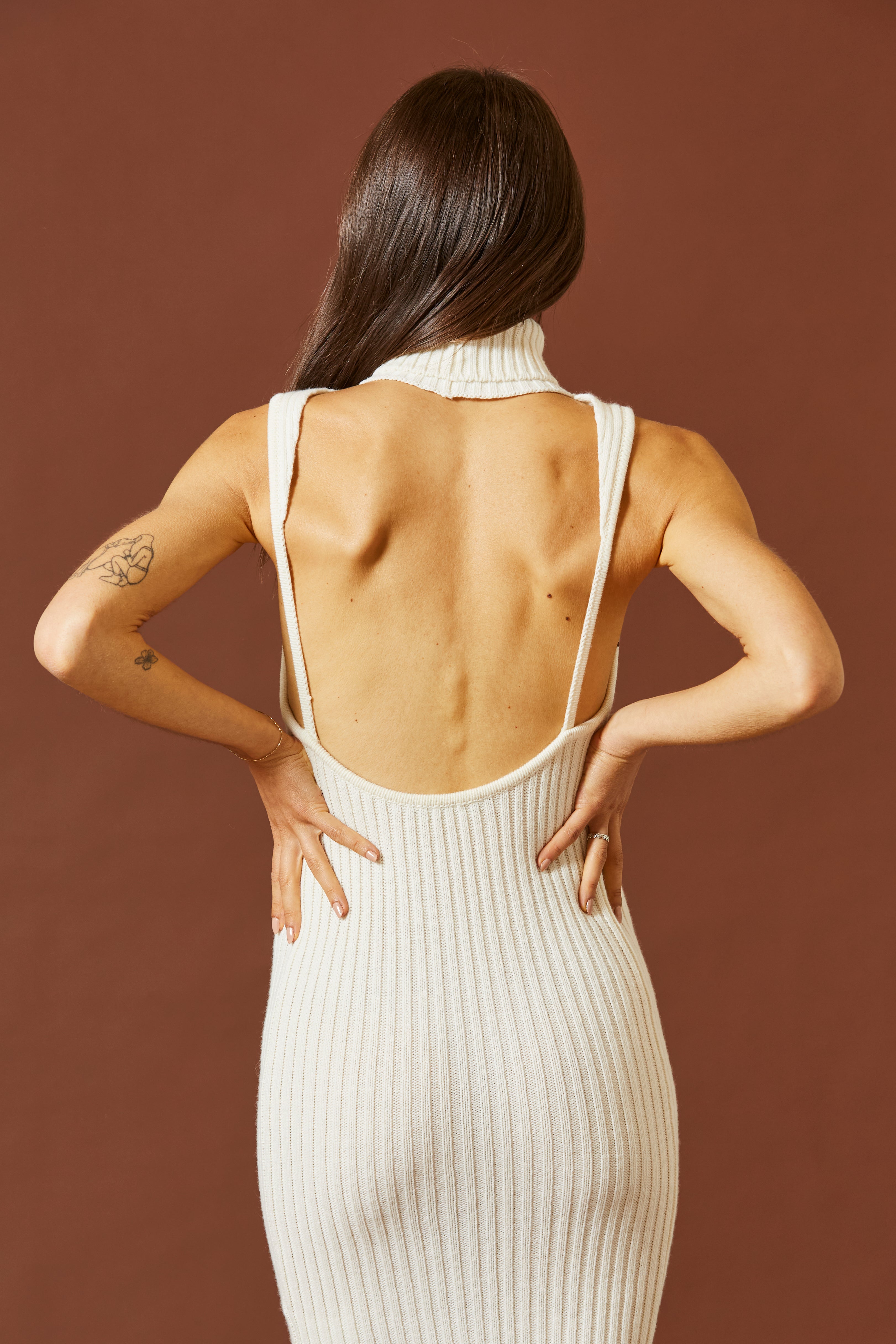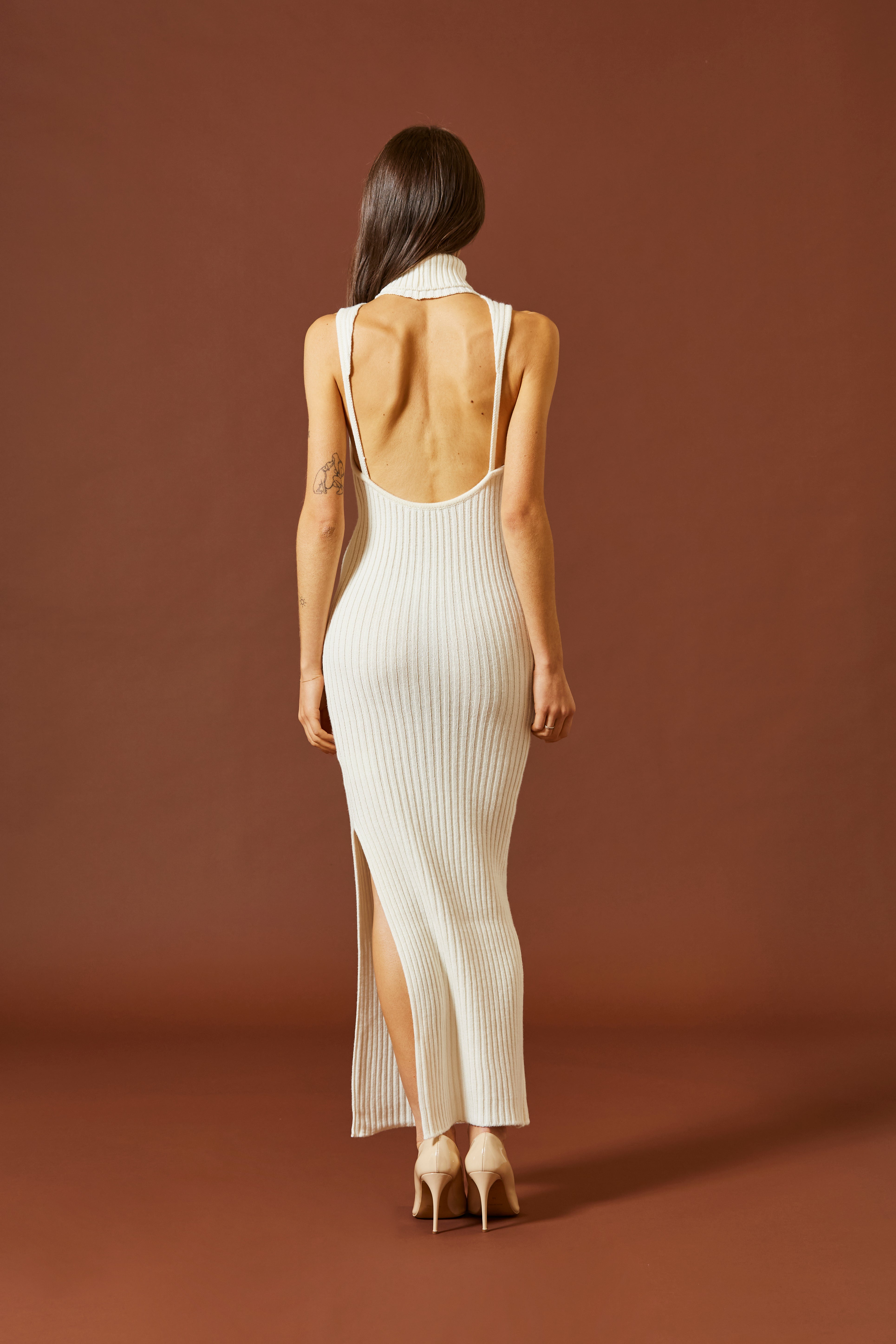 Lungo, elegante, intessuto da maglia a coste che disegnano dolcemente il corpo, avvolgendolo con una delicatezza quasi carezzevole.