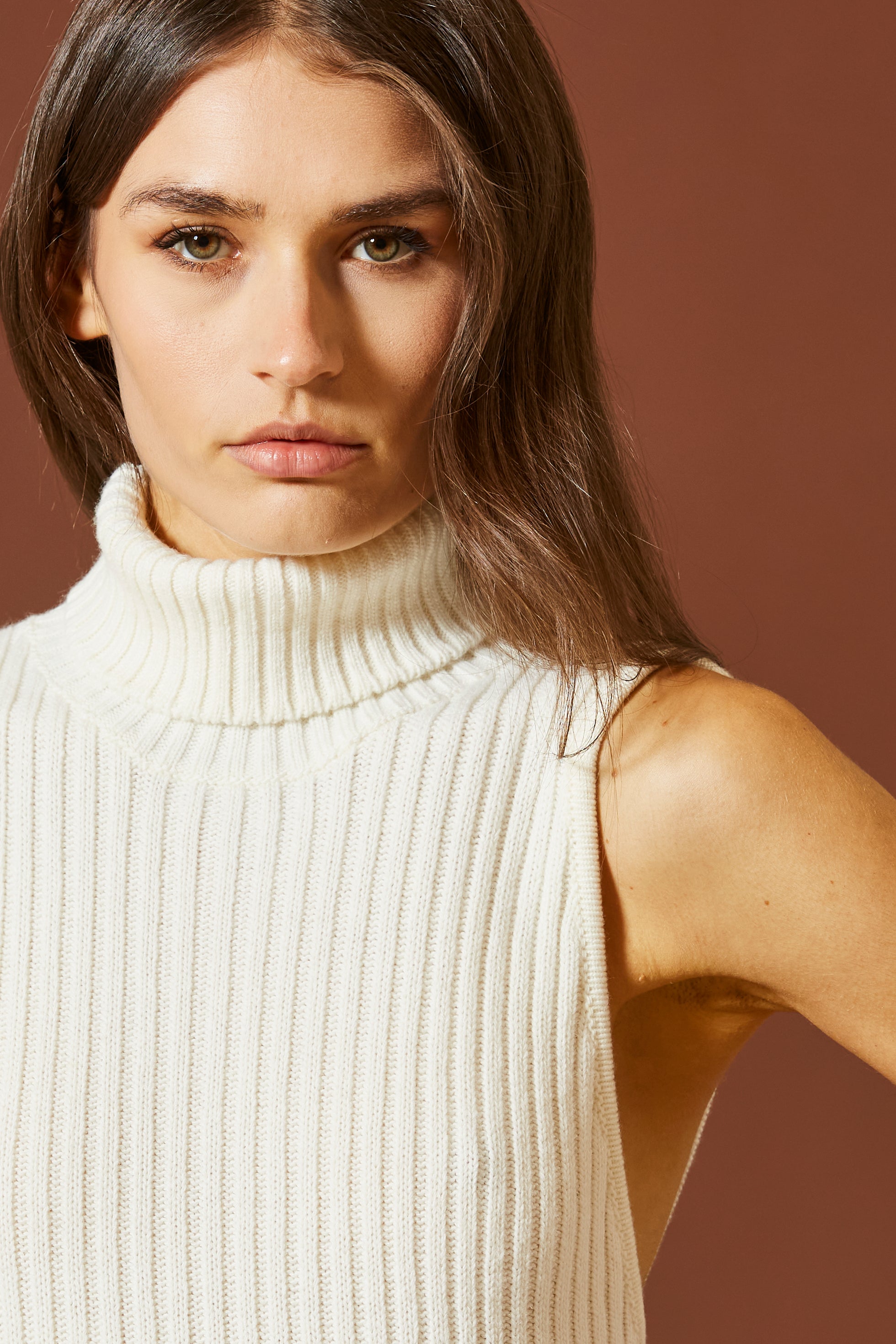 Quel dettaglio leggero, elegante, diventa il cuore pulsante del capo, un contrasto delicato con la trama avvolgente della maglia, un dialogo sottile tra presenza e assenza.
