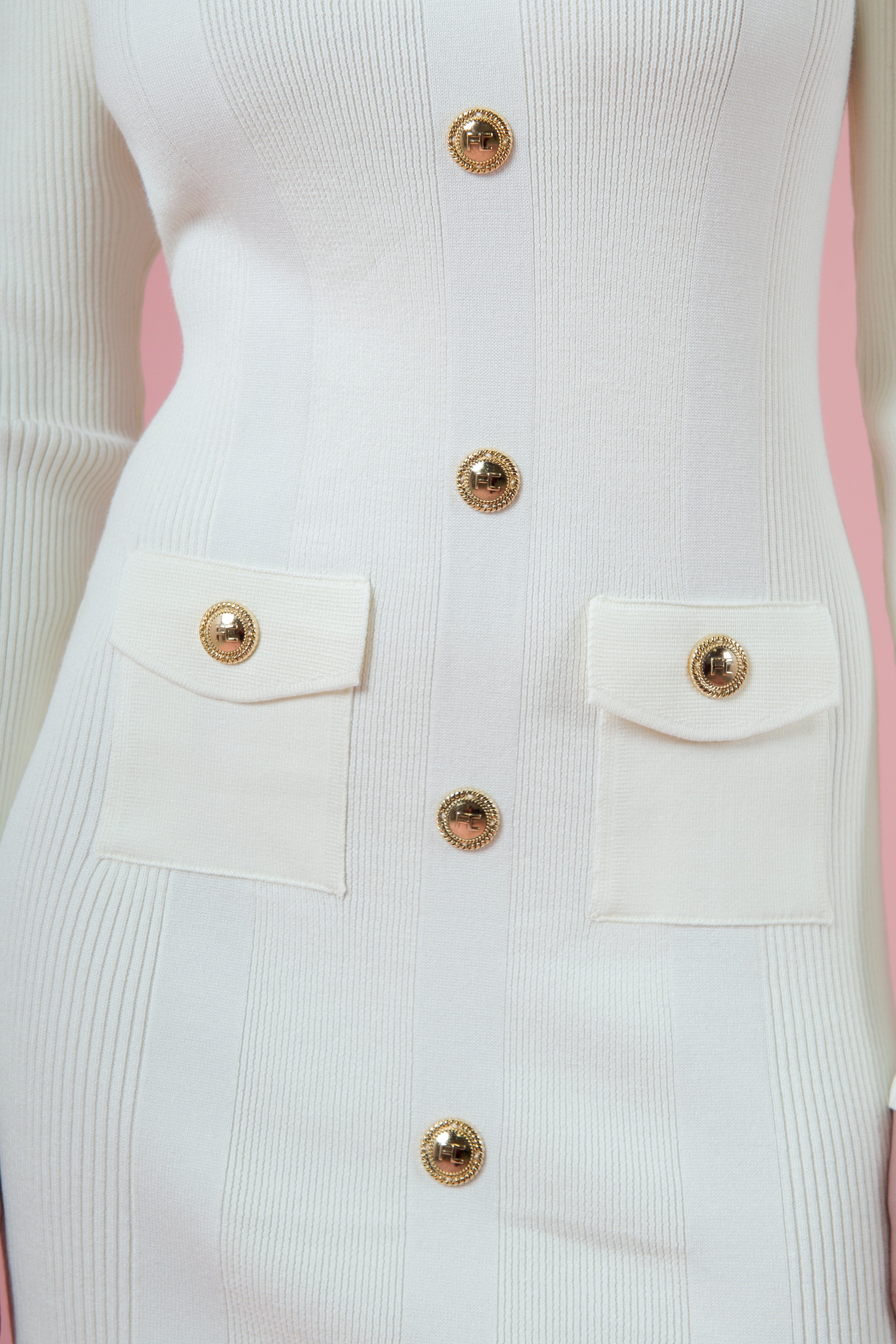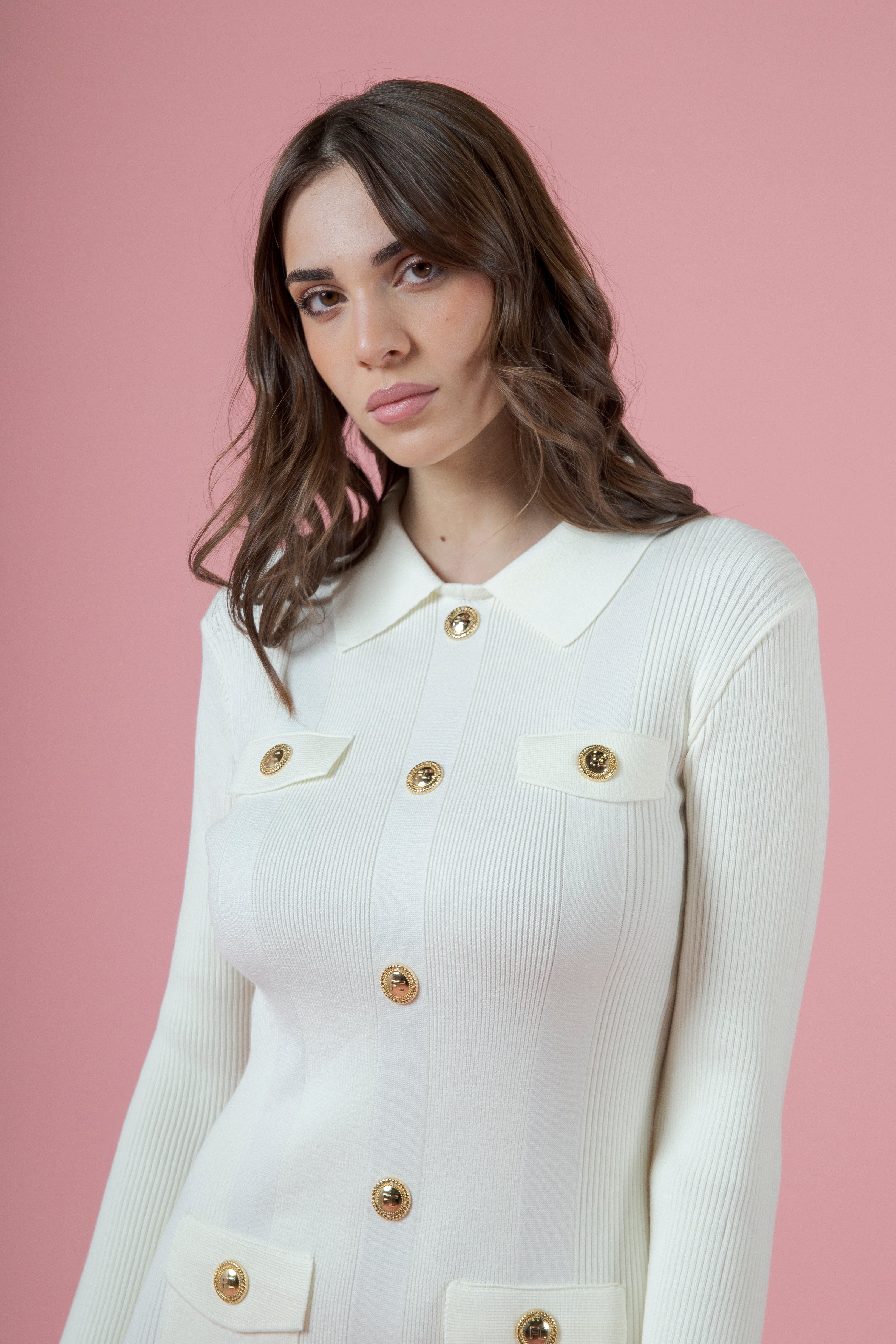 Sul davanti, due taschine si posano come piccoli accenti di stile, morbidi e preziosi, pronte a catturare gli sguardi senza mai rubare la scena. E a illuminarle, come gioielli incastonati nella trama, brillano i bottoni oro Flavio Castellani: piccoli soli che punteggiano il tessuto, dettagli luminosi che trasformano un abito semplice in un capo dal fascino magnetico. Ogni bottone riflette la luce come se custodisse una storia, un gesto, una promessa di eleganza.
