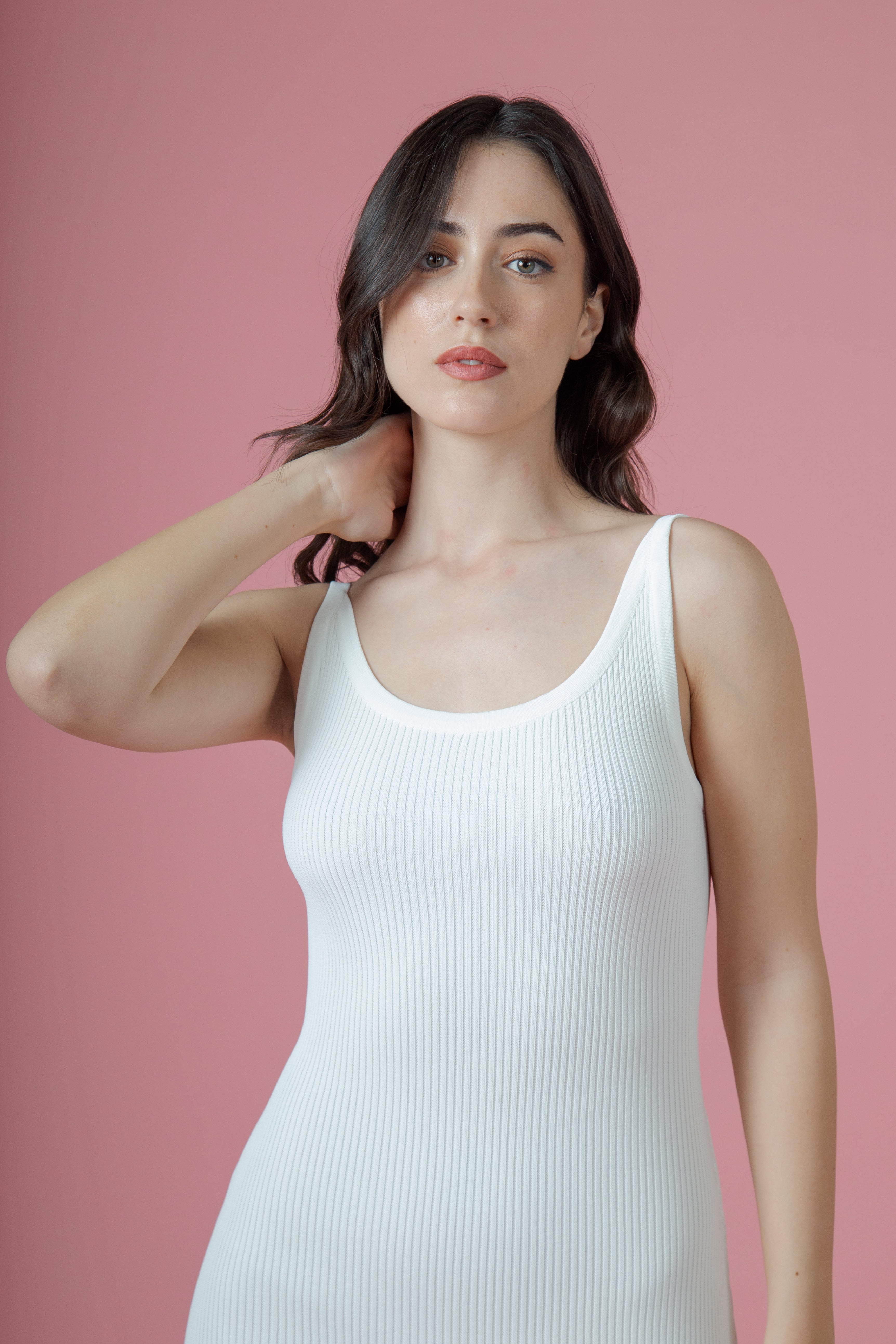 È un abito che sembra nascere da un gesto lento e consapevole, come se fosse stato pensato per accompagnare il corpo e raccontarlo, più che semplicemente vestirlo. La maglia a costine in viscosa si posa sulla pelle con una morbidezza fluida, quasi liquida, seguendo ogni curva con naturalezza, senza mai costringere, ma esaltando con discrezione la silhouette. È un tessuto che respira, che si muove insieme a chi lo indossa, creando un dialogo continuo tra forma e movimento.