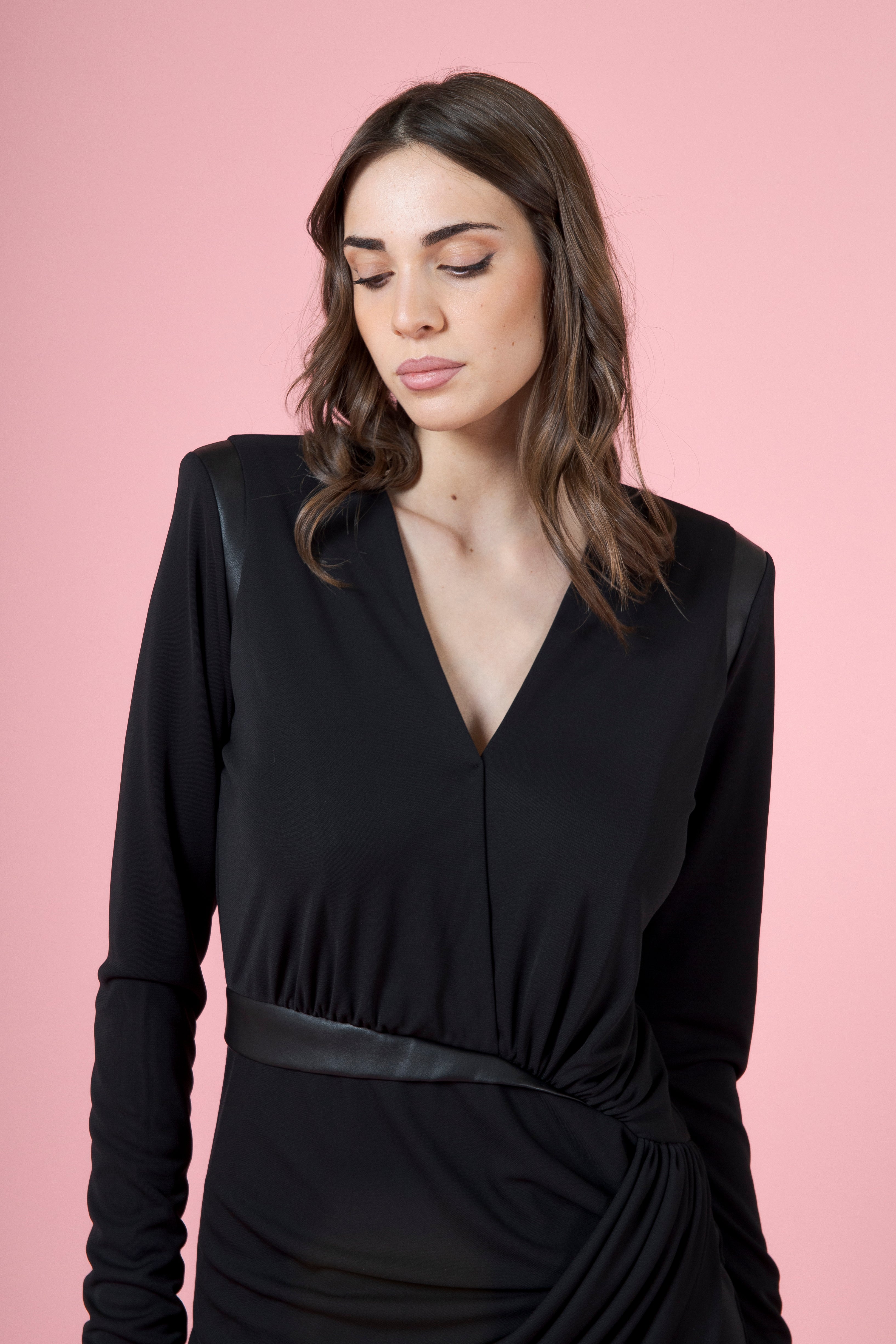 È un tubino che sembra nato per raccontare storie silenziose di eleganza e sicurezza, un capo che avvolge la figura come un abbraccio discreto, sottolineando senza ostentazione ogni curva con la delicatezza di un sussurro. Il tessuto elasticizzato segue il corpo con naturalezza, come se fosse nato insieme a chi lo indossa, modellandosi ad ogni movimento senza costringere, ma esaltando armonia e proporzioni.