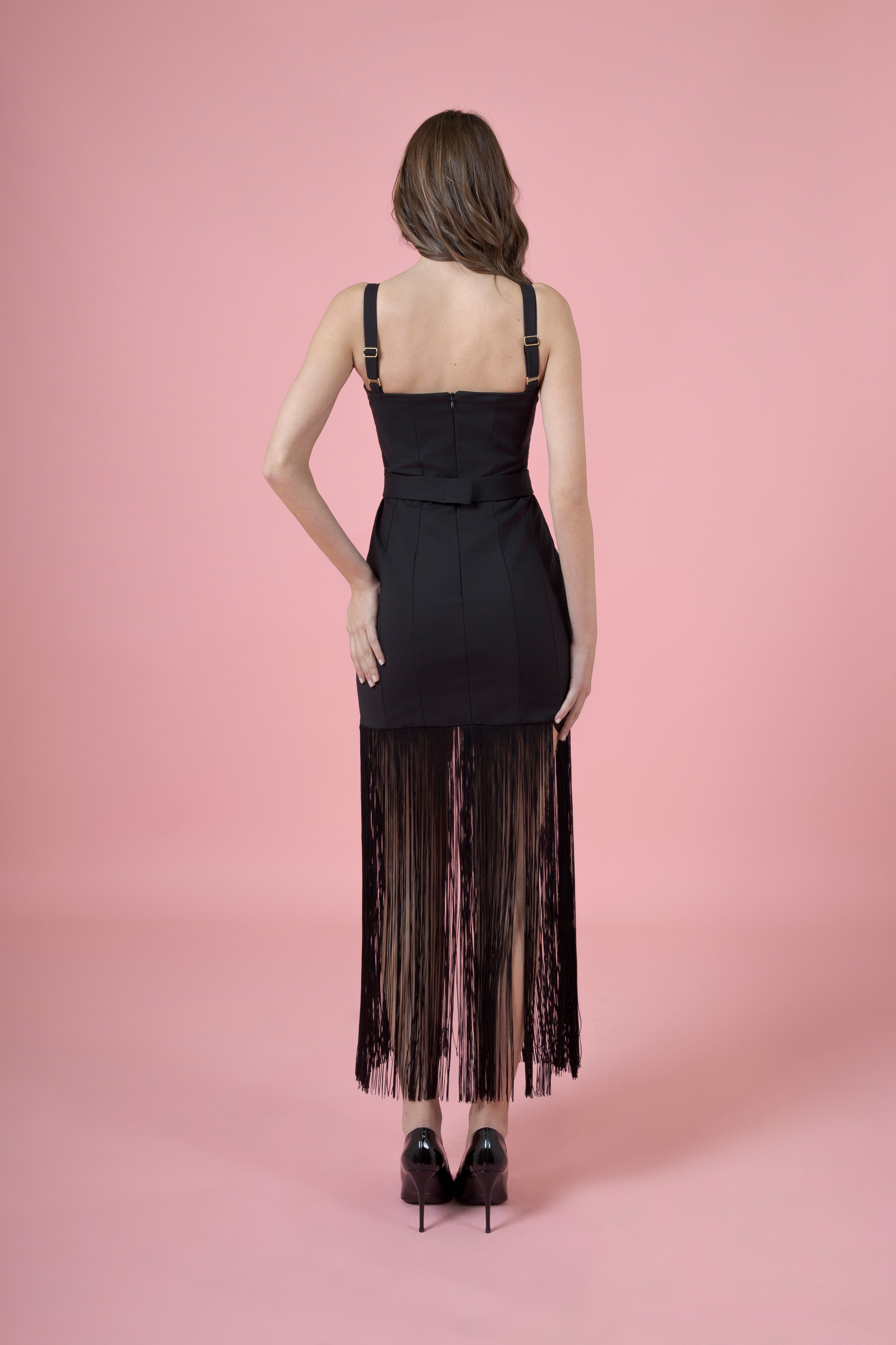 Un tubino che sembra nascere dal respiro stesso della notte: linee essenziali, scolpite come un sussurro sulle curve del corpo, e poi quelle frange lunghe, che scendono in profilo lungo la gonna come pioggia di seta, vibrazioni leggere pronte a seguire ogni passo, ogni gesto, ogni pensiero non detto.