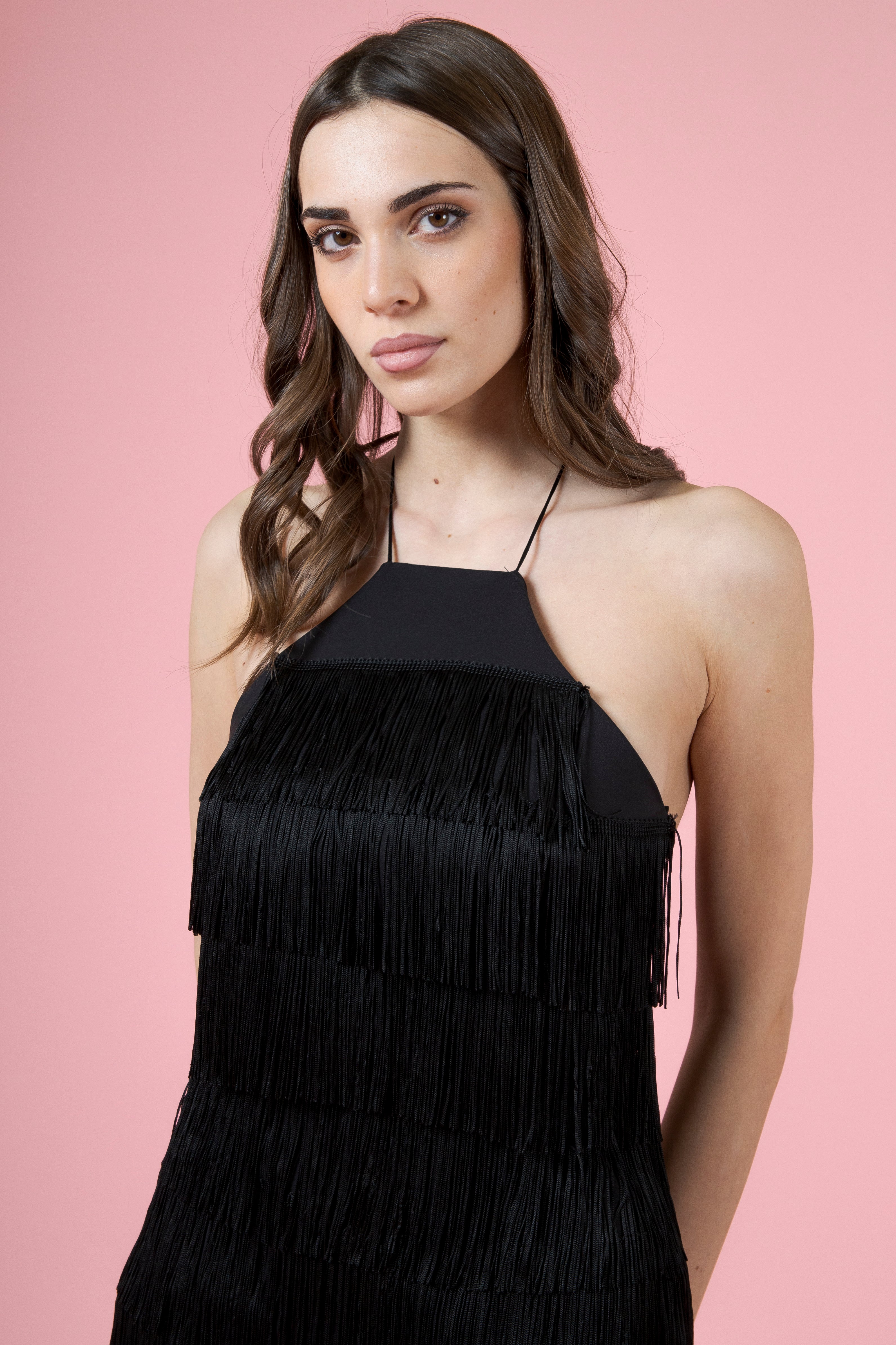 Il tubino sfiora la silhouette con grazia decisa, seguendo le linee del corpo come una melodia che sa dove posarsi. Ma sono le frange le vere protagoniste: scendono in cascate leggere, filamenti luminosi che si muovono ad ogni passo, ad ogni respiro, ad ogni battito del cuore. Onde di tessuto che sembrano vive, che danzano anche quando tu resti ferma, che catturano la luce e la trasformano in movimento puro.