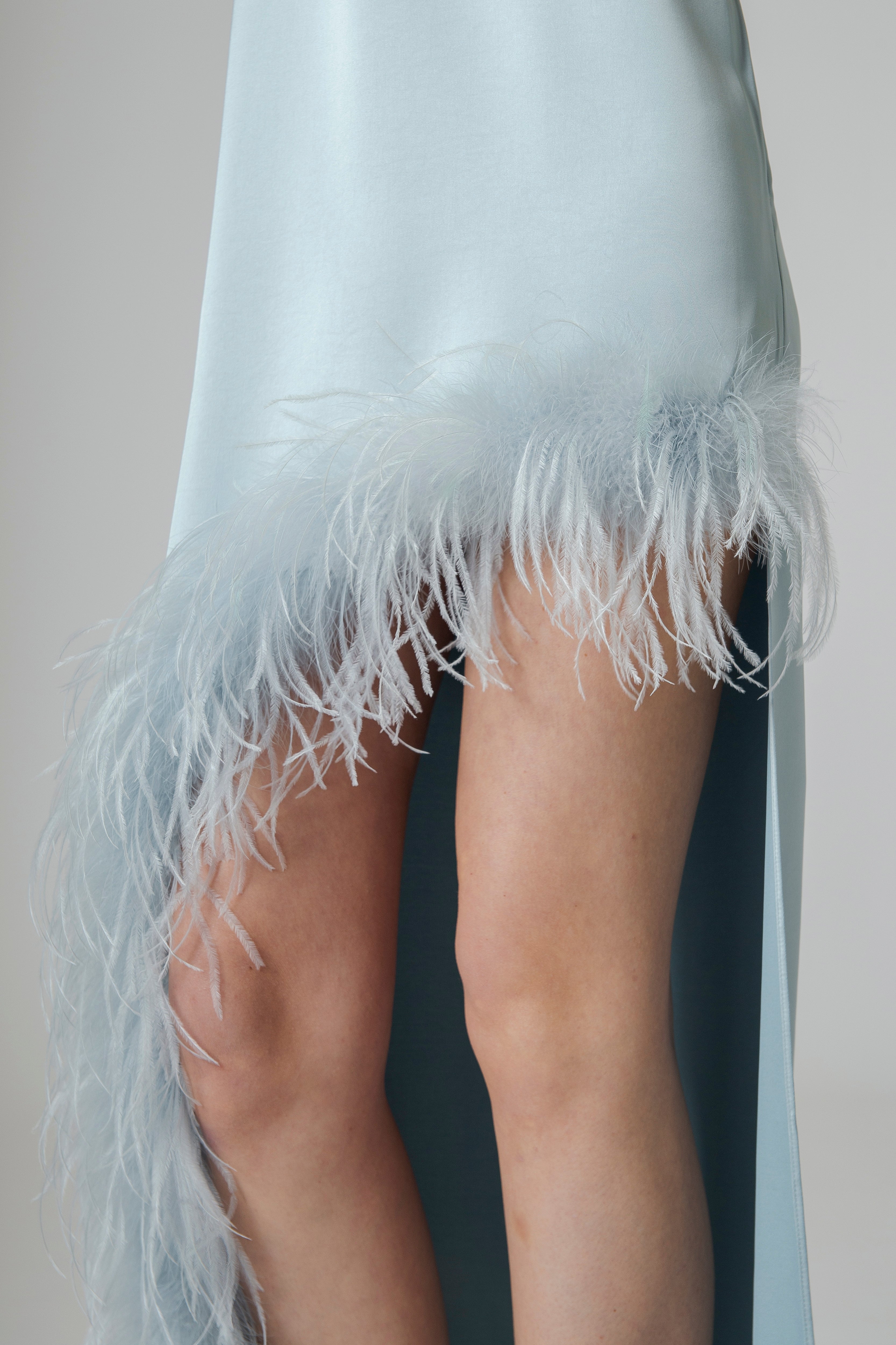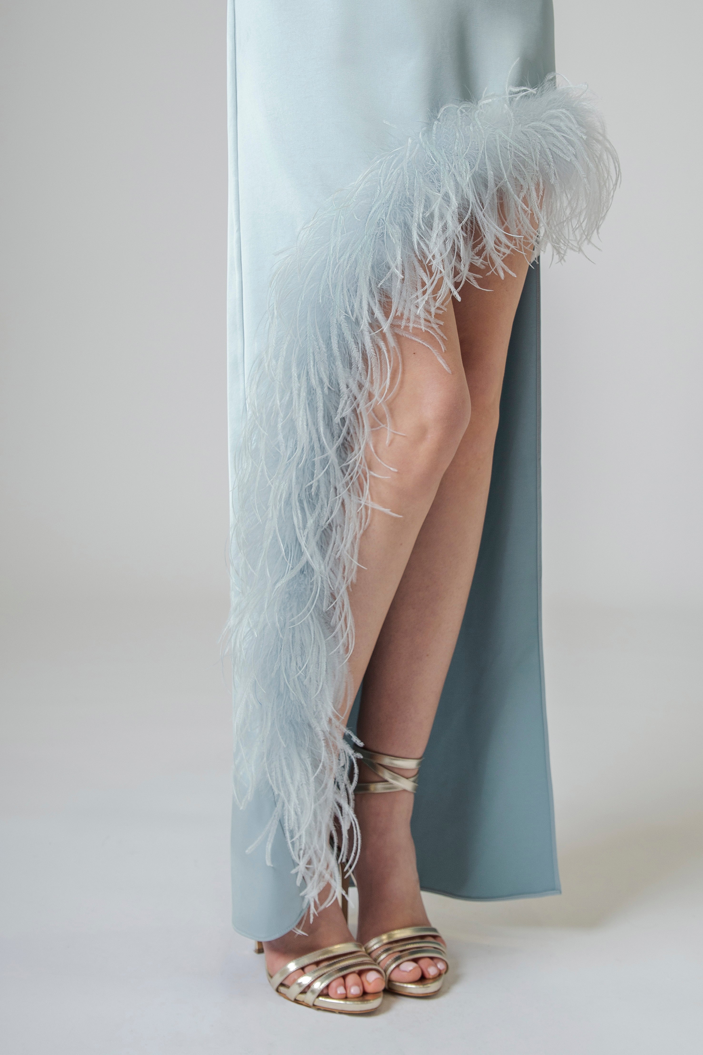 A impreziosire il bordo della gonna troviamo un profilo di piume, leggero e raffinato. Le piume accarezzano il movimento del tessuto, creando un effetto etereo e delicato. Ad ogni passo si muovono con grazia, donando all’abito una dimensione quasi teatrale, fatta di leggerezza e fascino.