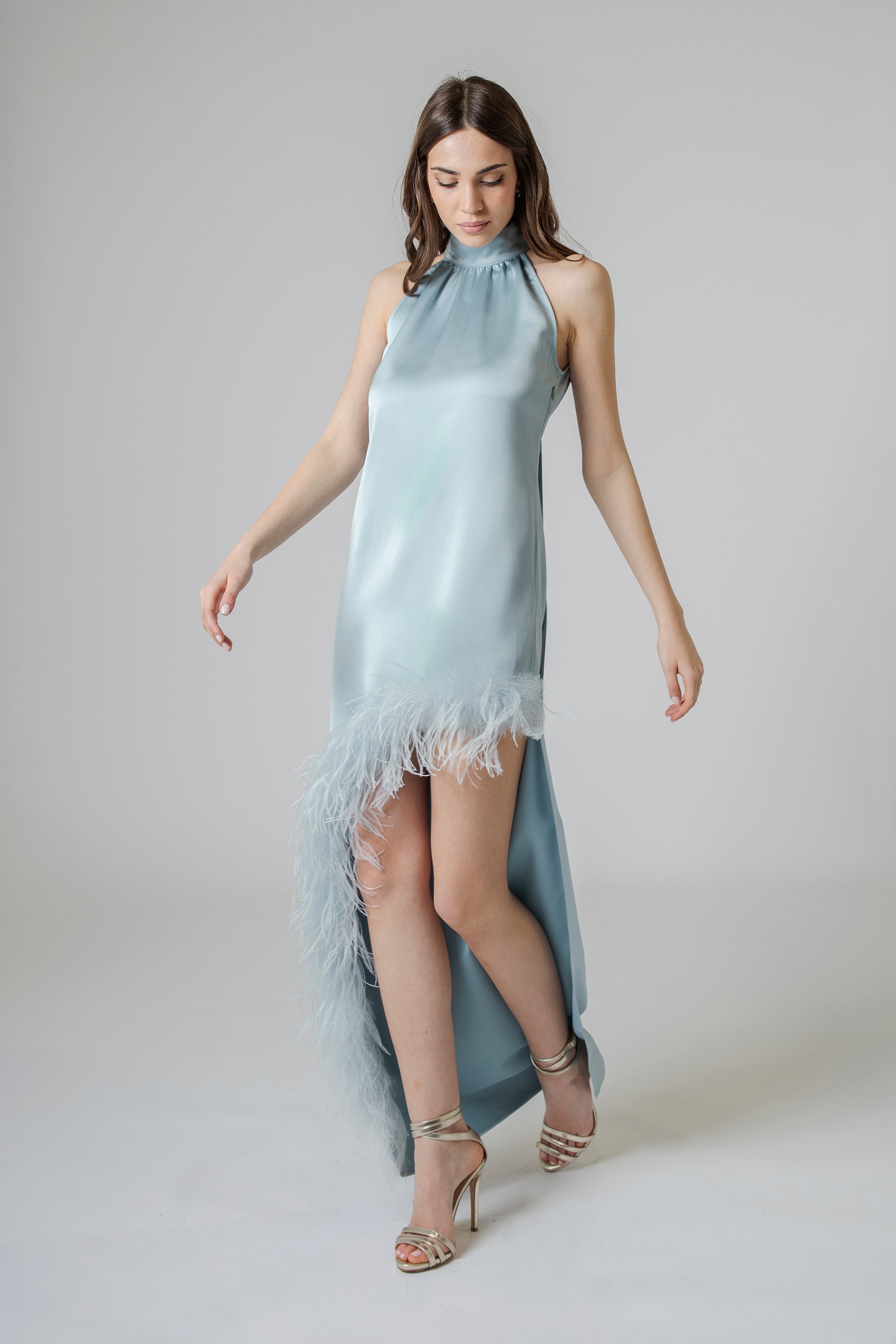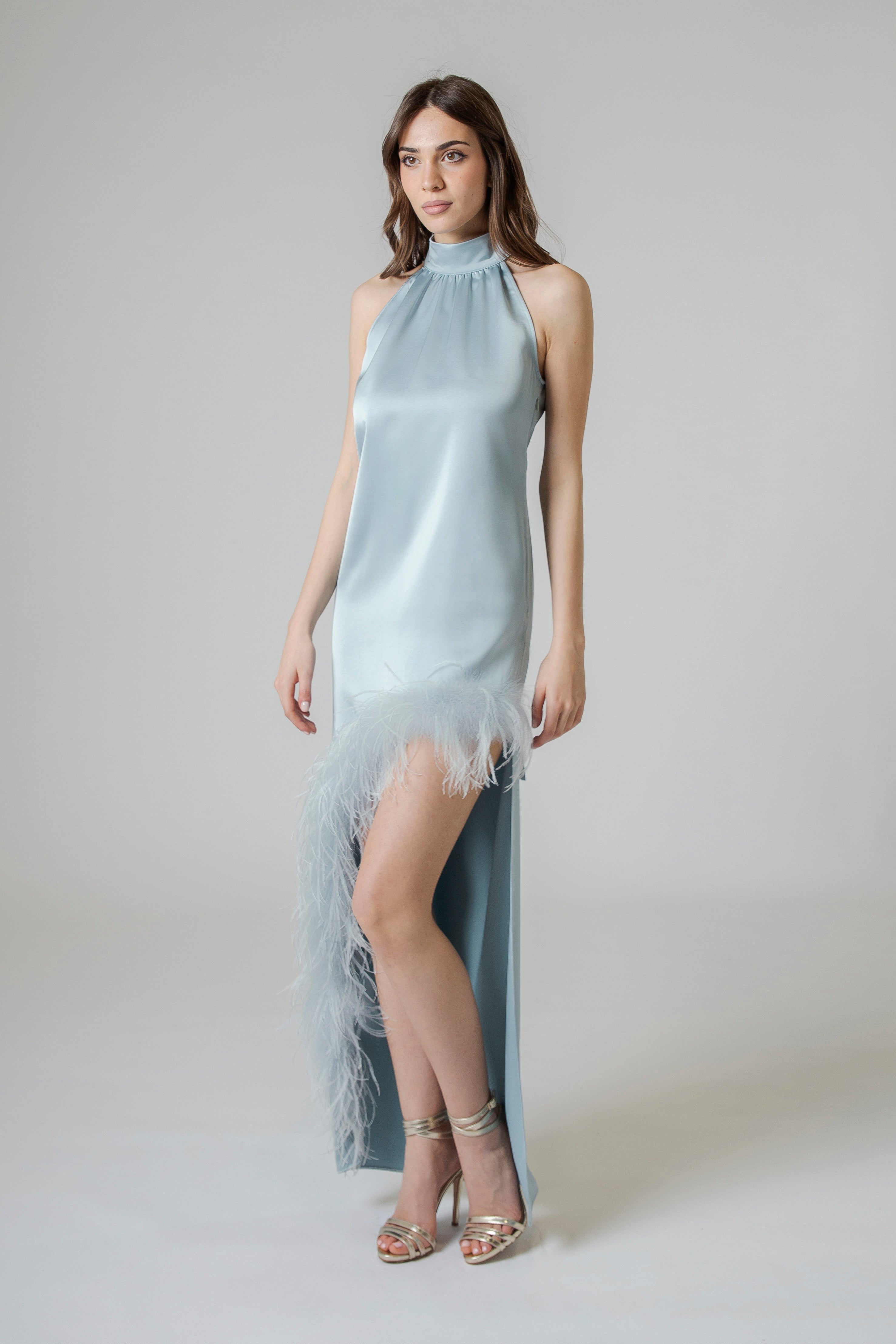 Il raso con cui è realizzato è morbido, fluido e luminoso. La sua superficie liscia riflette la luce con delicatezza, creando riflessi setosi che cambiano ad ogni passo. Il tessuto scivola sul corpo con naturalezza, seguendo la silhouette come una seconda pelle e donando al capo un aspetto estremamente sofisticato.