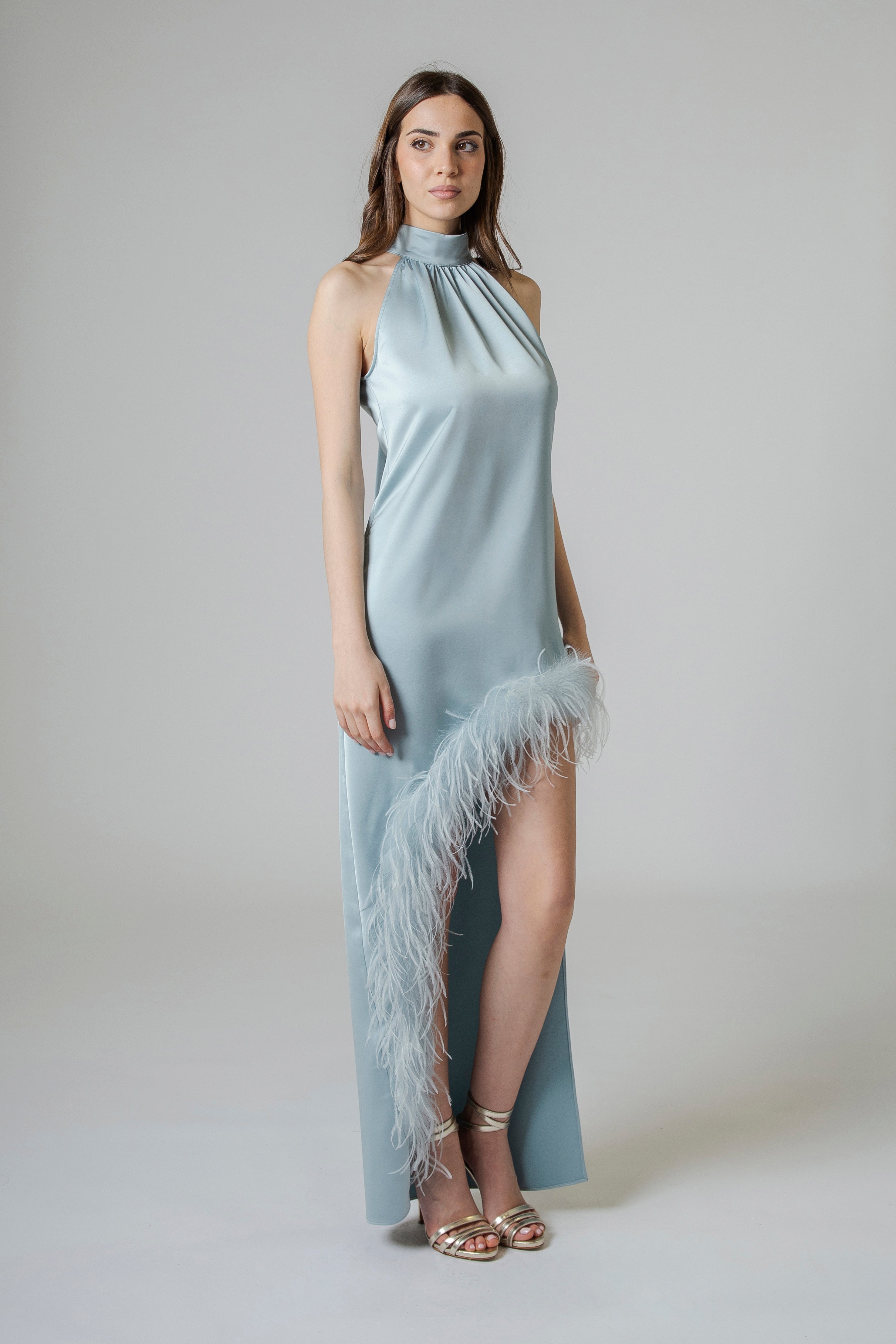 Il risultato è un abito lungo in raso dal fascino magnetico, dove il collo all’americana, la gonna asimmetrica con profilo di piume e la fusciacca che scende lungo la schiena si fondono in una creazione femminile, sensuale e incredibilmente raffinata. Un abito pensato per momenti speciali, capace di trasformare ogni passo in un gesto di pura eleganza.
