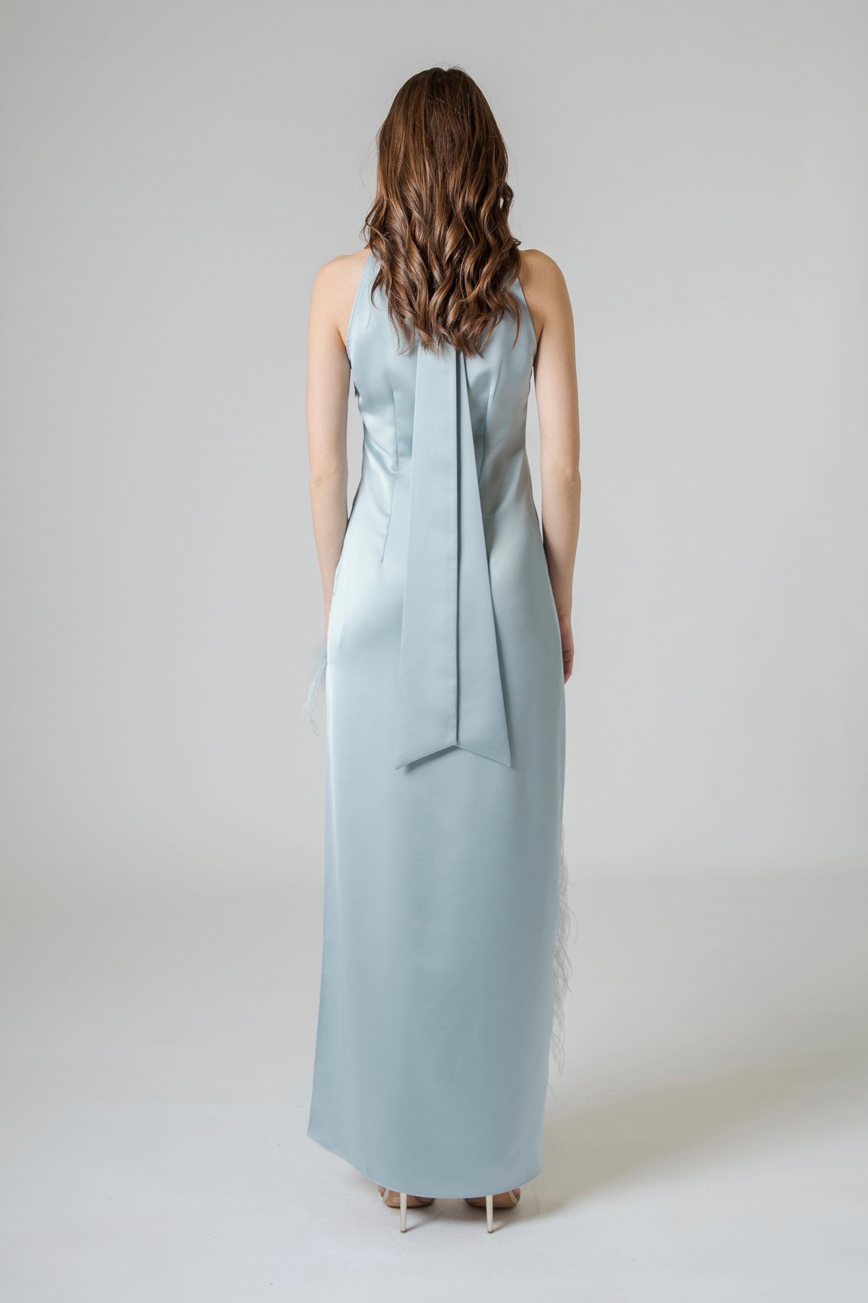 Sul retro, il design si completa con una fusciacca che scende lungo la schiena, un dettaglio elegante e fluido che aggiunge ulteriore movimento alla silhouette. Il nastro scivola morbido lungo la schiena, seguendo il passo con naturalezza e creando un effetto visivo raffinato e sofisticato.
