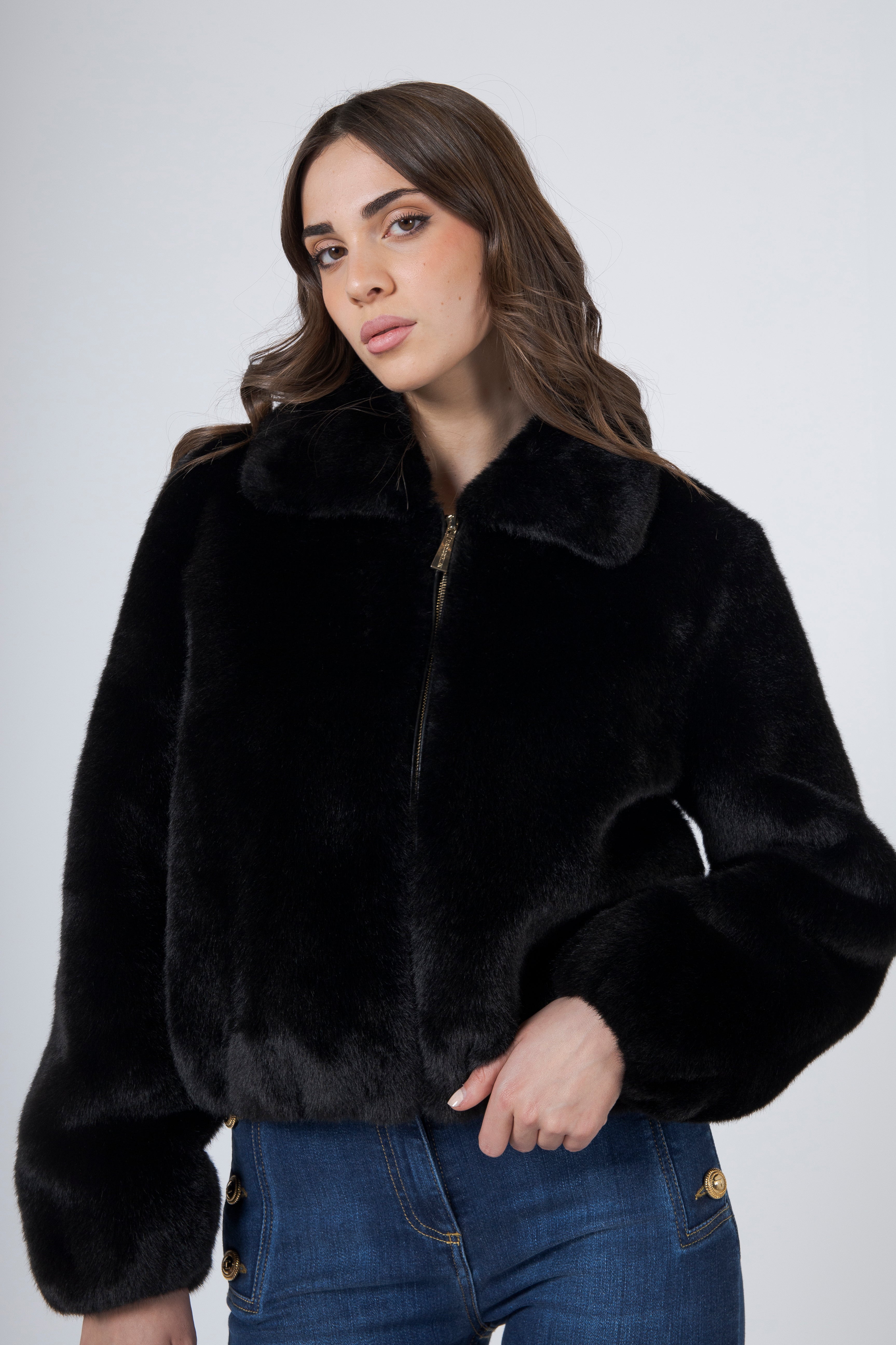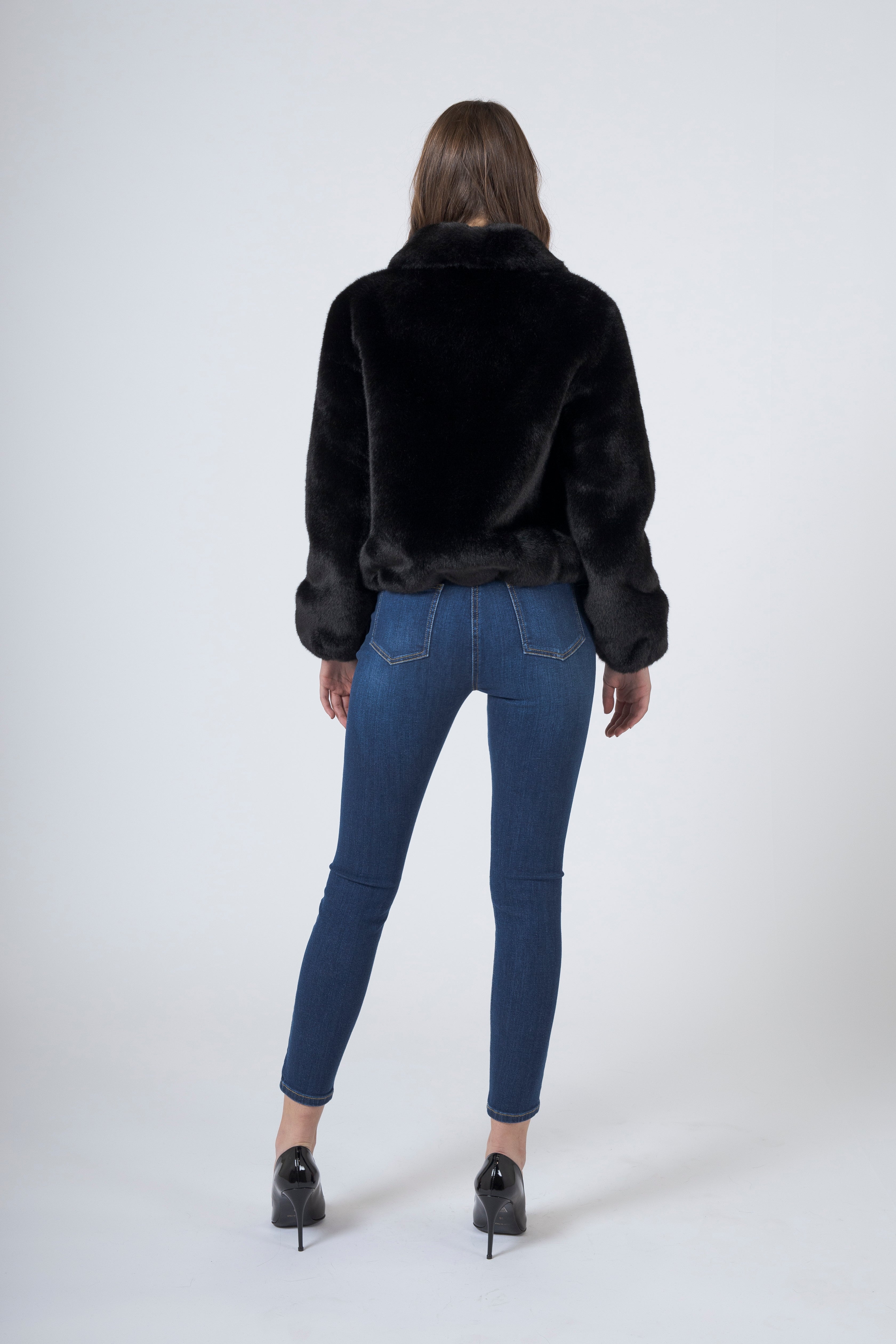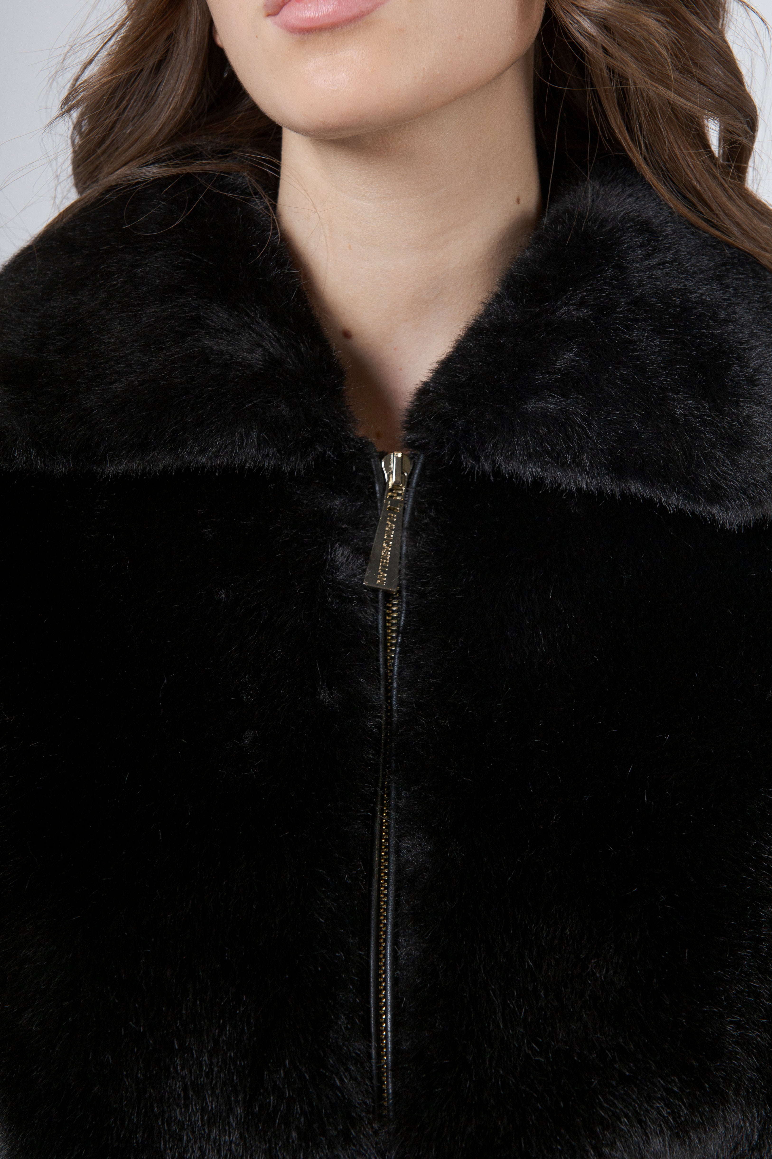 Il corpo della pelliccia — corto, appena sotto la vita — disegnava una silhouette asciutta, perfetta da portare aperta su un look elegante o chiusa per affrontare le giornate più fredde. La zip centrale, nascosta alla vista ma presente nella funzionalità, scorreva con discrezione, mantenendo intatta la pulizia visiva del capo.