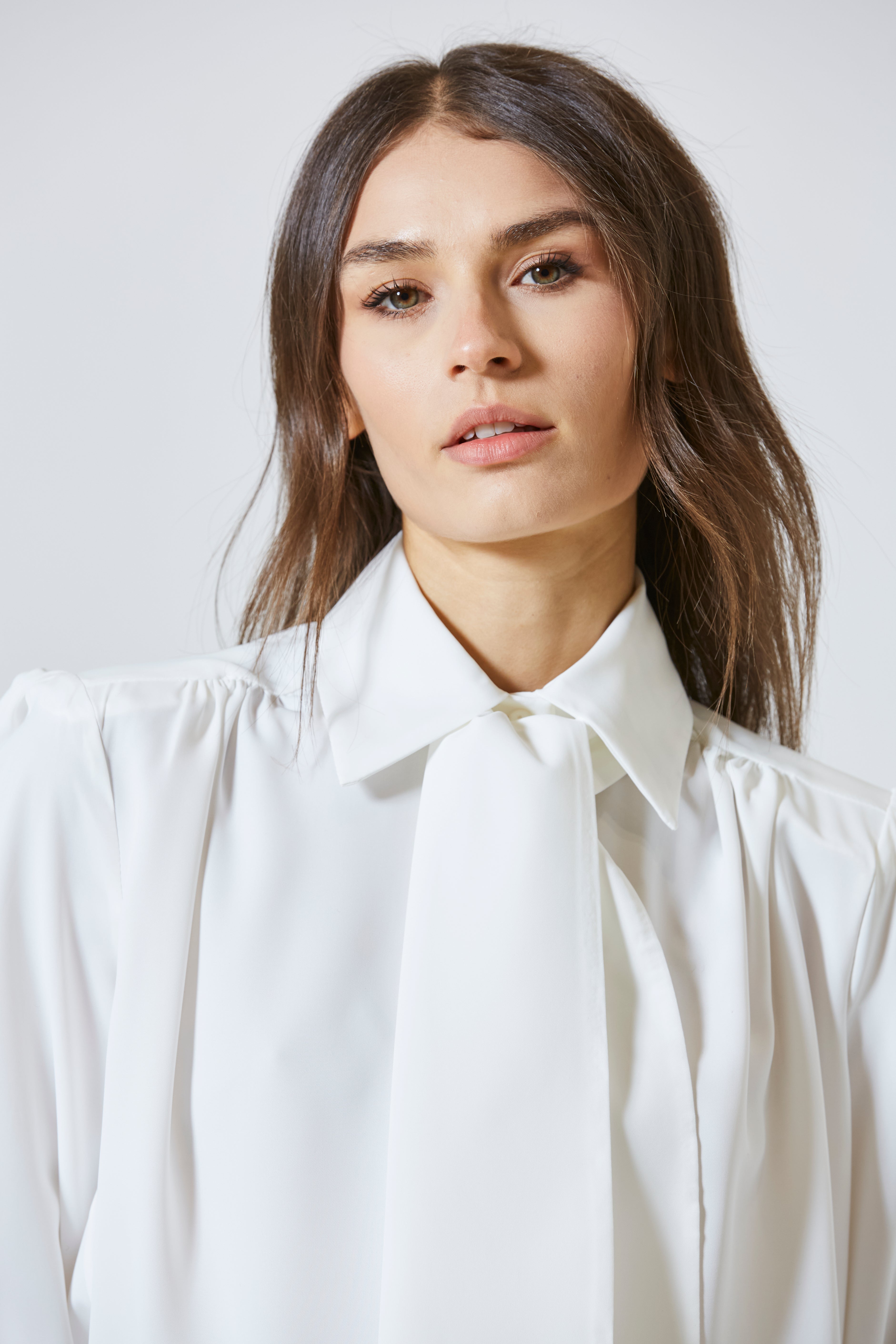 Racconta di mattine luminose in città, di passi sicuri tra vetri e cemento, di sguardi che non cercano attenzione ma la catturano comunque. È la camicia fluida con fiocco al collo firmata Flavio Castellani, un’ode alla femminilità elegante, sofisticata, decisa.