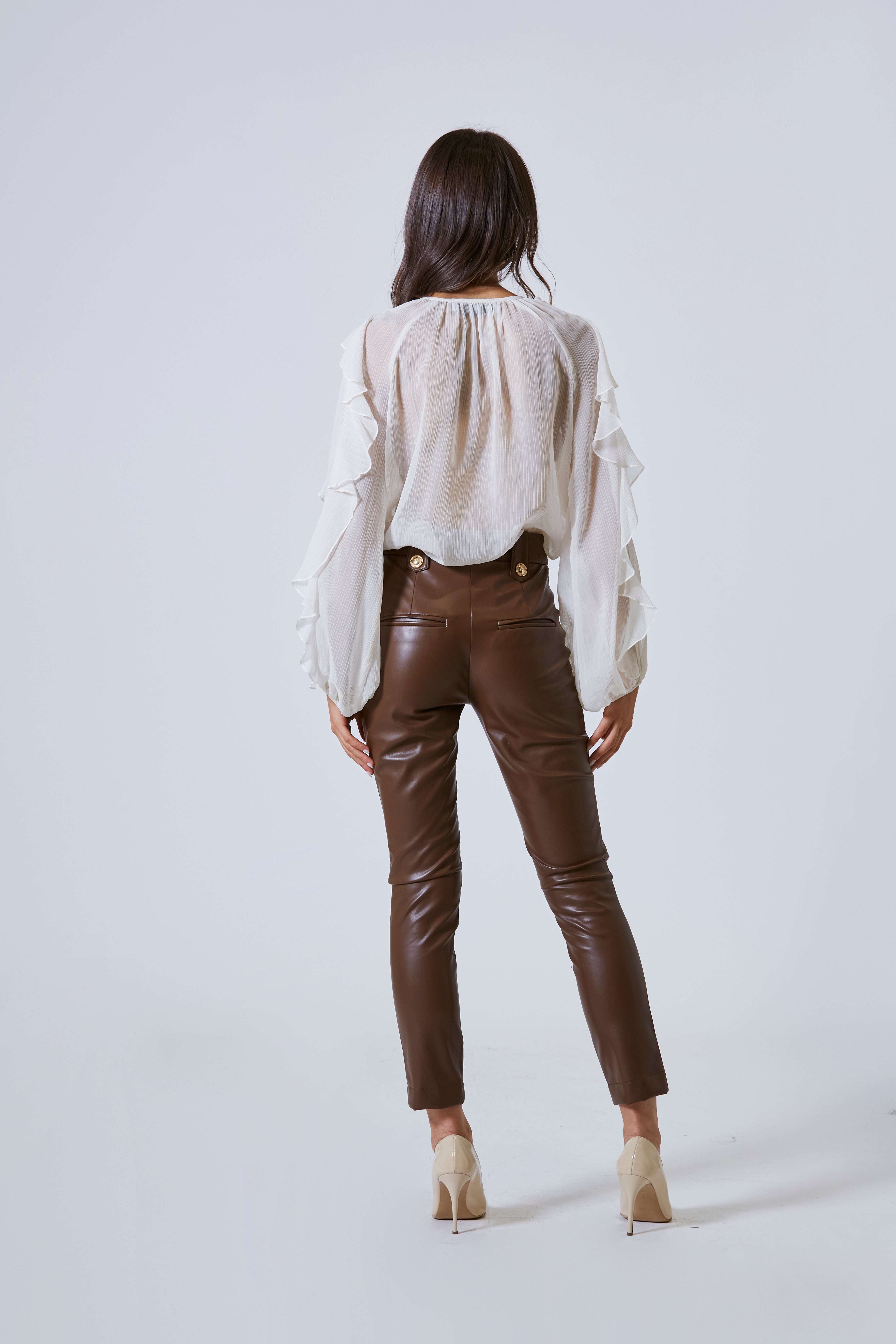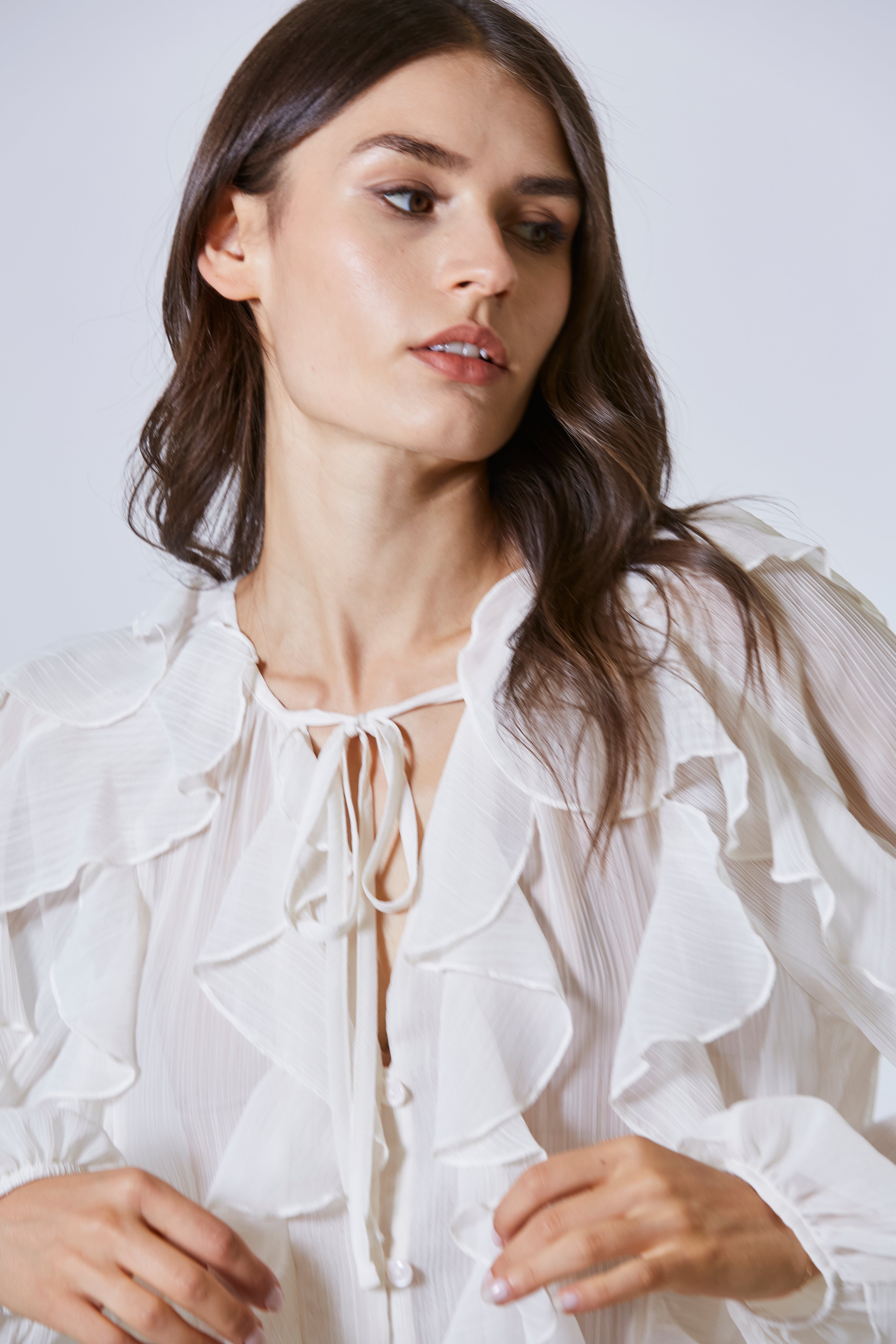 Le maniche lunghe, anch’esse ornate da rouches sottili, avvolgono il braccio con grazia teatrale. Sembrano nate per accompagnare movimenti lenti, eleganti, per sfiorare un tavolo, tenere una tazza, scrivere una lettera. Ogni voluta di tessuto aggiunge un tocco di romanticismo contemporaneo, senza mai scivolare nell’antico.