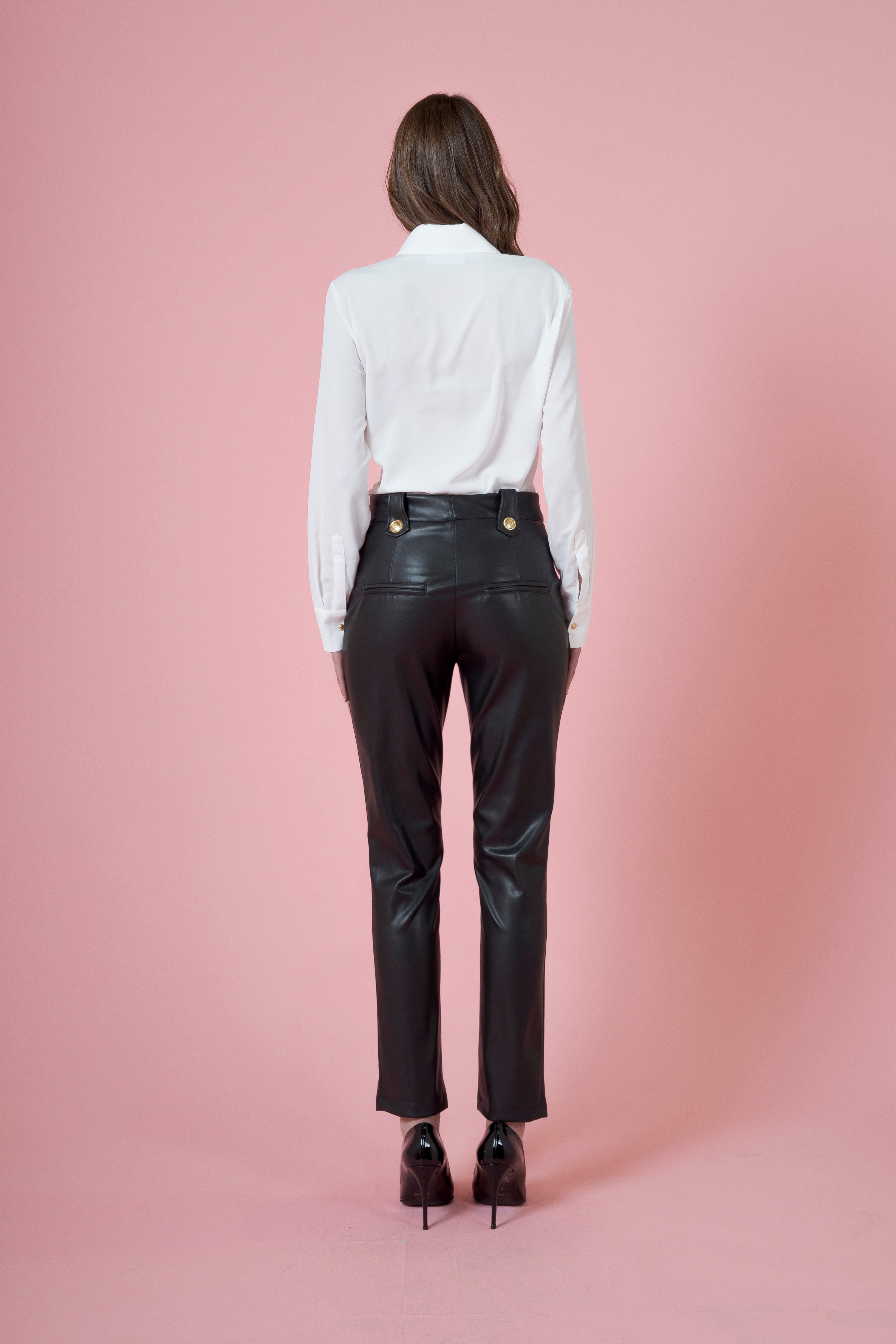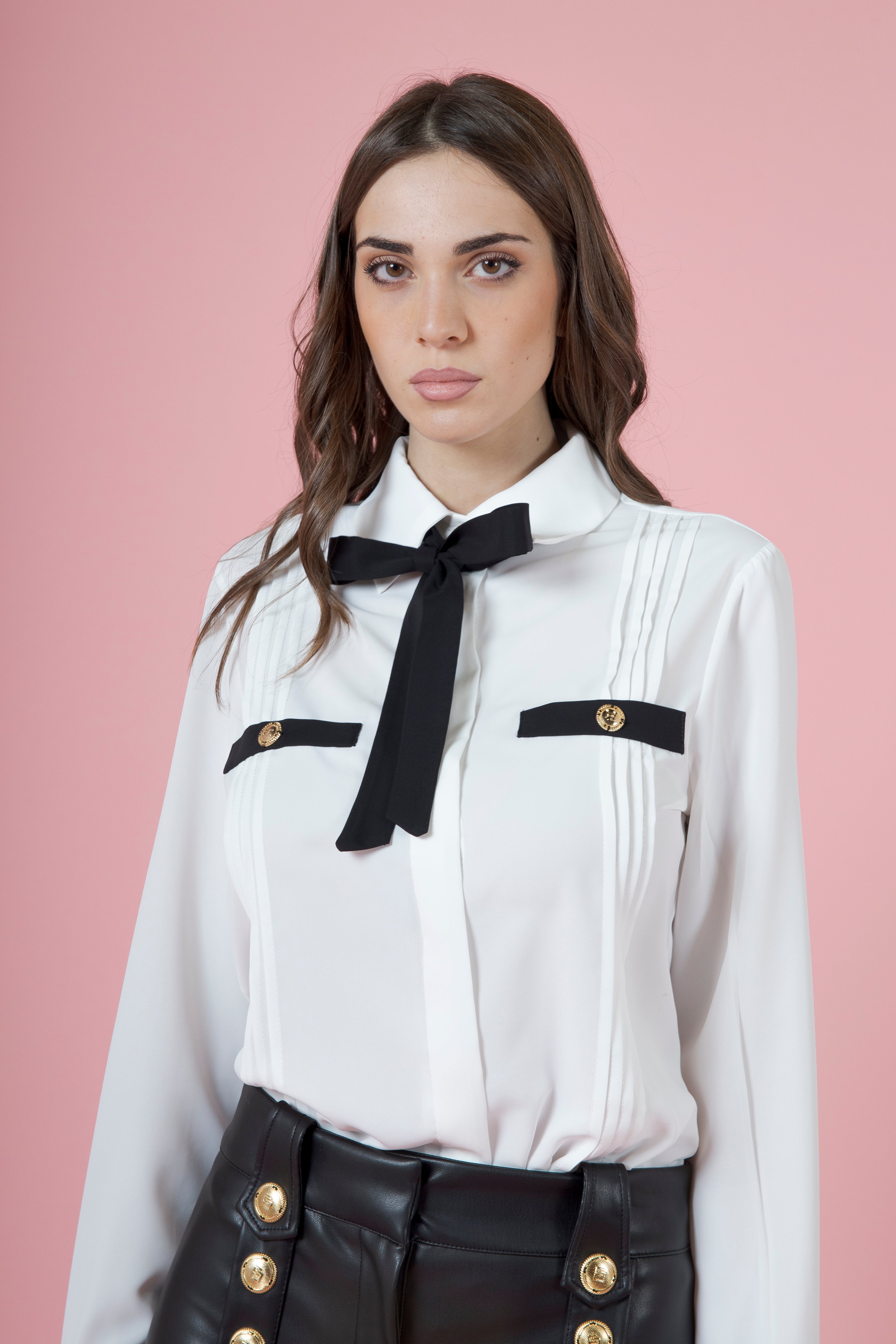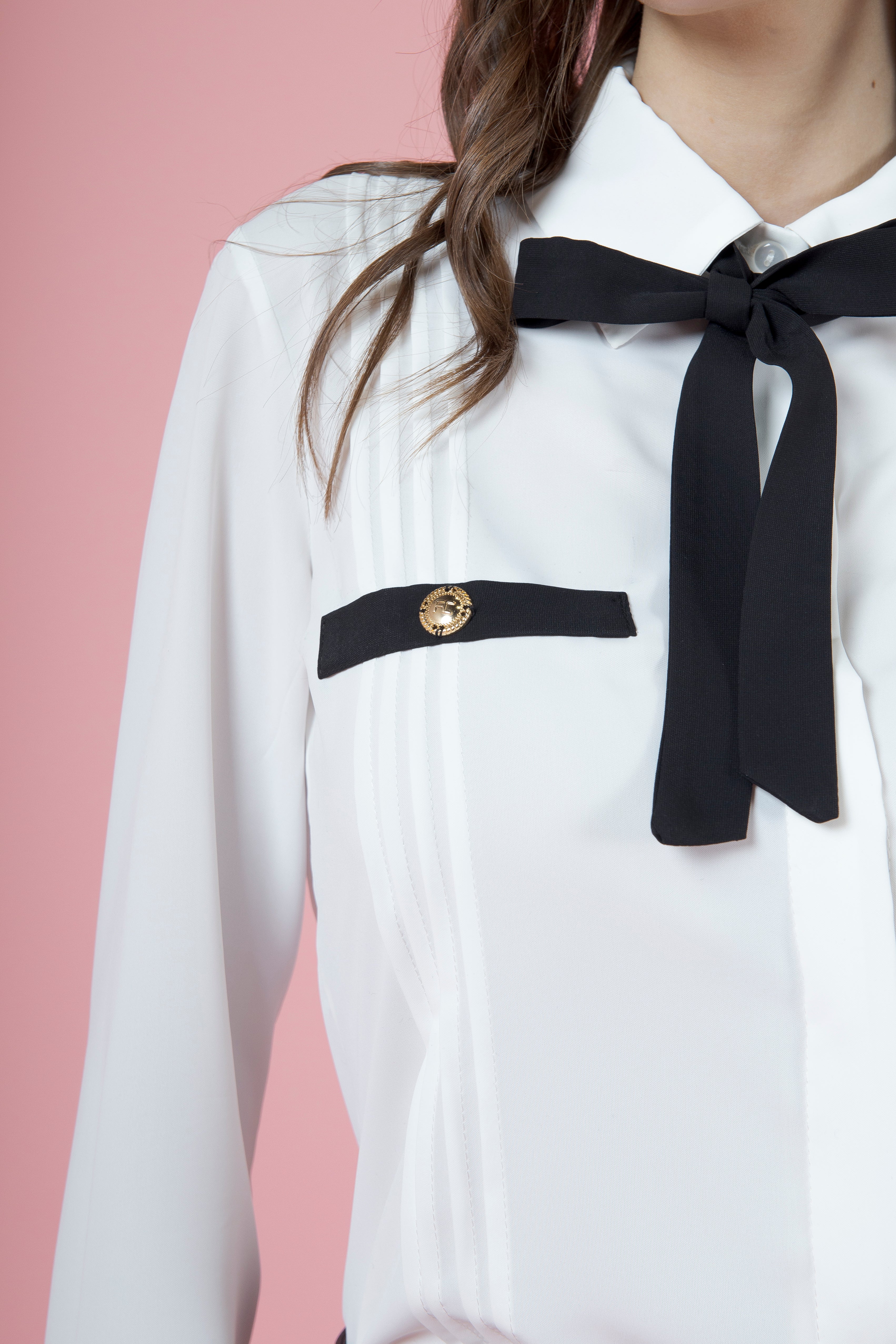 Questa camicia con profili neri, taschine sul seno e fiocco al collo non è solo un capo d’abbigliamento: è un incontro tra ordine e fantasia, un equilibrio perfetto tra la severità del tratto nero e la morbidezza del bianco.