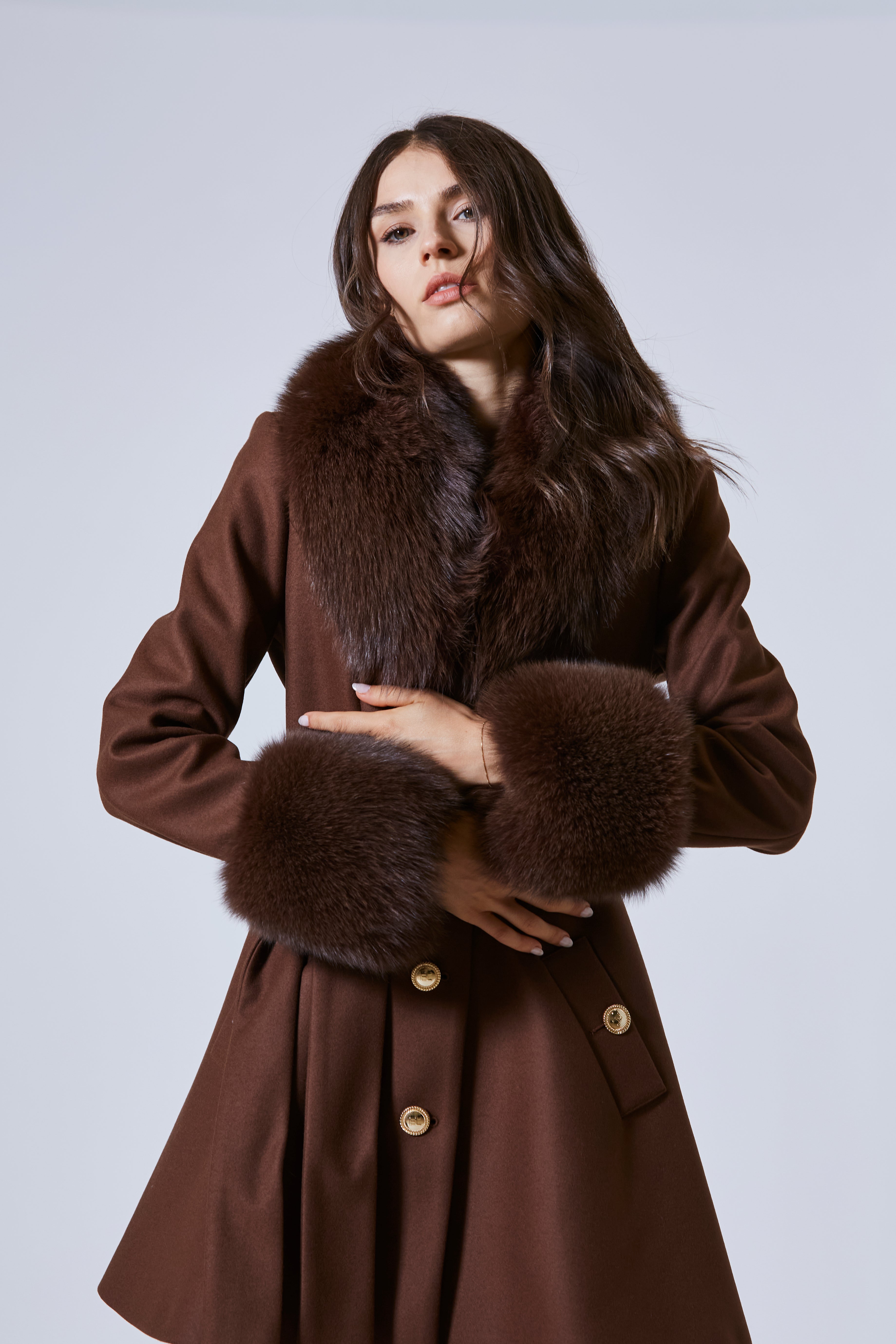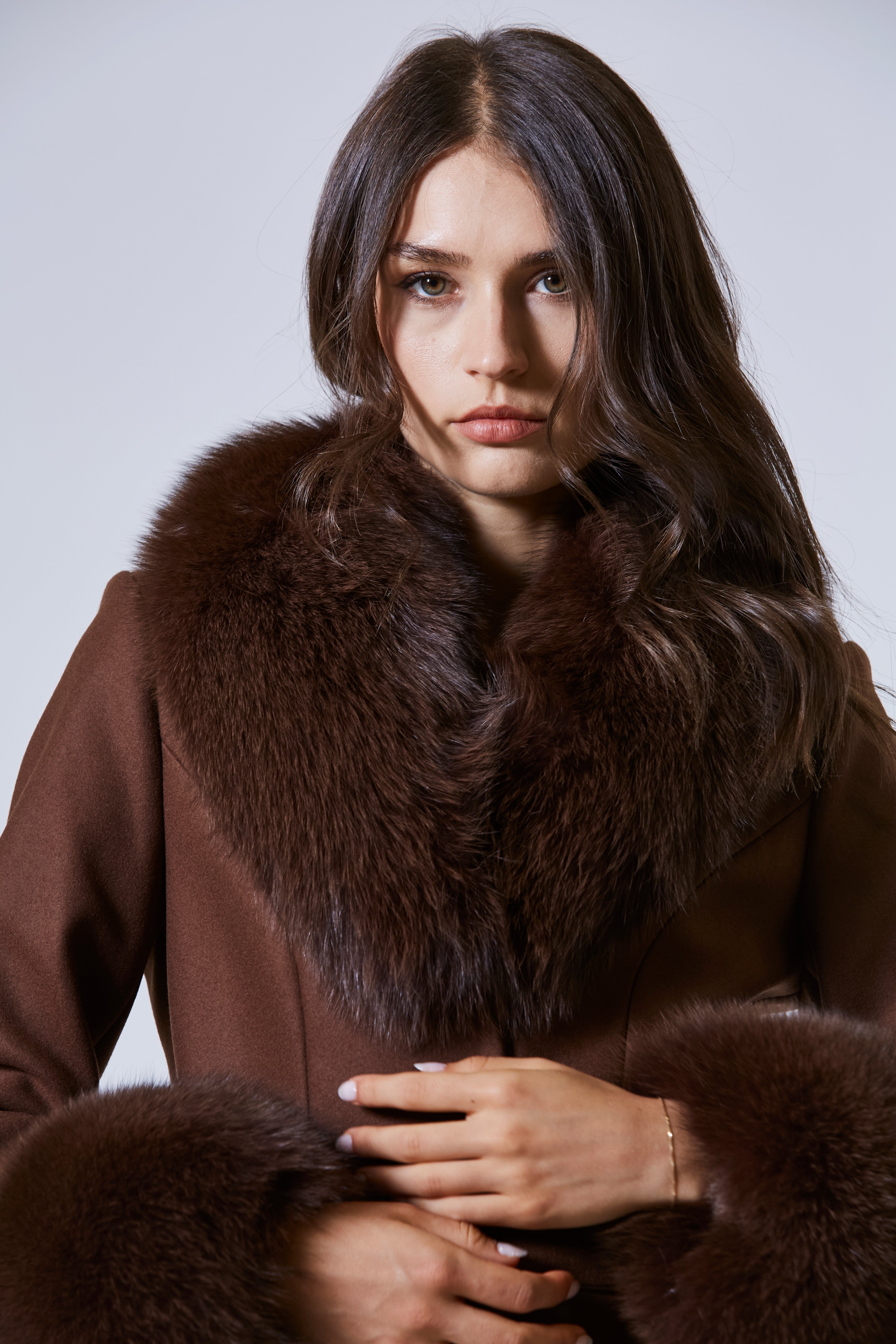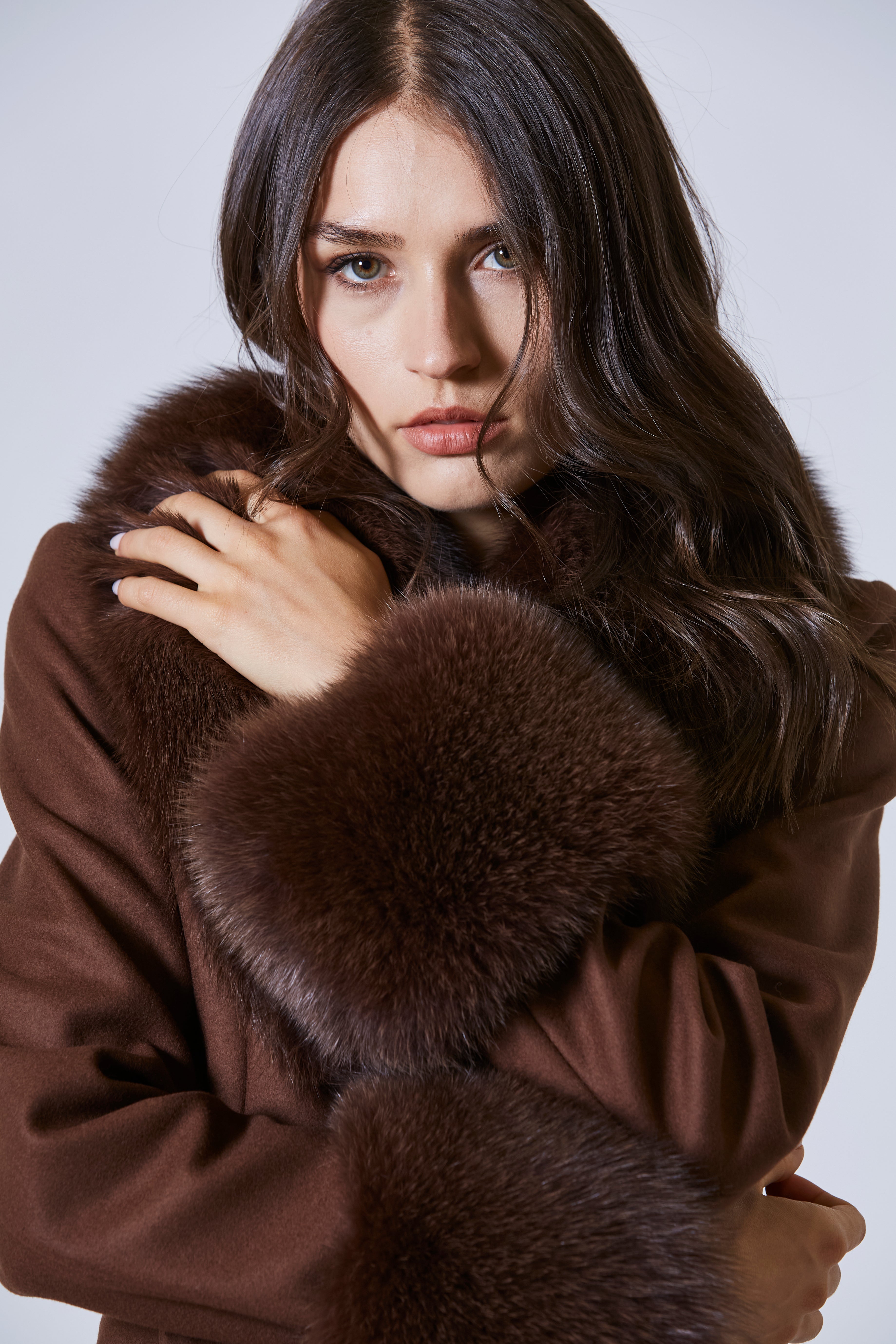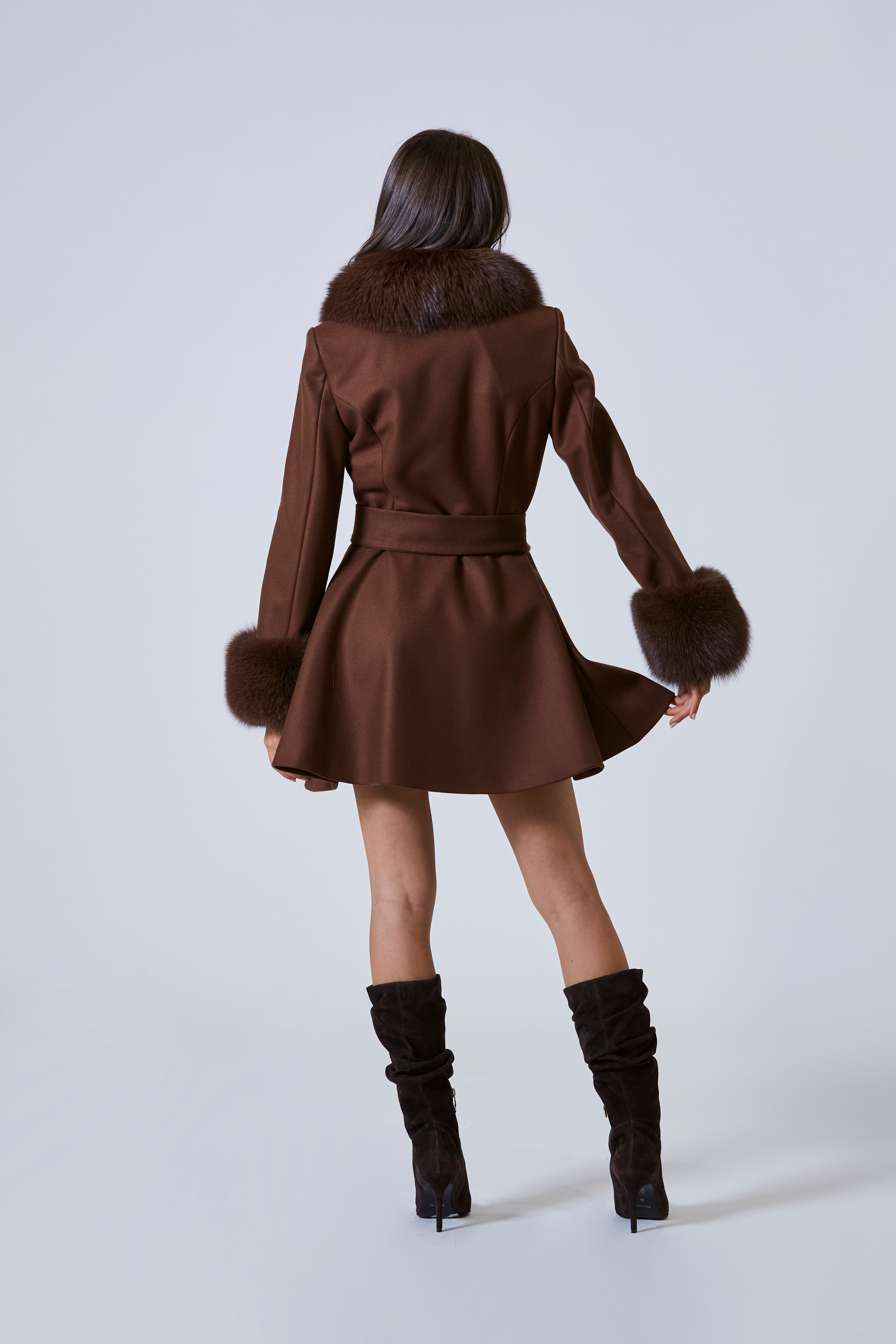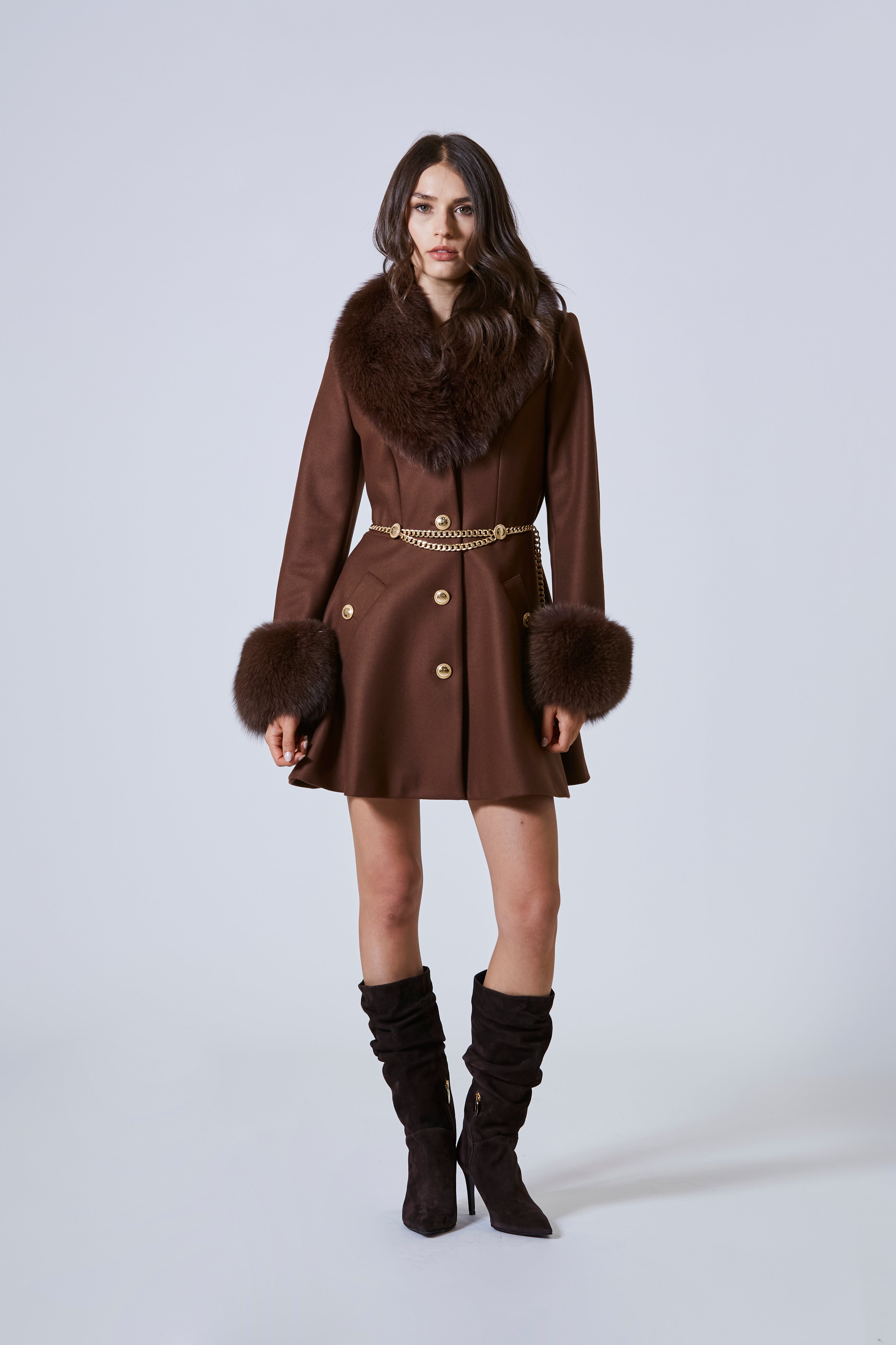 Immagina un piccolo gioiello sartoriale, un capospalla che sembra uscito da una fiaba invernale: il cappotto corto svasato a bambolina, in lana, con pelliccia sul collo e manopole coordinate è un invito a vivere il freddo con grazia, leggerezza ed elegante delicatezza.