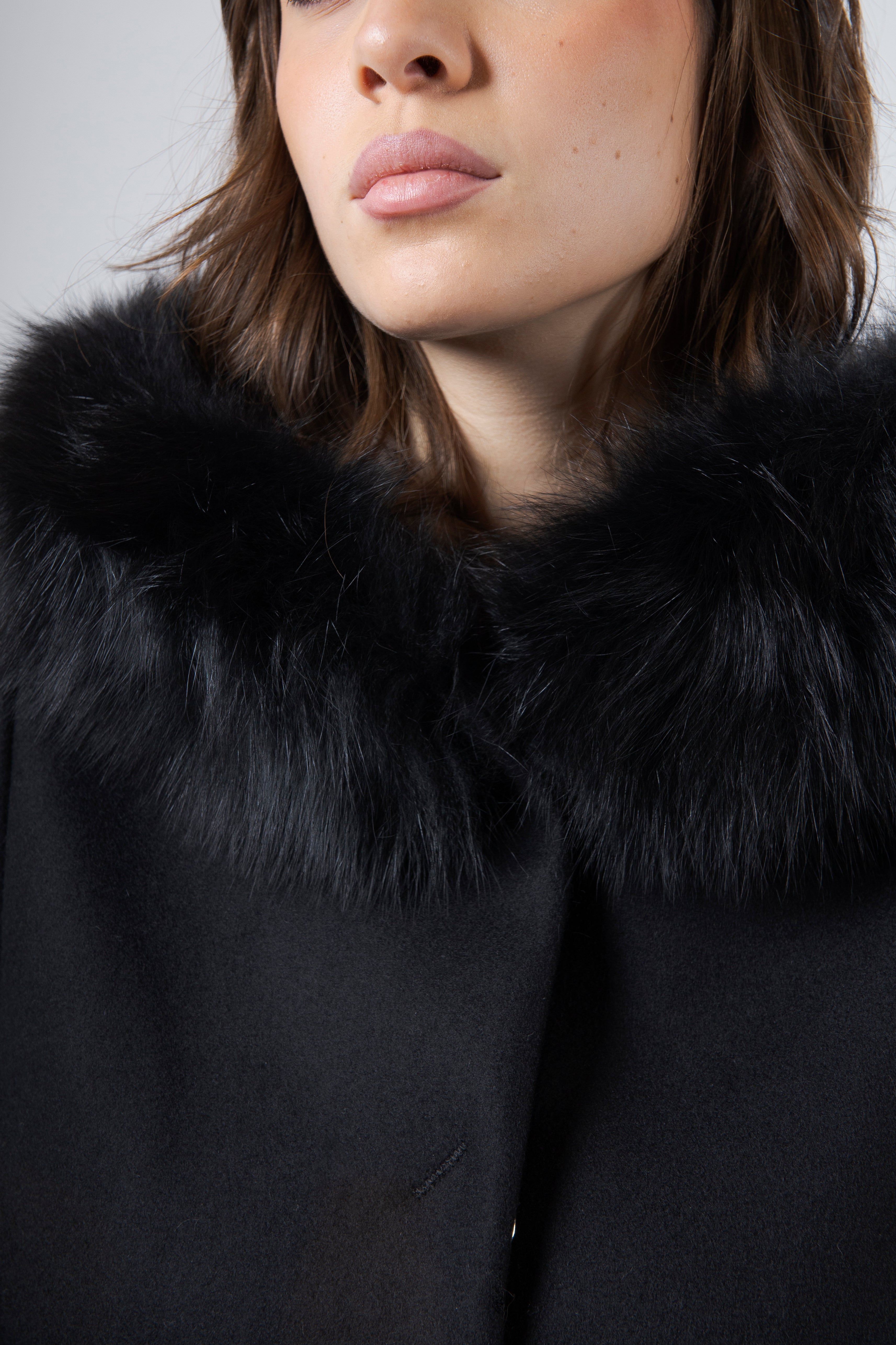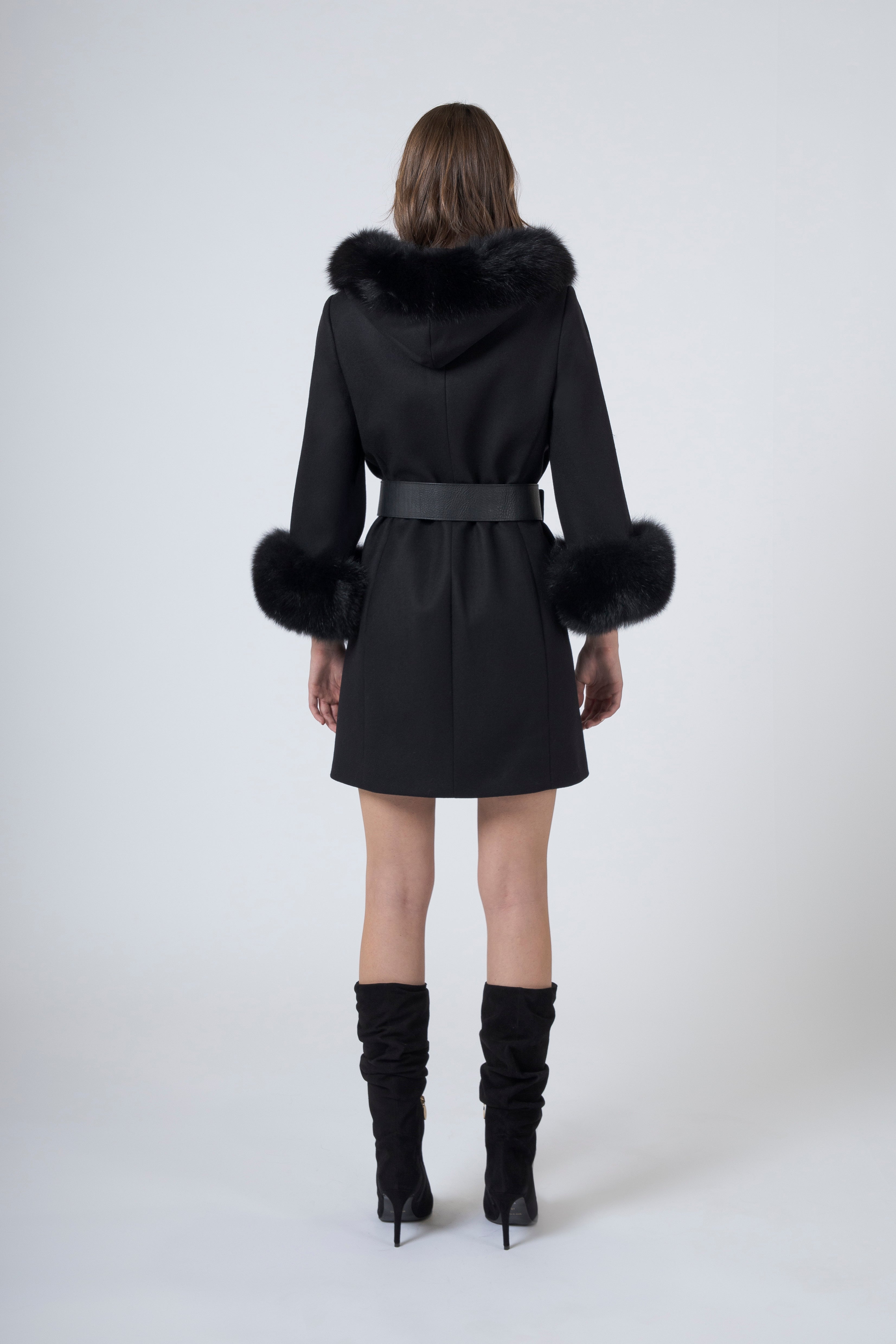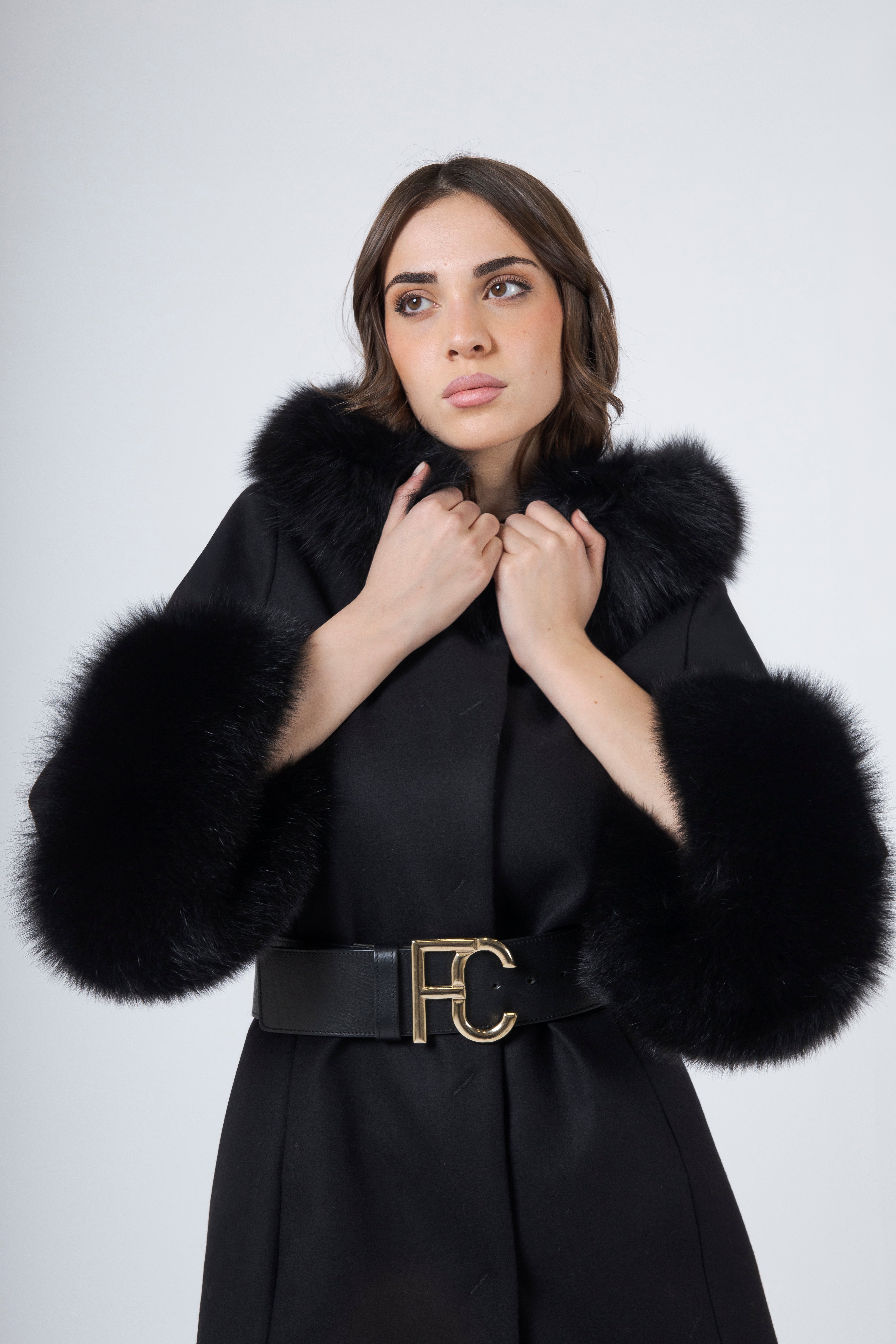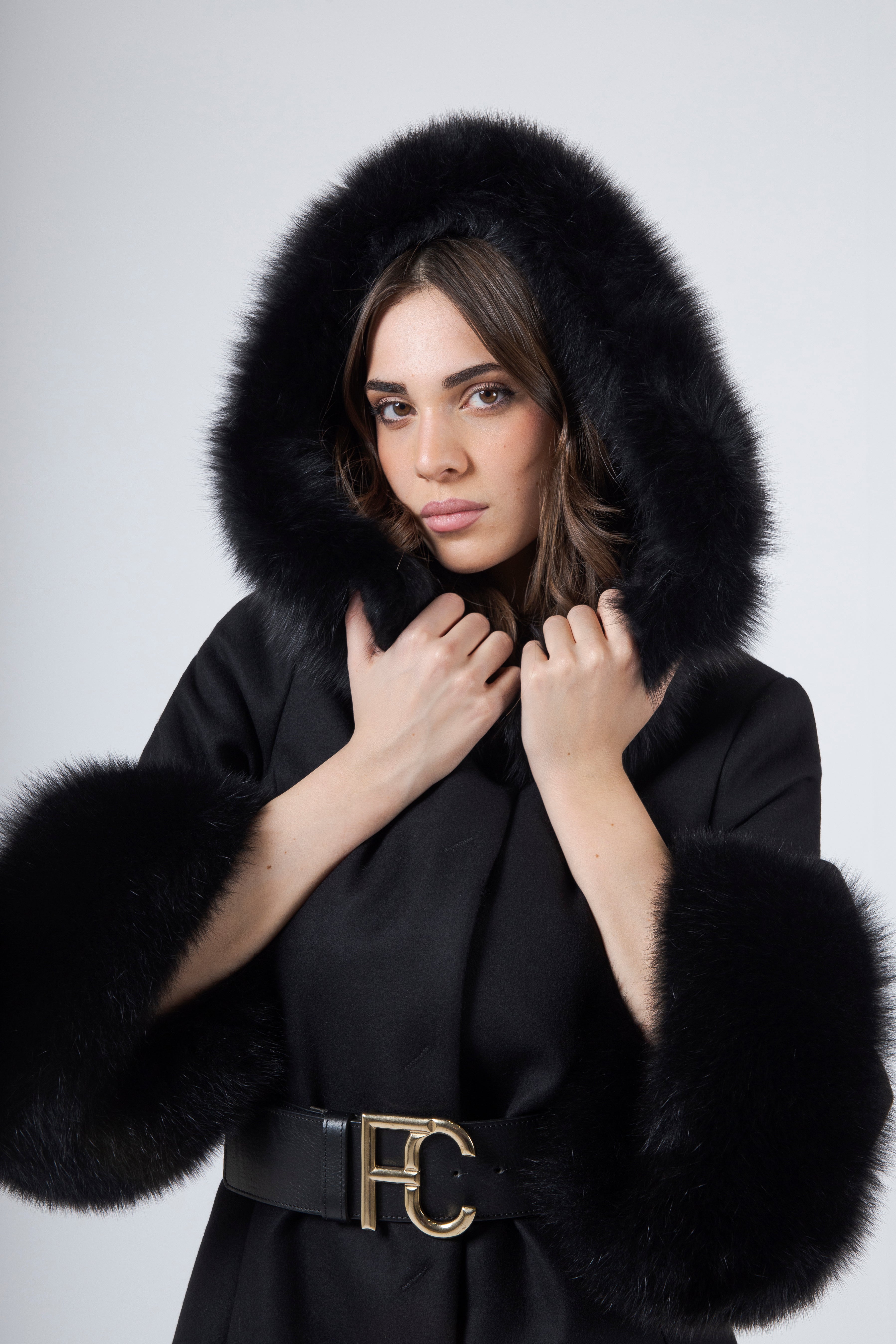Il cappuccio, ampio e generoso, è bordato da una pelliccia folta e vaporosa. Quando viene sollevato sulla testa, il mondo si attenua, le voci si fanno lontane, i rumori si ovattano come in una stanza chiusa da tende pesanti. È un rifugio più che un accessorio, un luogo privato che segue chi lo indossa ovunque vada. La pelliccia si arriccia leggermente alle estremità, come se custodisse il segreto di antichi inverni, e porta con sé il profumo discreto di legno e vento.