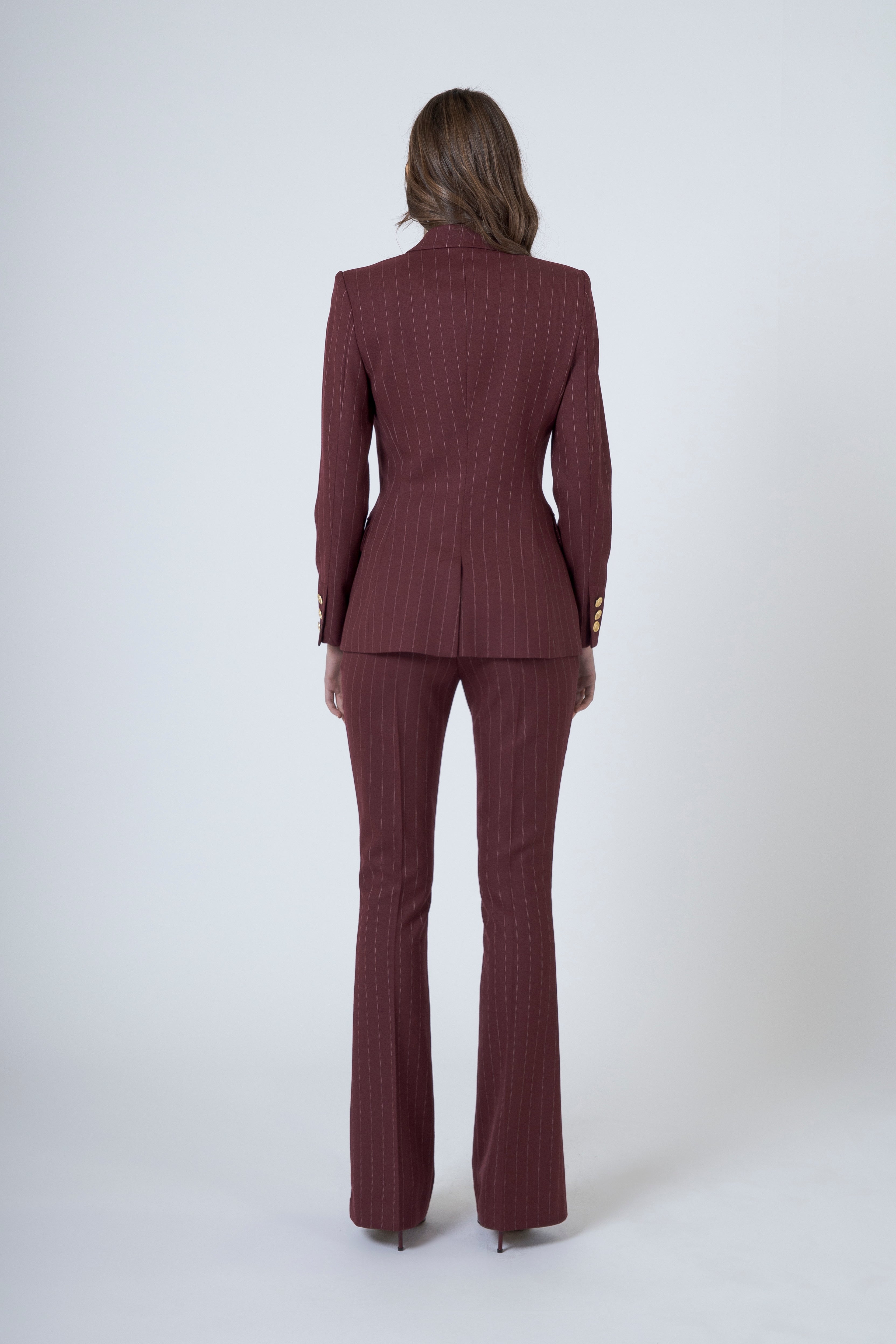 Le righe gessate, sottili e regolari, correvano con ritmo preciso sul tessuto, regalando al taglio una verticalità raffinata, quasi architettonica. Una stampa classica, sì, ma resa attuale dalla proporzione moderna, dal taglio deciso, dalla capacità di rendere ogni look più forte, più composto, più consapevole.