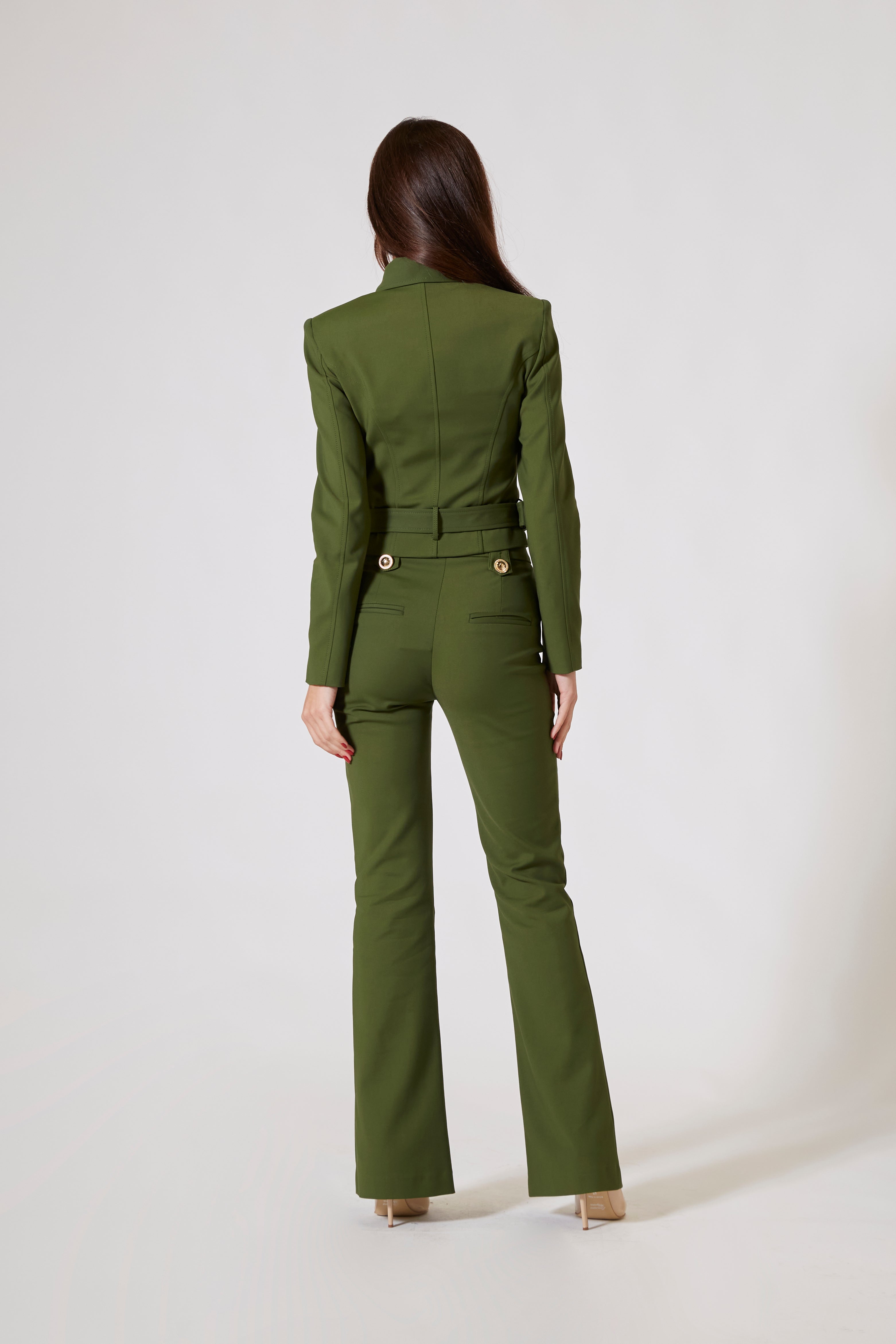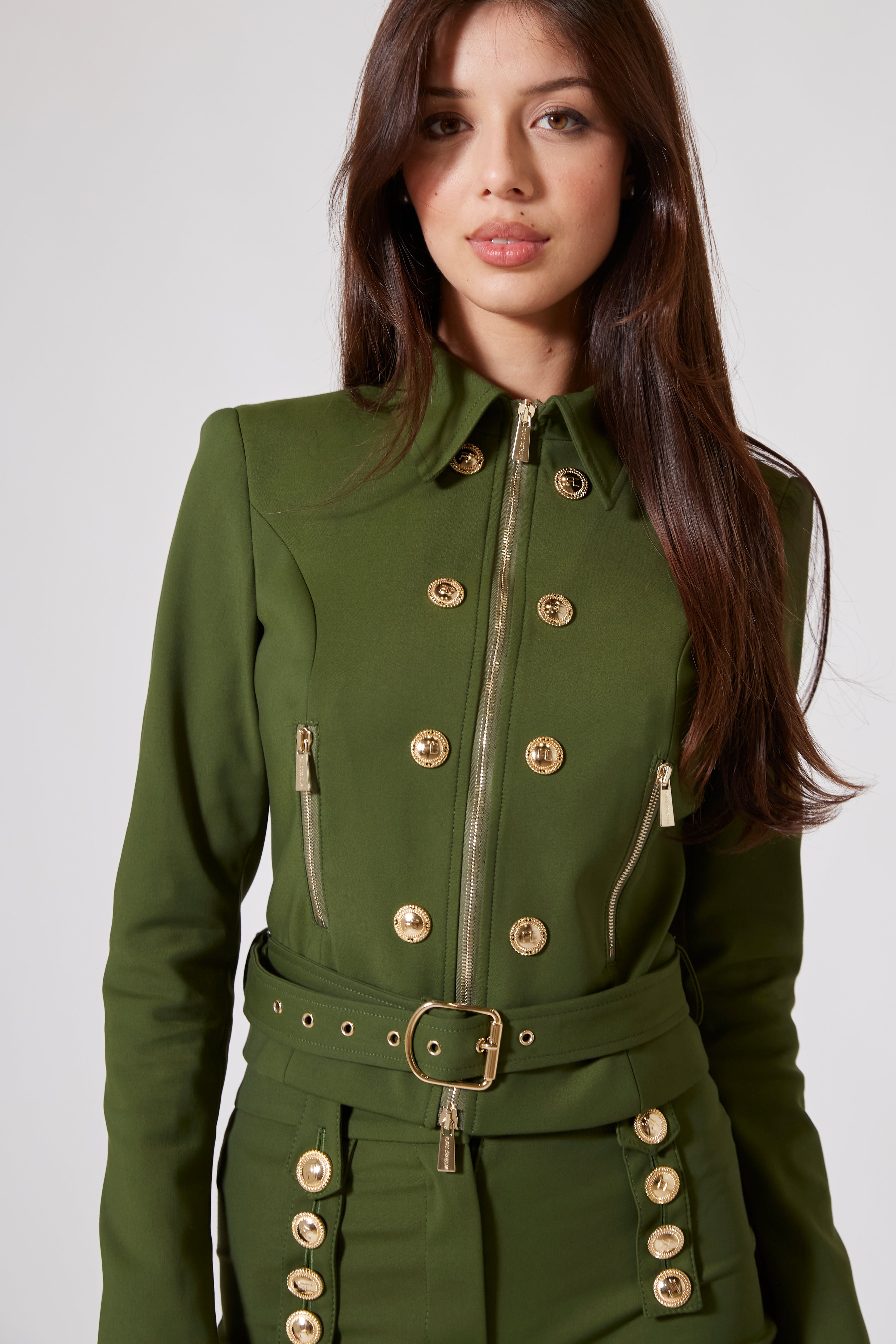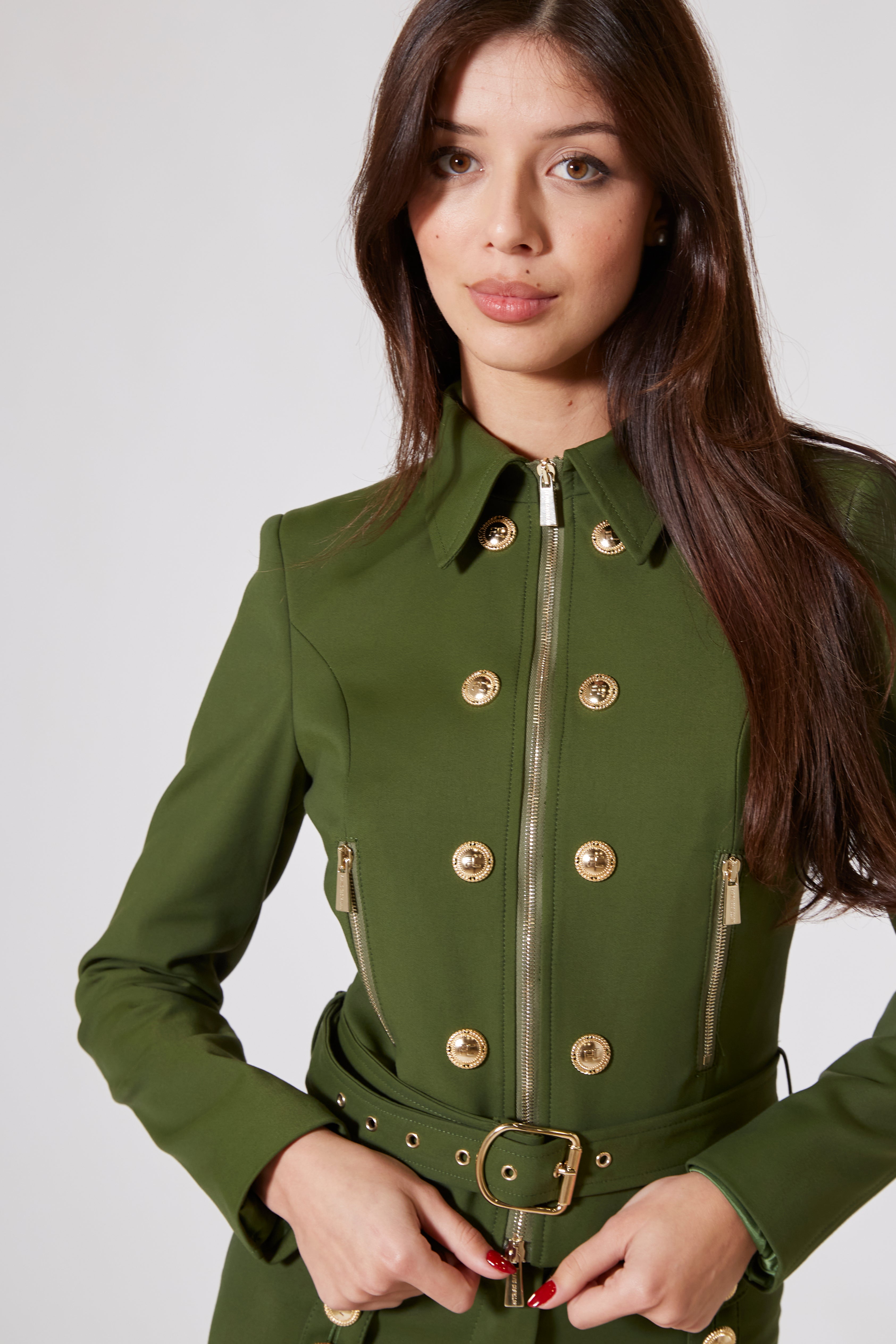 La sua anima vive nella leggerezza del tessuto, che accarezza senza costringere, che accompagna i movimenti come il vento fa con i rami sottili. E poi c’è quell’oro discreto che punteggia la silhouette: la zip che scivola come un filo di luce e i bottoni a doppio petto, piccoli soli incisi con le iniziali di chi ha fatto dell’eleganza un mestiere e una promessa. Non gridano, non cercano di essere notati — ma chi li incontra non se li dimentica.
