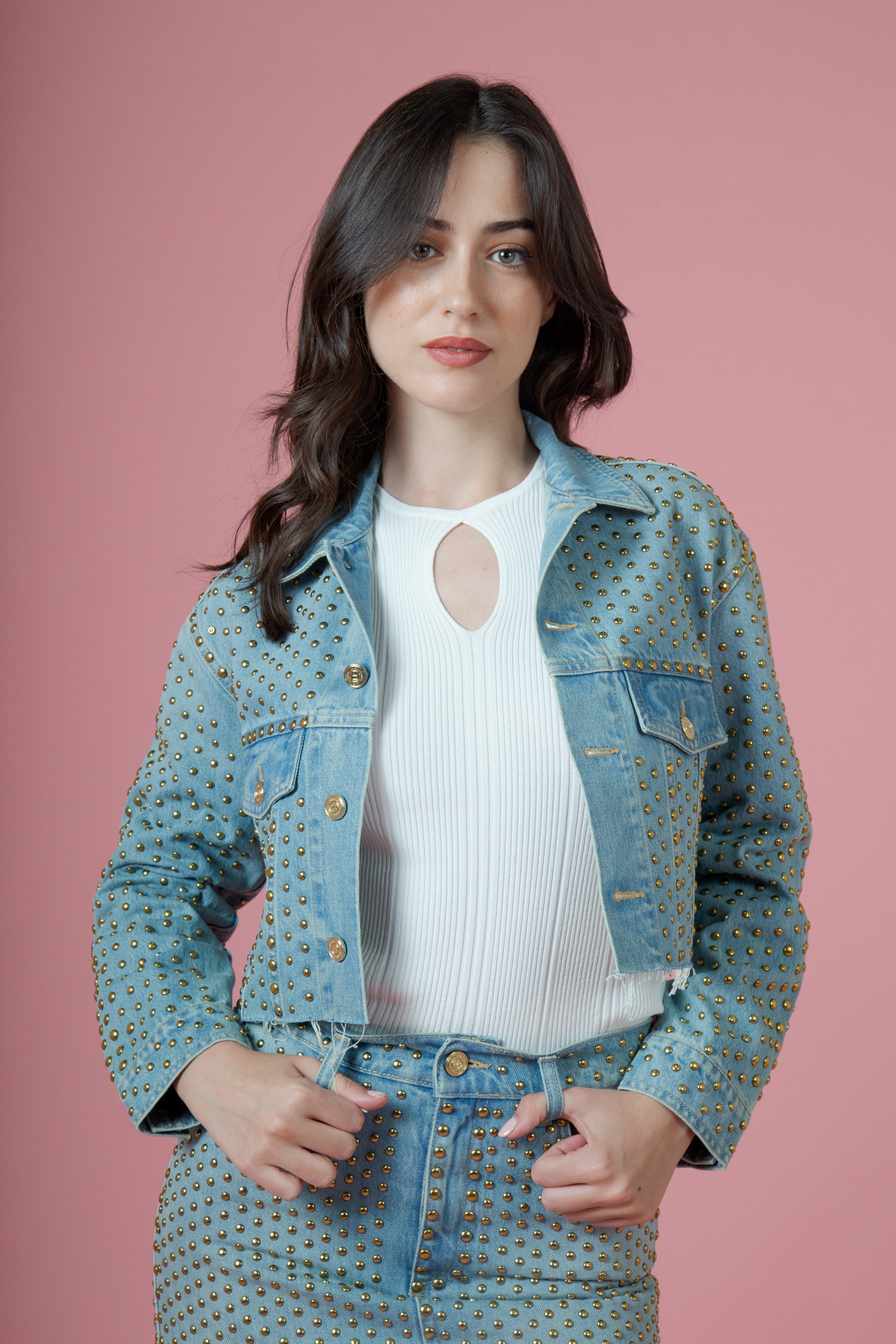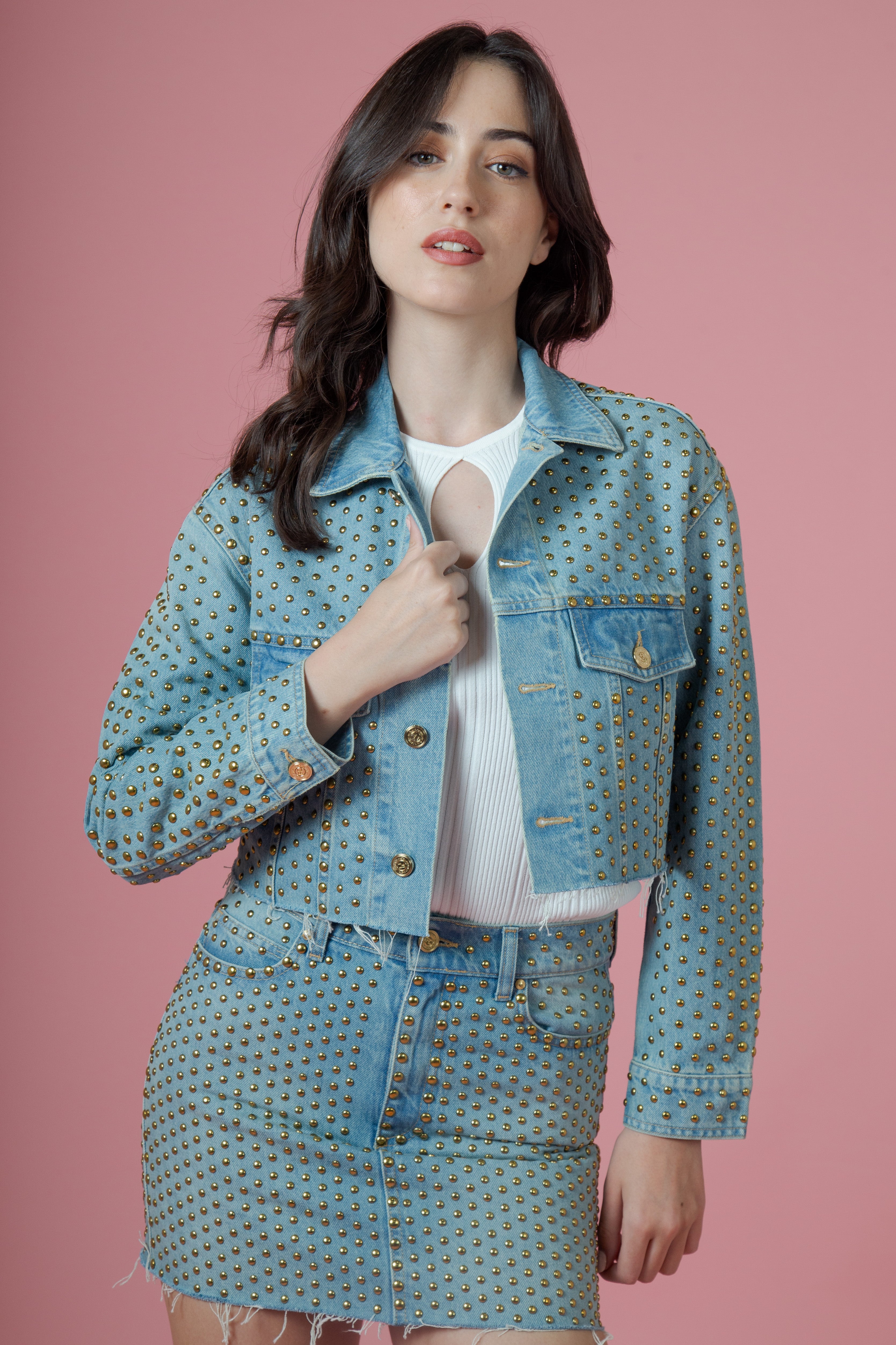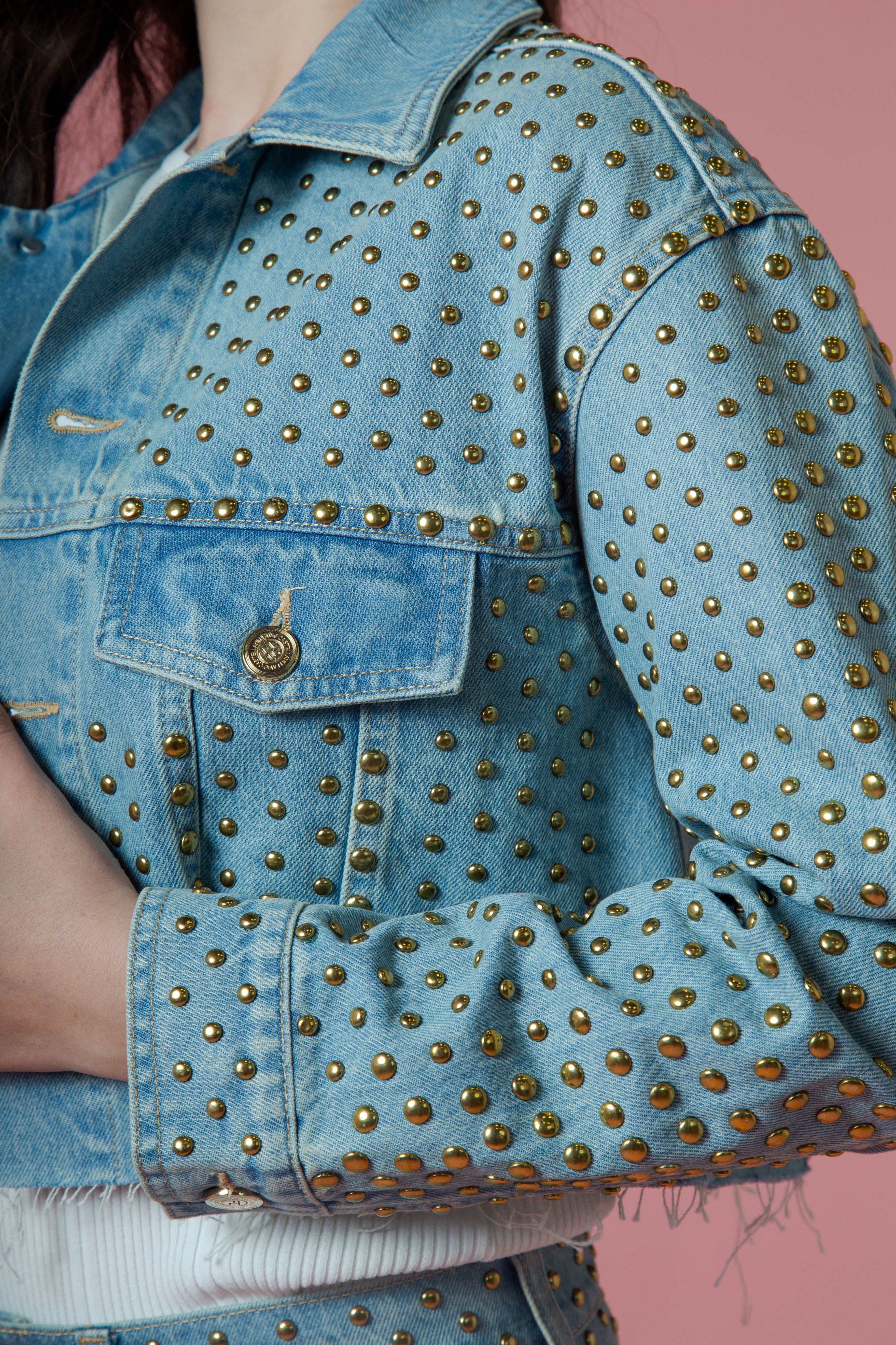 Ma è la superficie del giubbino a renderlo davvero indimenticabile: completamente avvolto da borchie tonde color oro, come una corazza luminosa. Ogni borchia cattura la luce e la restituisce con riflessi caldi, trasformando il capo in un gioco continuo di bagliori metallici. Il risultato è potente, quasi scenografico, un equilibrio tra spirito rock e seduzione.