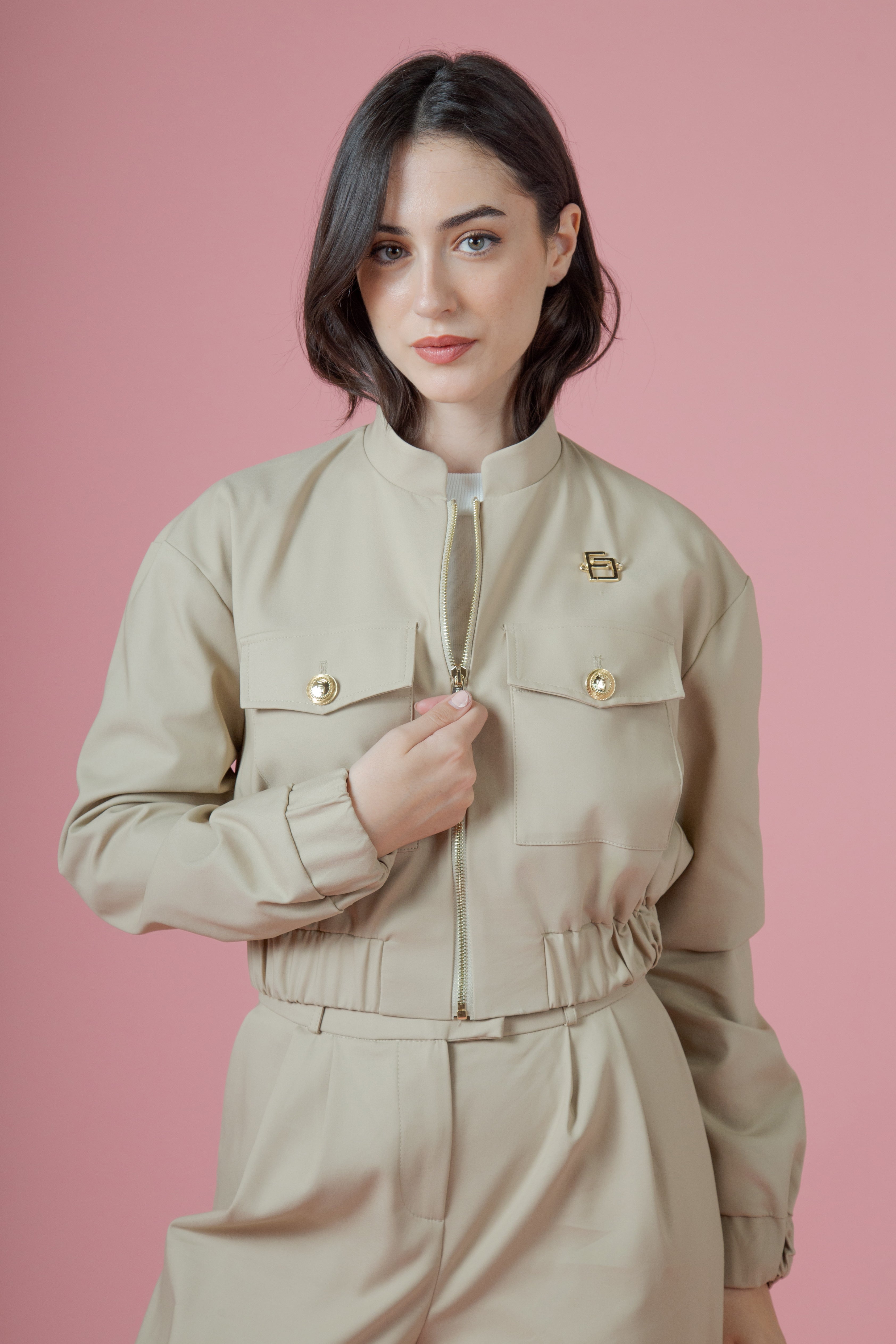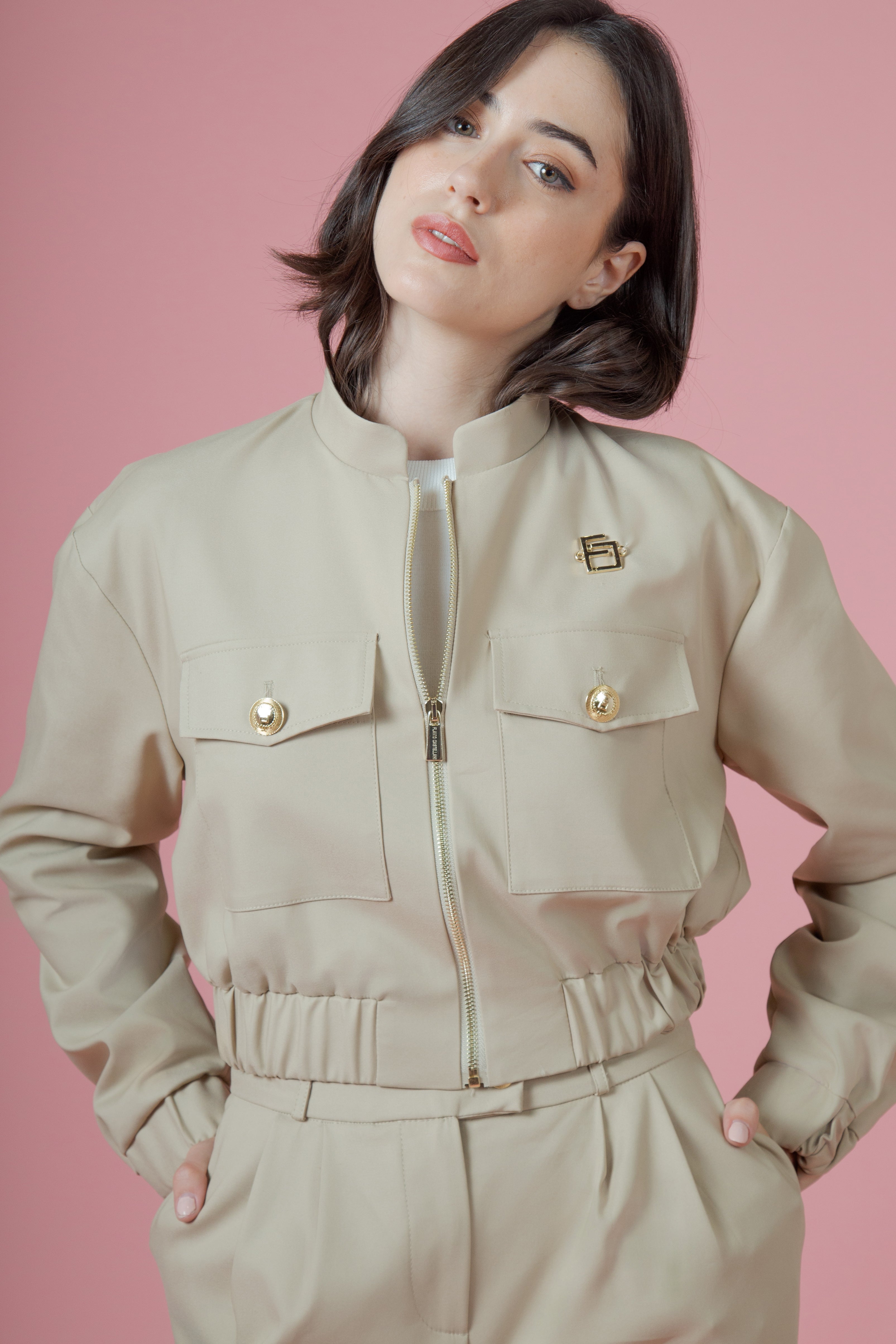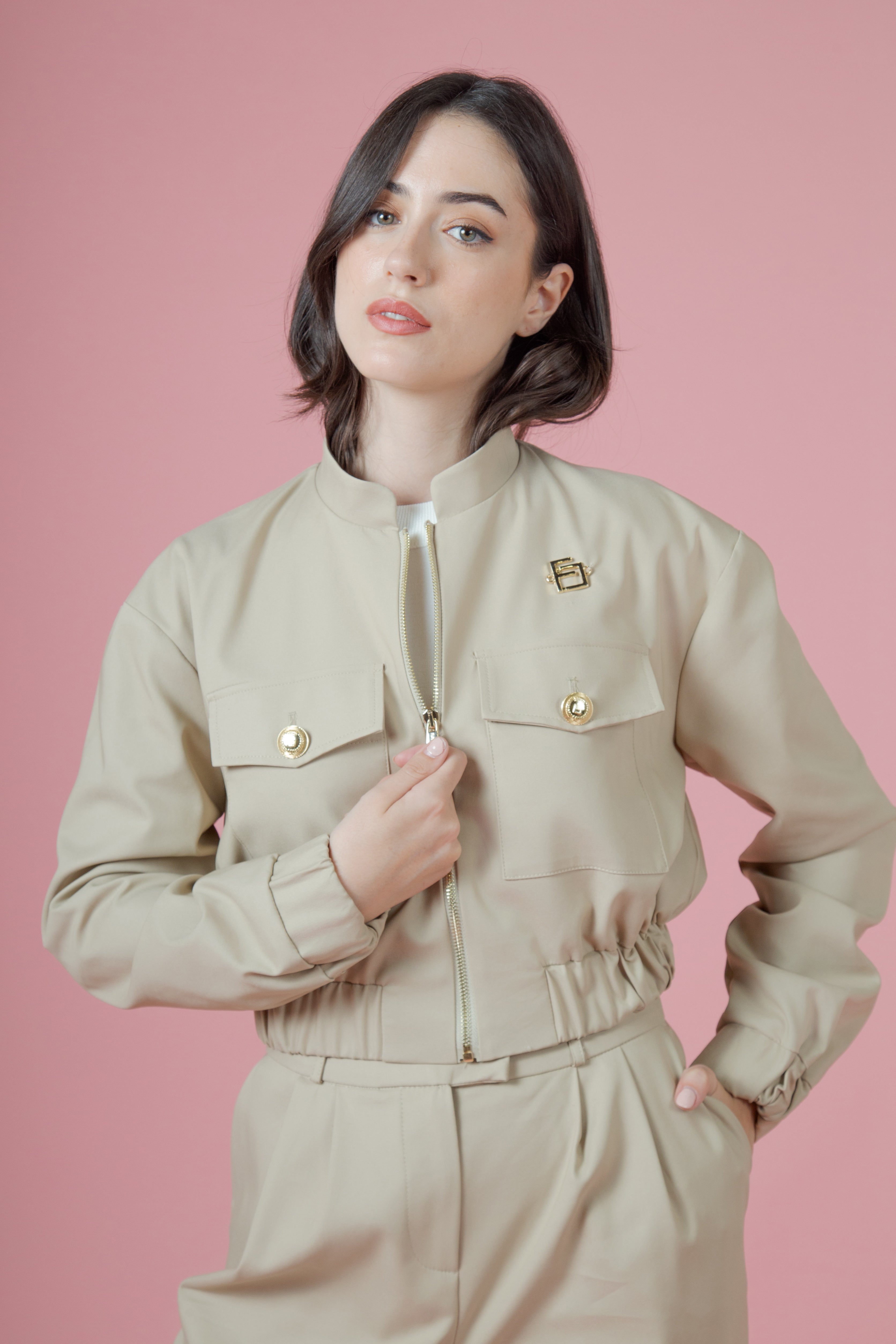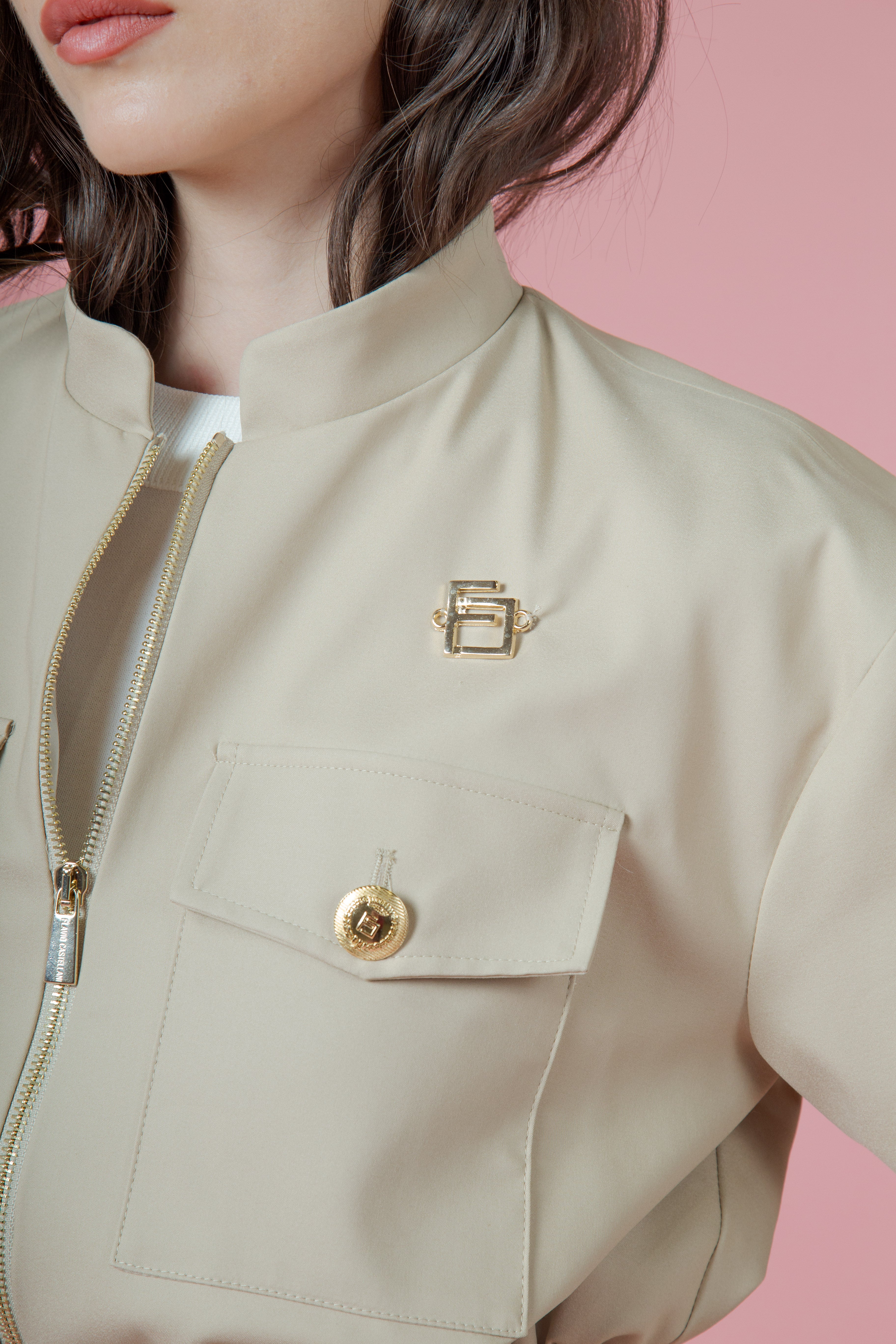 La zip oro attraversava il davanti come una linea di carattere, decisa, luminosa, quasi regale. Non era un semplice elemento funzionale: era una dichiarazione. Rifletteva bagliori caldi ad ogni movimento, come se custodisse piccoli frammenti di sole. Sopra, il collo alla coreana si ergeva con eleganza sobria, incorniciando il viso con una grazia contemporanea, pulita, quasi architettonica.