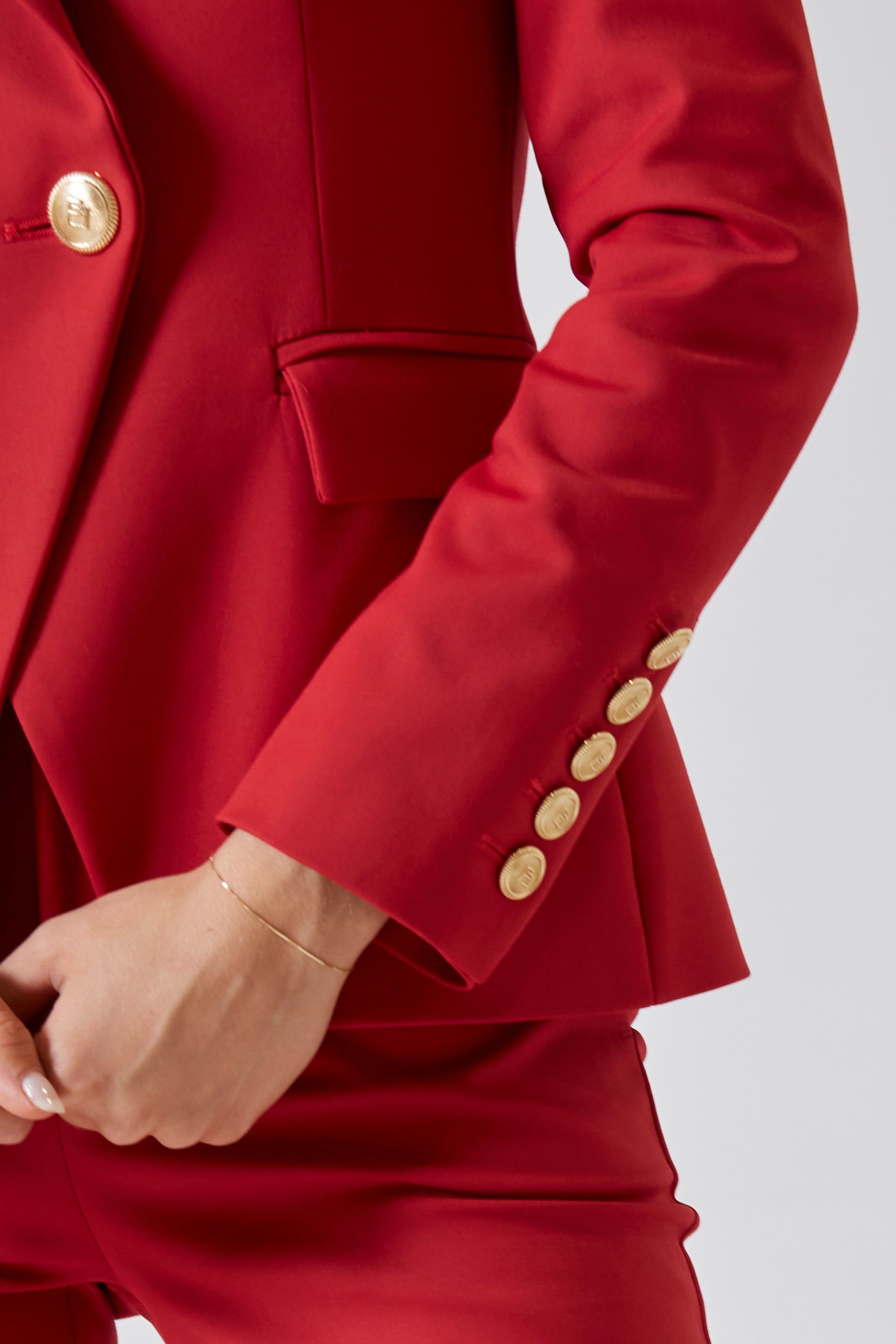 I bottoni oro personalizzati Flavio Castellani punteggiano il davanti come piccole dichiarazioni di stile: discreti, ma capaci di catturare la luce e raccontare una cura sartoriale tutta italiana. Sono dettagli che trasformano la struttura rigorosa della giacca in un capo prezioso, senza mai rinunciare alla sua anima pratica e decisa.