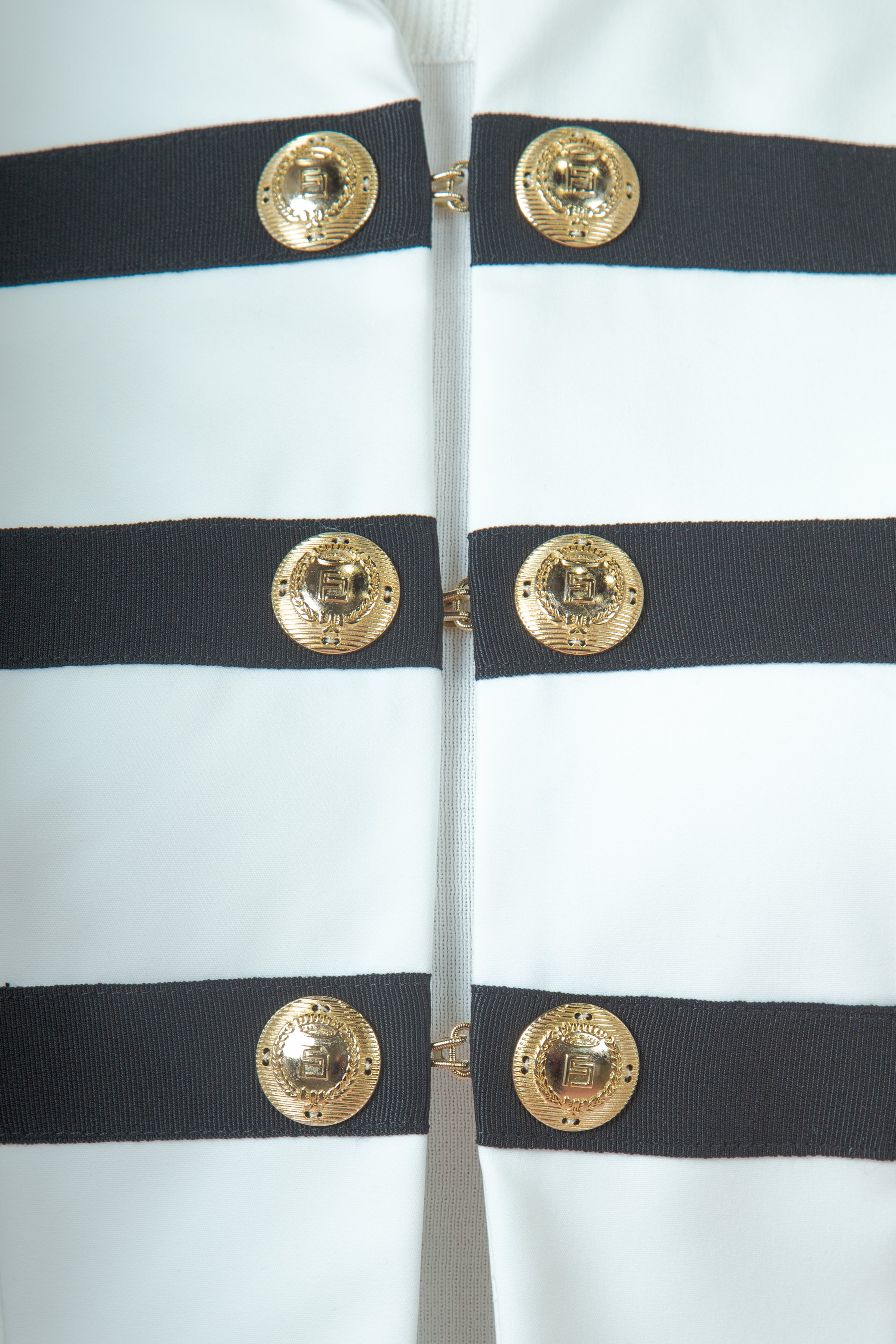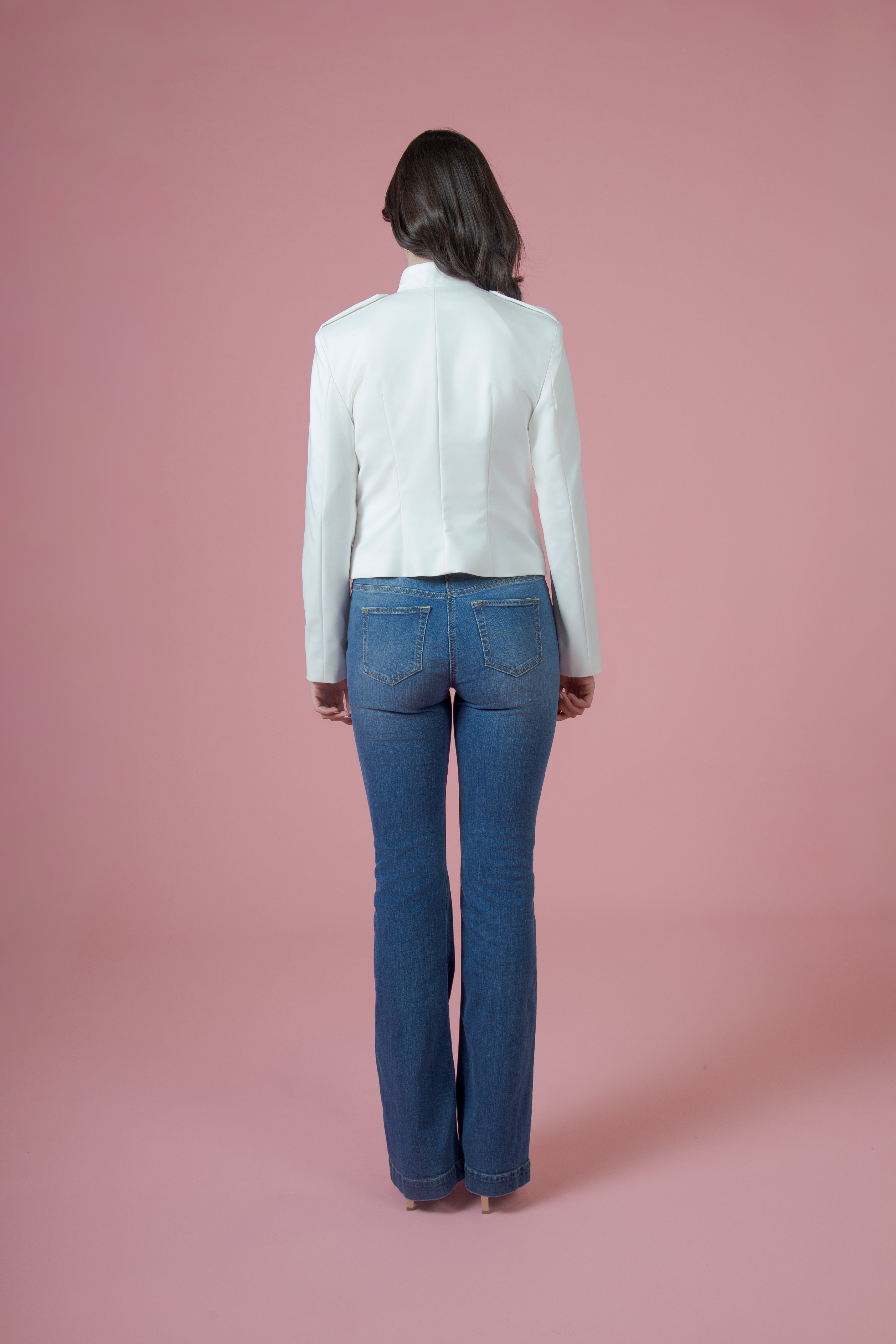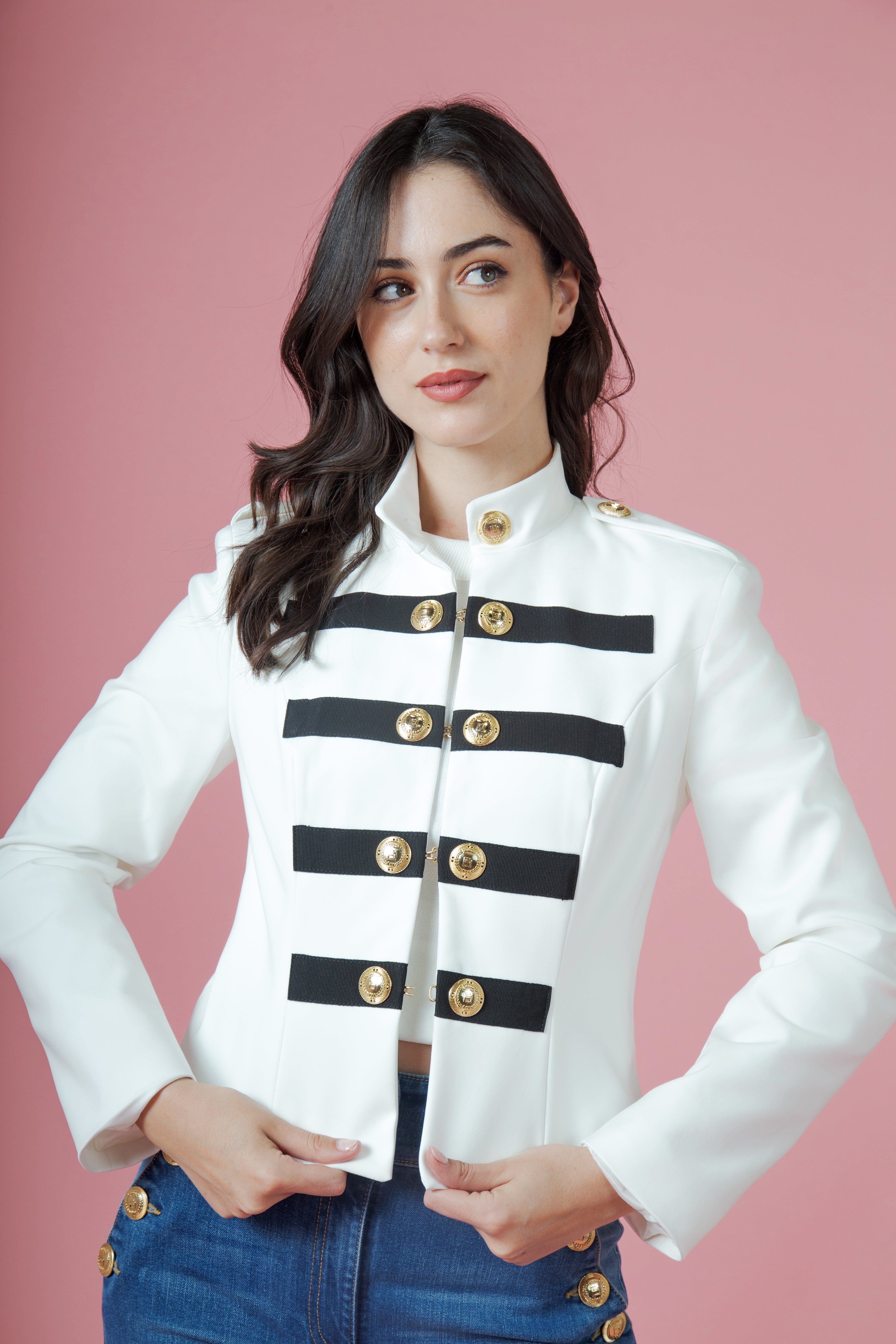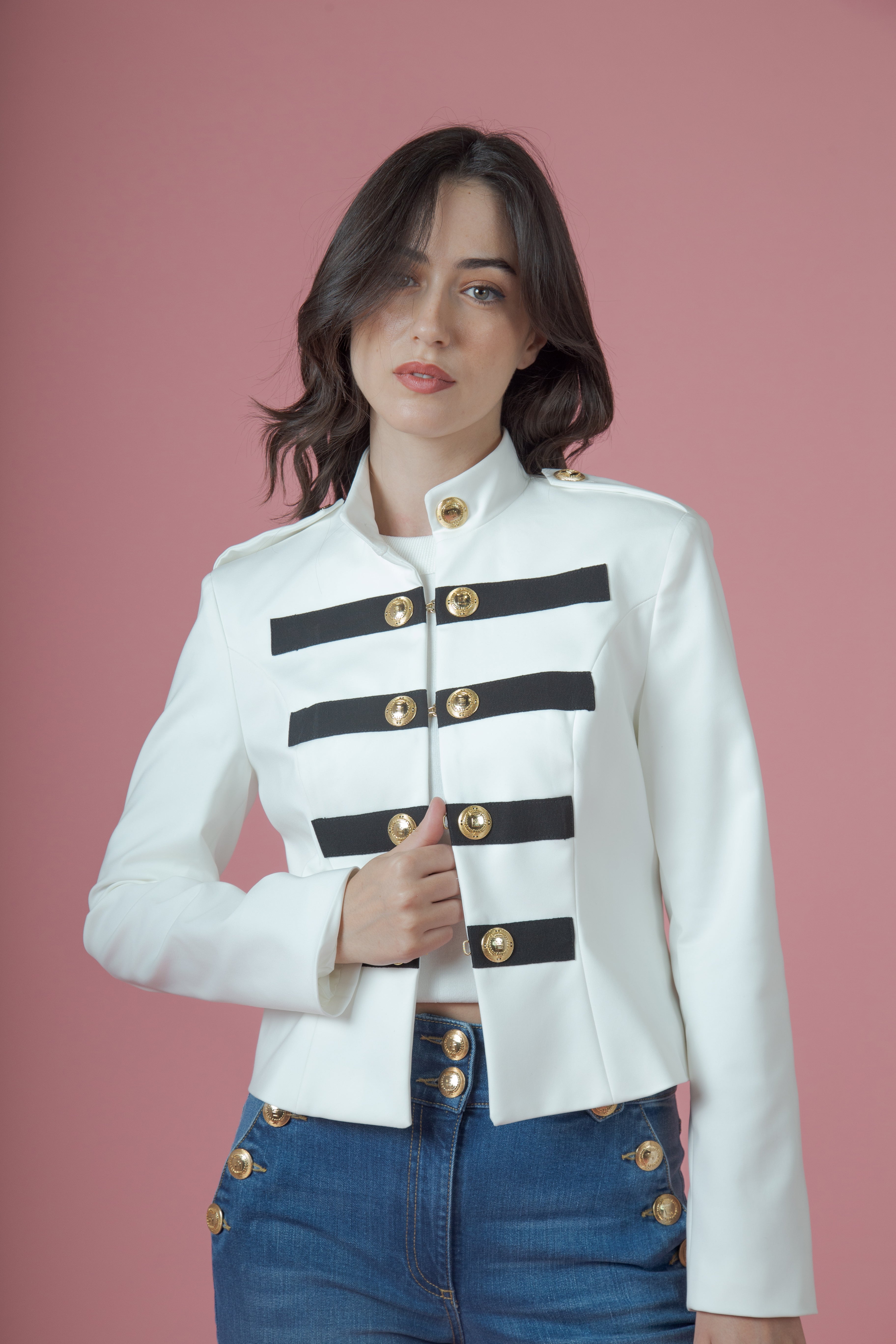 È una giacca che sembra custodire storie lontane, eco di viaggi e di eleganze senza tempo, reinterpretate con uno sguardo contemporaneo e deciso. L’ispirazione militare si percepisce subito, nella struttura rigorosa, nella compostezza delle linee, ma viene addolcita e nobilitata da dettagli preziosi che la trasformano in qualcosa di profondamente femminile.