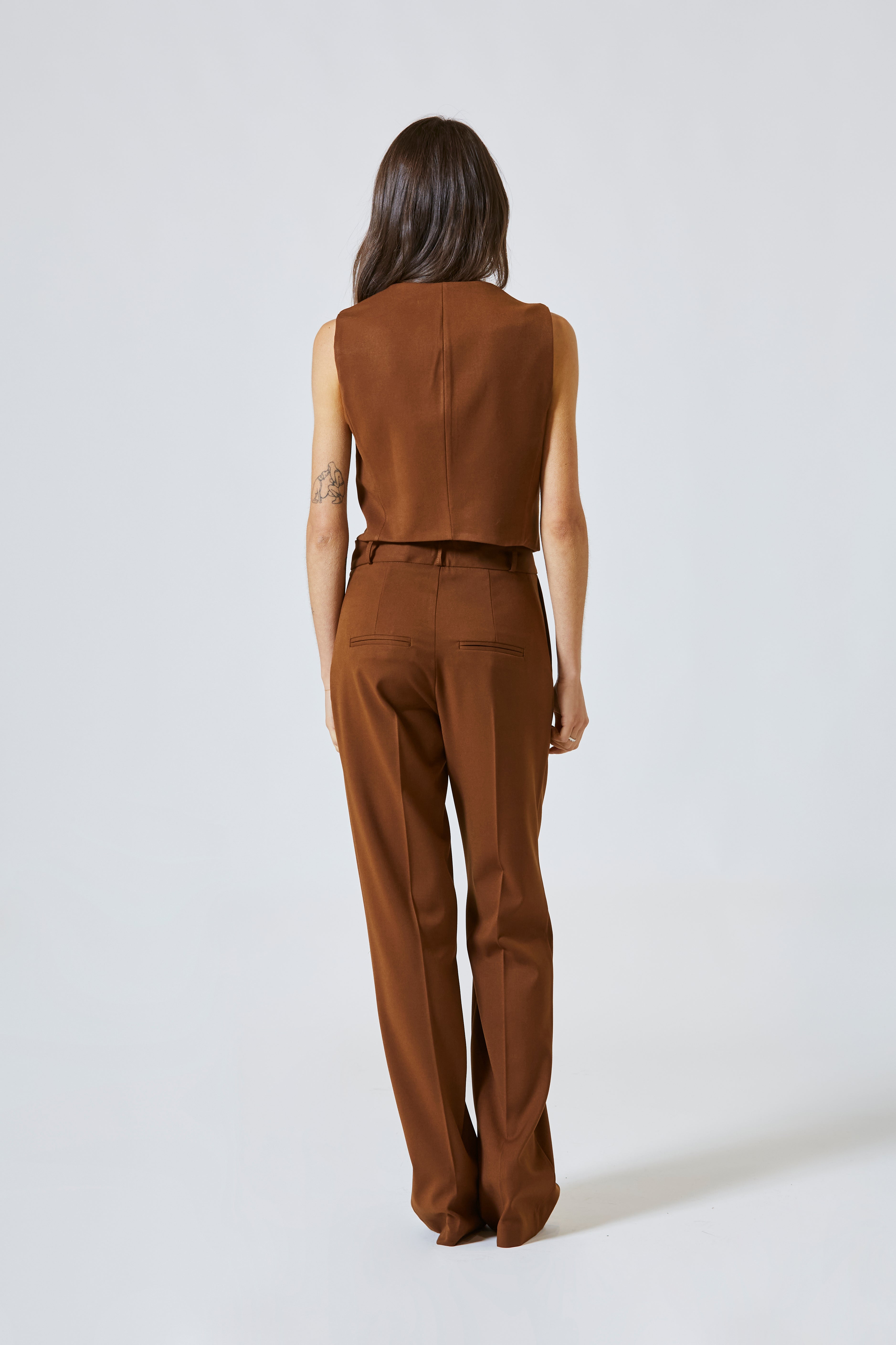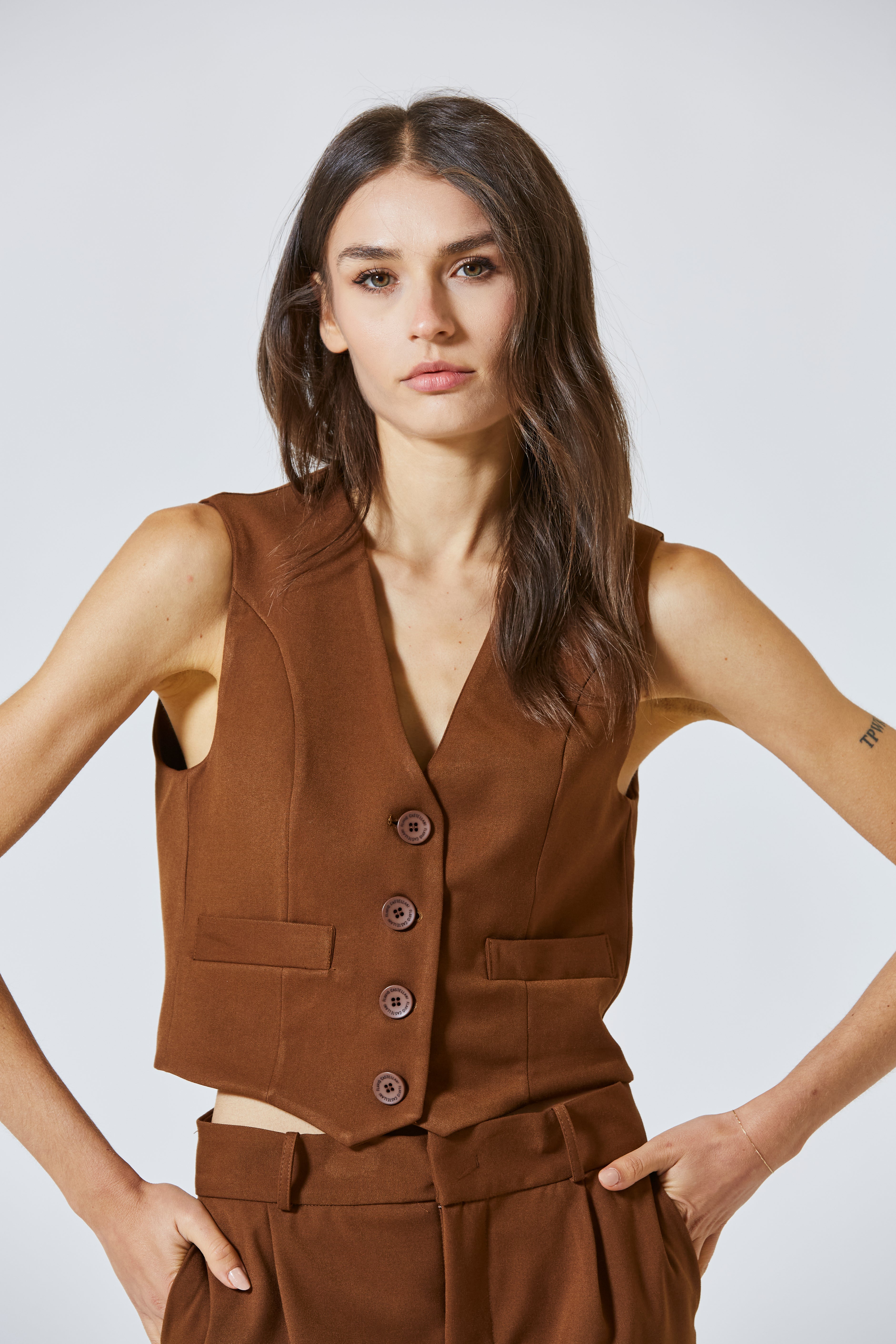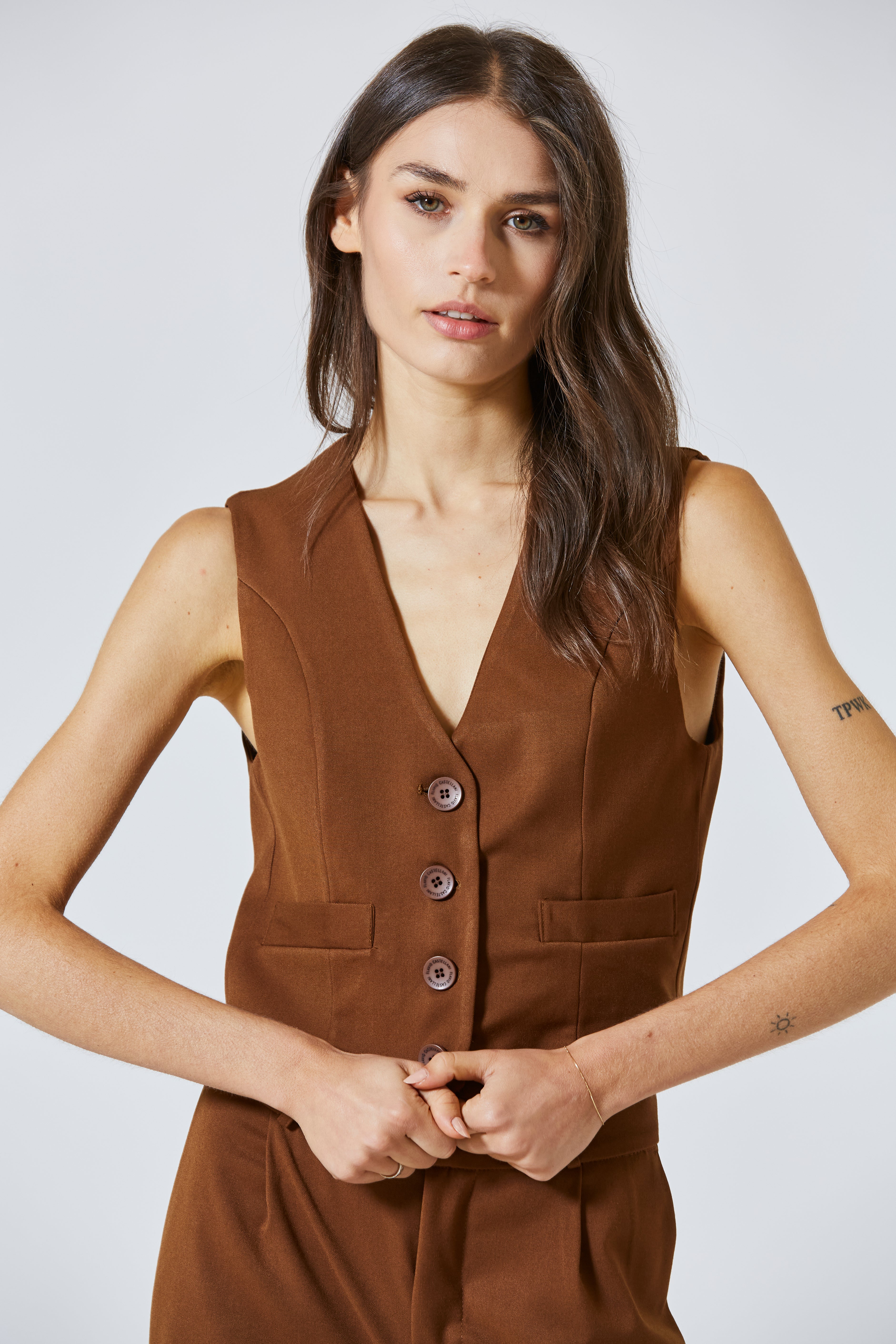 La linea è pulita, asciutta, precisa, pensata per seguire la silhouette con eleganza senza costrizione. Il taglio scivolato, leggermente affusolato in vita, accompagna il busto e definisce la figura, donando struttura a look morbidi e movimento a completi più formali. Il scollo profondo a V disegna il décolleté con sobrietà, lasciando spazio per una camicia classica, una blusa in seta o – per chi osa – anche una pelle nuda sotto la giacca.