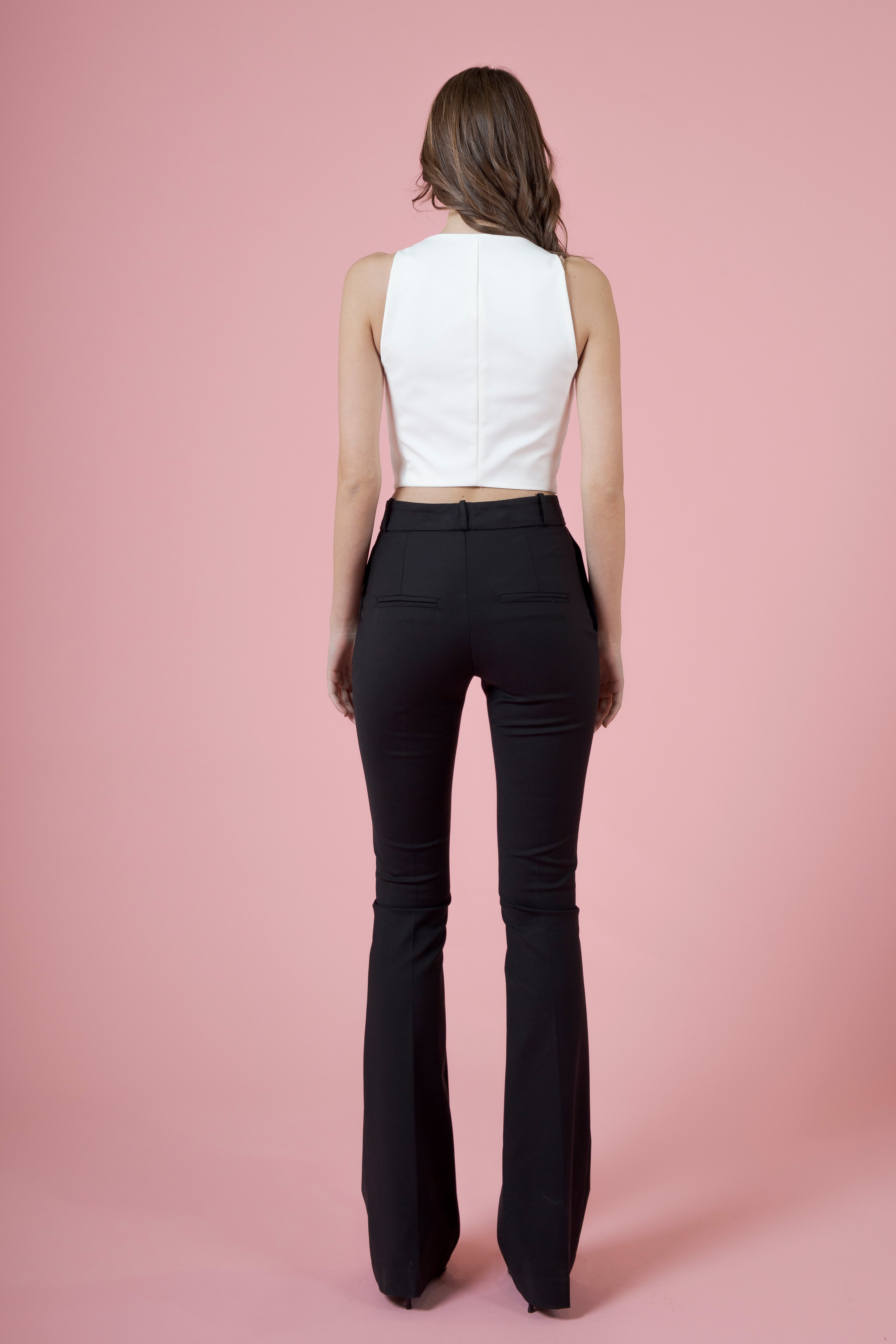È un gilet che sembra sospeso tra discrezione e seduzione, un capo che veste senza parlare troppo, lasciando che siano i dettagli a raccontare la sua storia. La linea è essenziale, pulita, pensata per accarezzare la figura senza opporre resistenza, mentre il profilo in pizzo nero a contrasto sullo scollo diventa la vera protagonista: un delicato sussurro di eleganza che incornicia il collo e il décolleté come un piccolo gioiello.