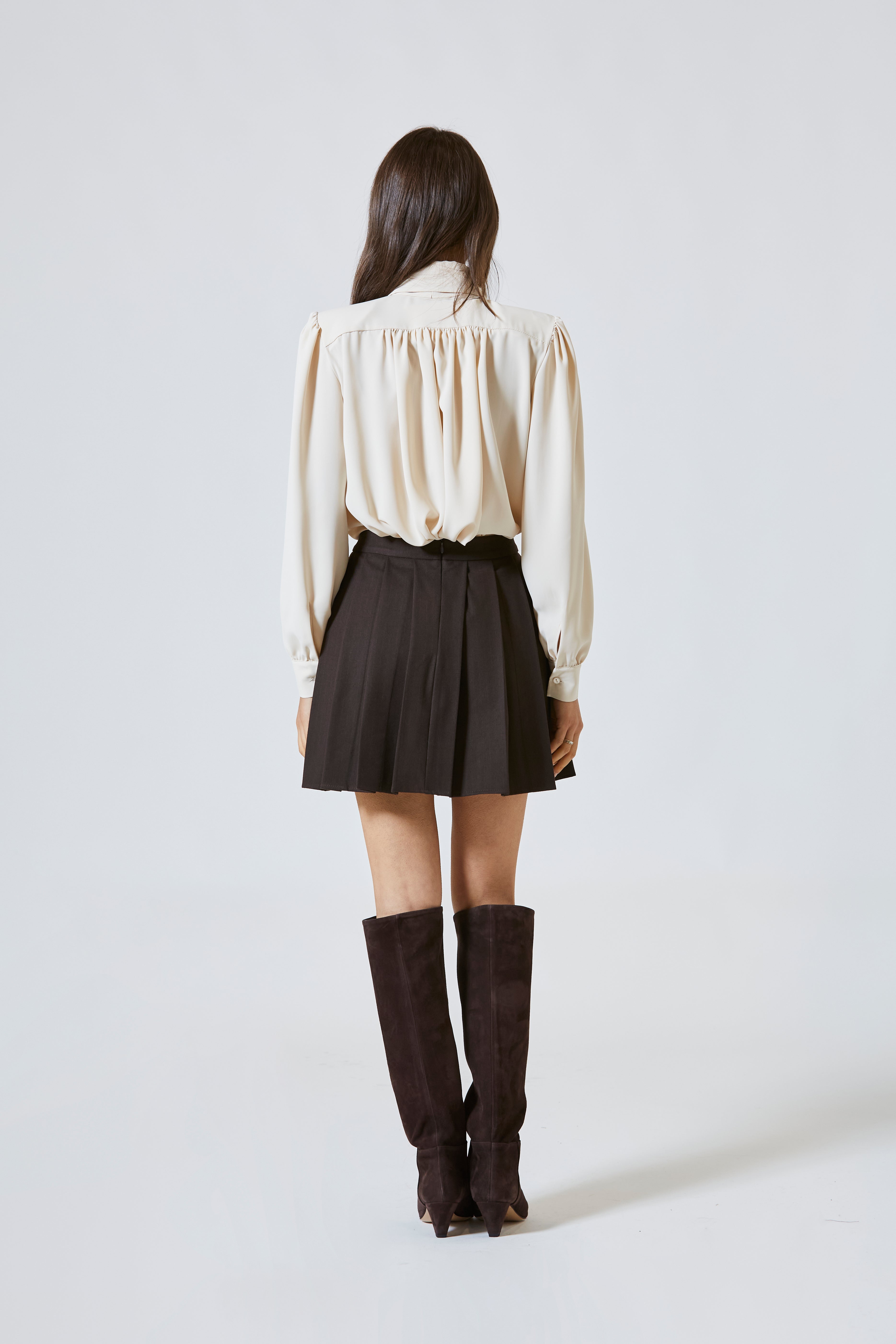 C’era un fascino deciso, quasi sartoriale, nella linea impeccabile di quella gonna corta a pieghe gessata. Un capo che univa la freschezza di un design moderno alla raffinatezza intramontabile del gusto maschile reinterpretato al femminile. Ogni dettaglio parlava di equilibrio: tra rigore e leggerezza, tra forza e grazia, tra il fascino del potere e la dolcezza della femminilità.