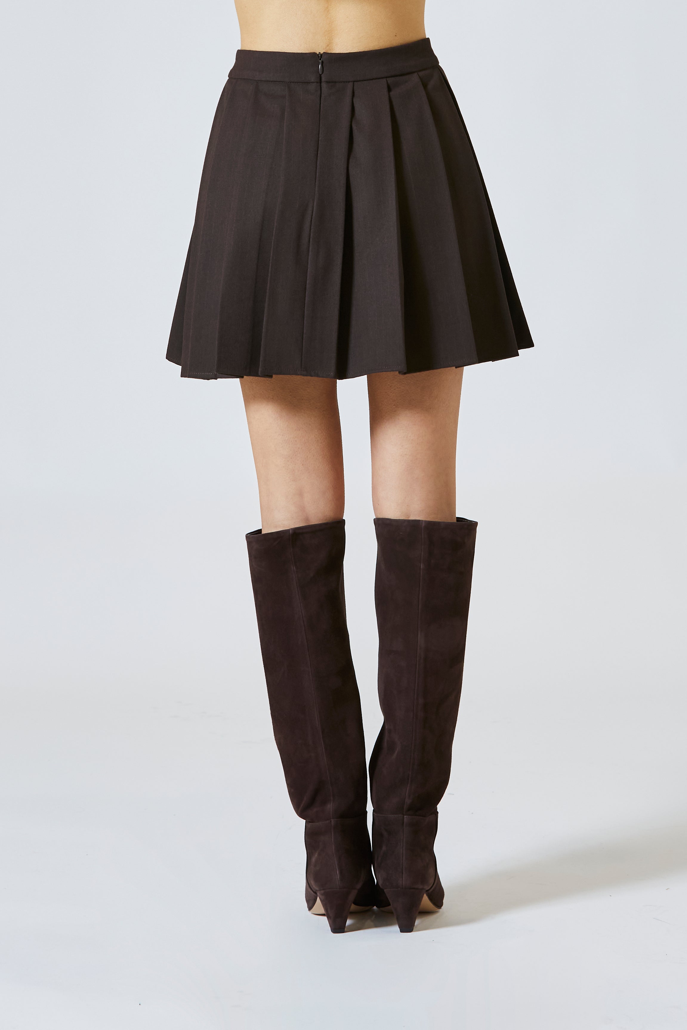 Il taglio corto, pulito e proporzionato, rendeva la gonna a pieghe gessata perfetta da indossare con una camicia fluida o una maglia a costine, ma anche con la sua giacca doppiopetto coordinata, per un look completo, sofisticato e di carattere.