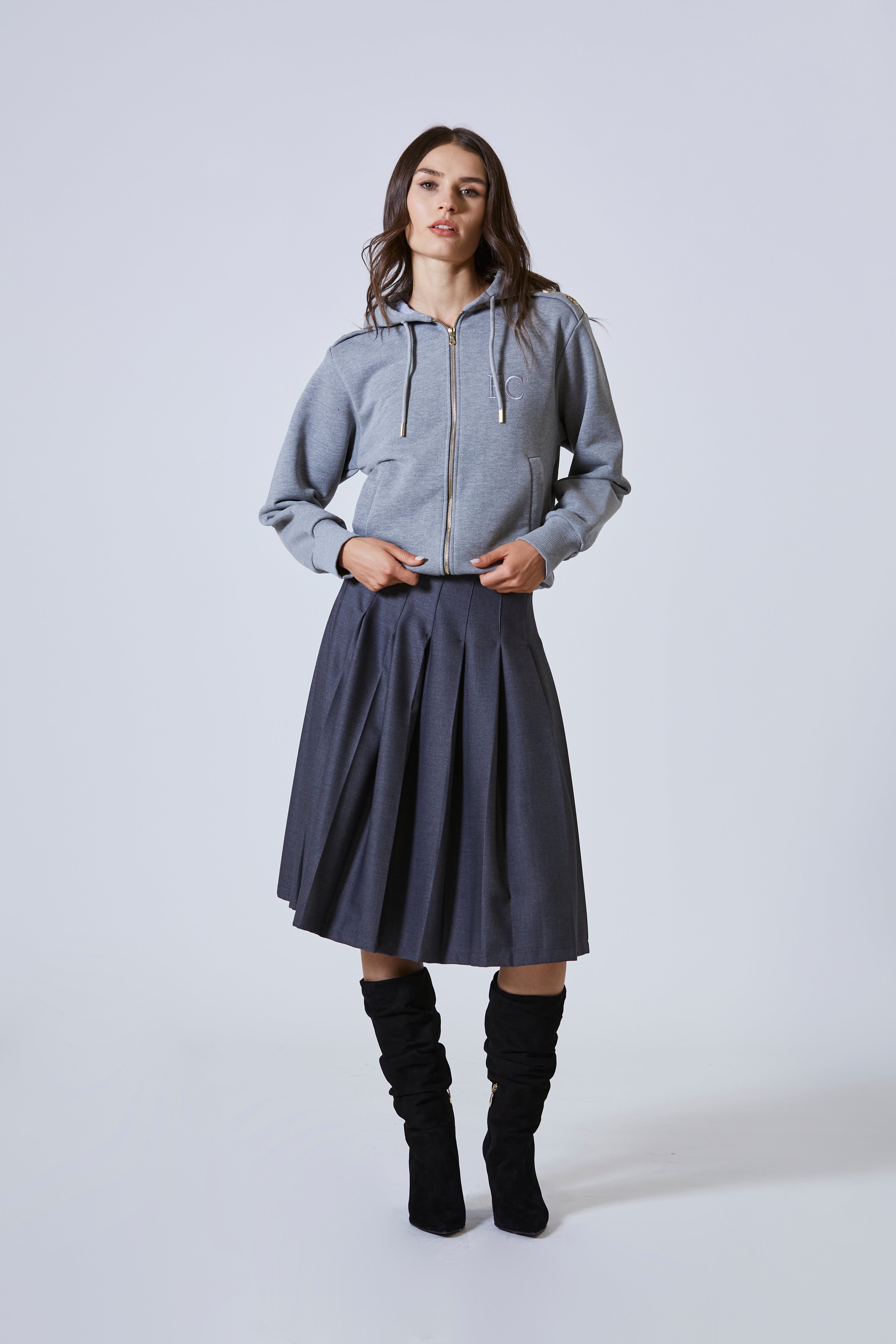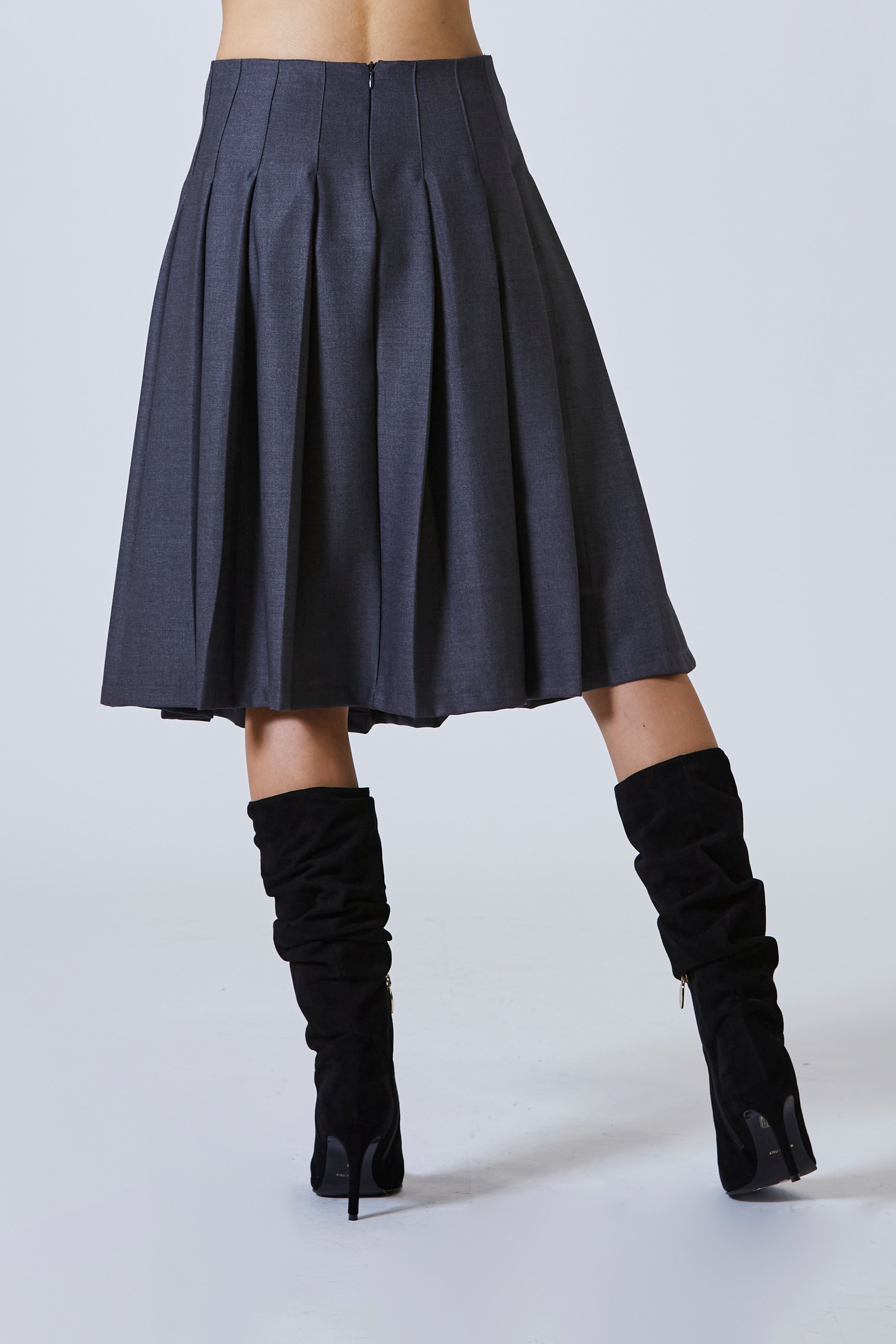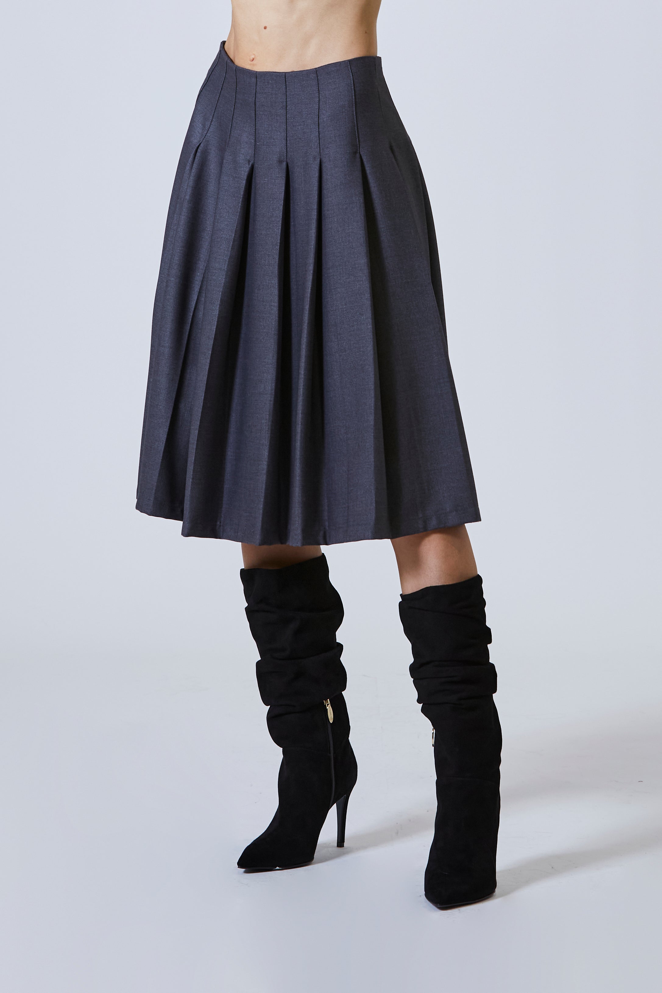 Ogni piega è un segno di cura sartoriale, pensata non solo per l’effetto estetico ma anche per il movimento: al camminare, al ruotare del busto, al vento che sfiora il tessuto, la gonna risponde con leggerezza e presenza. È il capo che racconta un'eleganza quotidiana, fatta di equilibrio e stile.