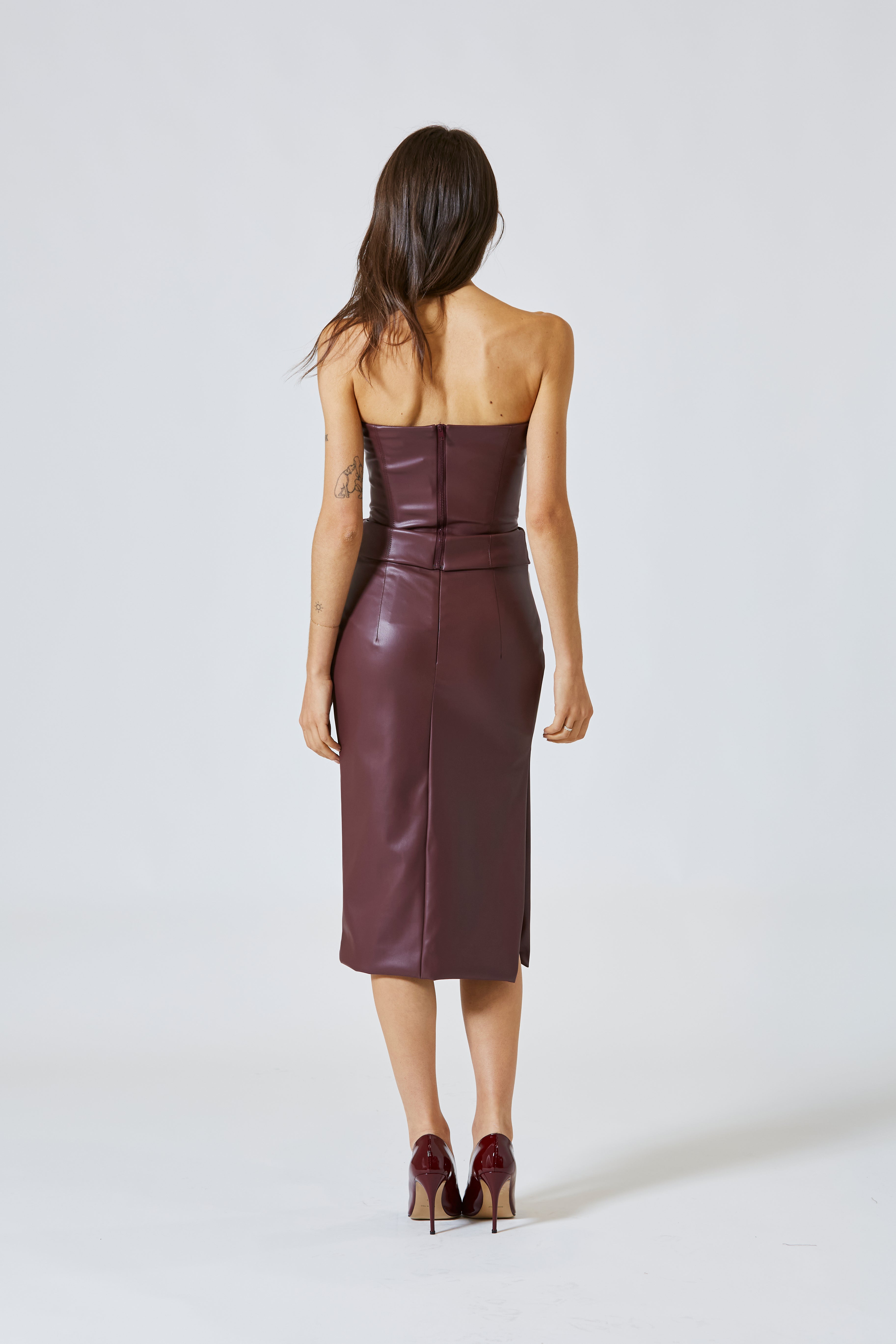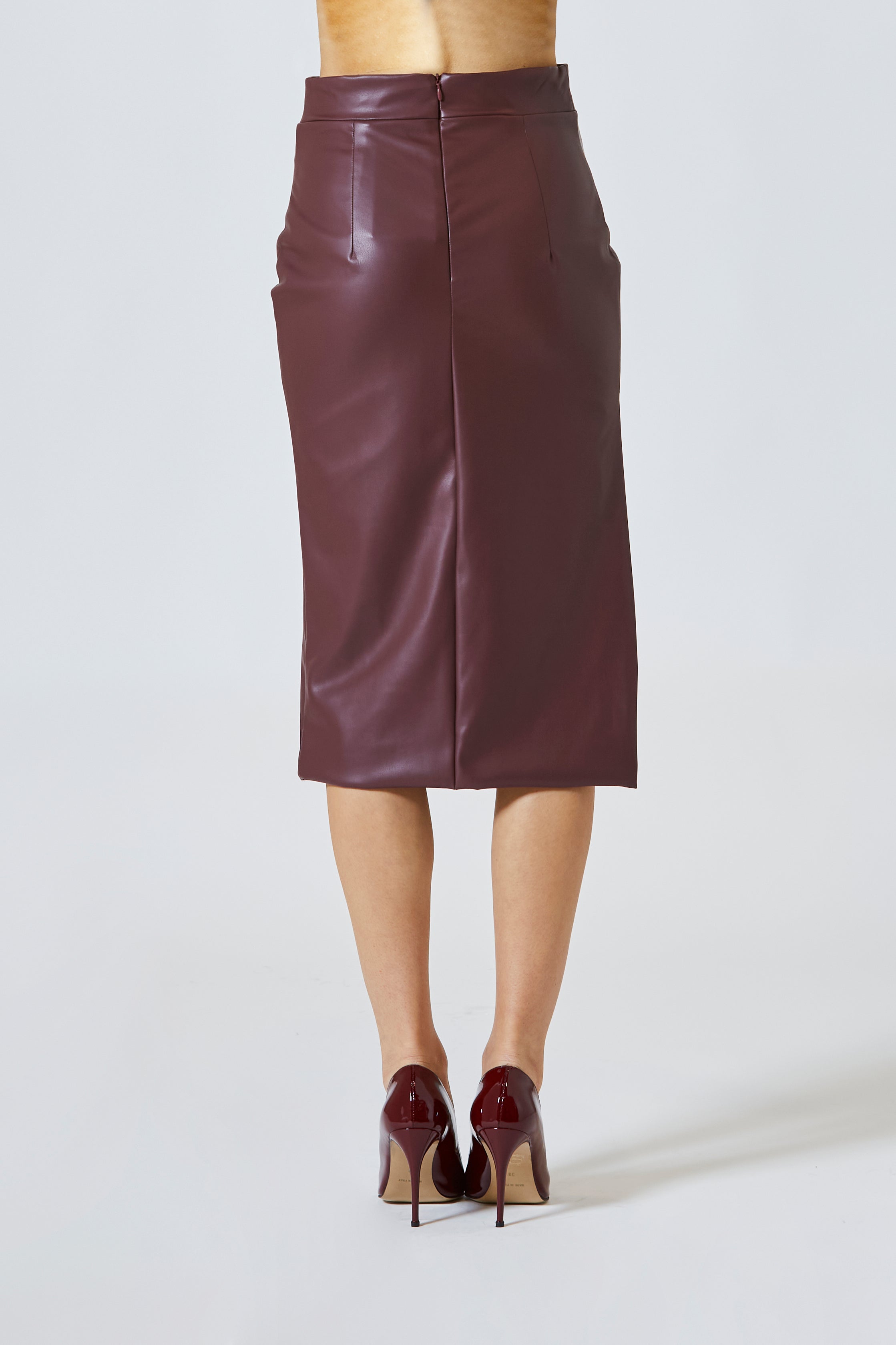 Realizzata in una morbida ecopelle dalla finitura satinata, questa gonna abbraccia la silhouette con una struttura precisa e femminile, valorizzando il punto vita grazie al suo taglio a vita alta. Il tessuto segue le linee del corpo con fermezza e flessibilità, regalando una sensazione di potere e raffinatezza al tempo stesso.