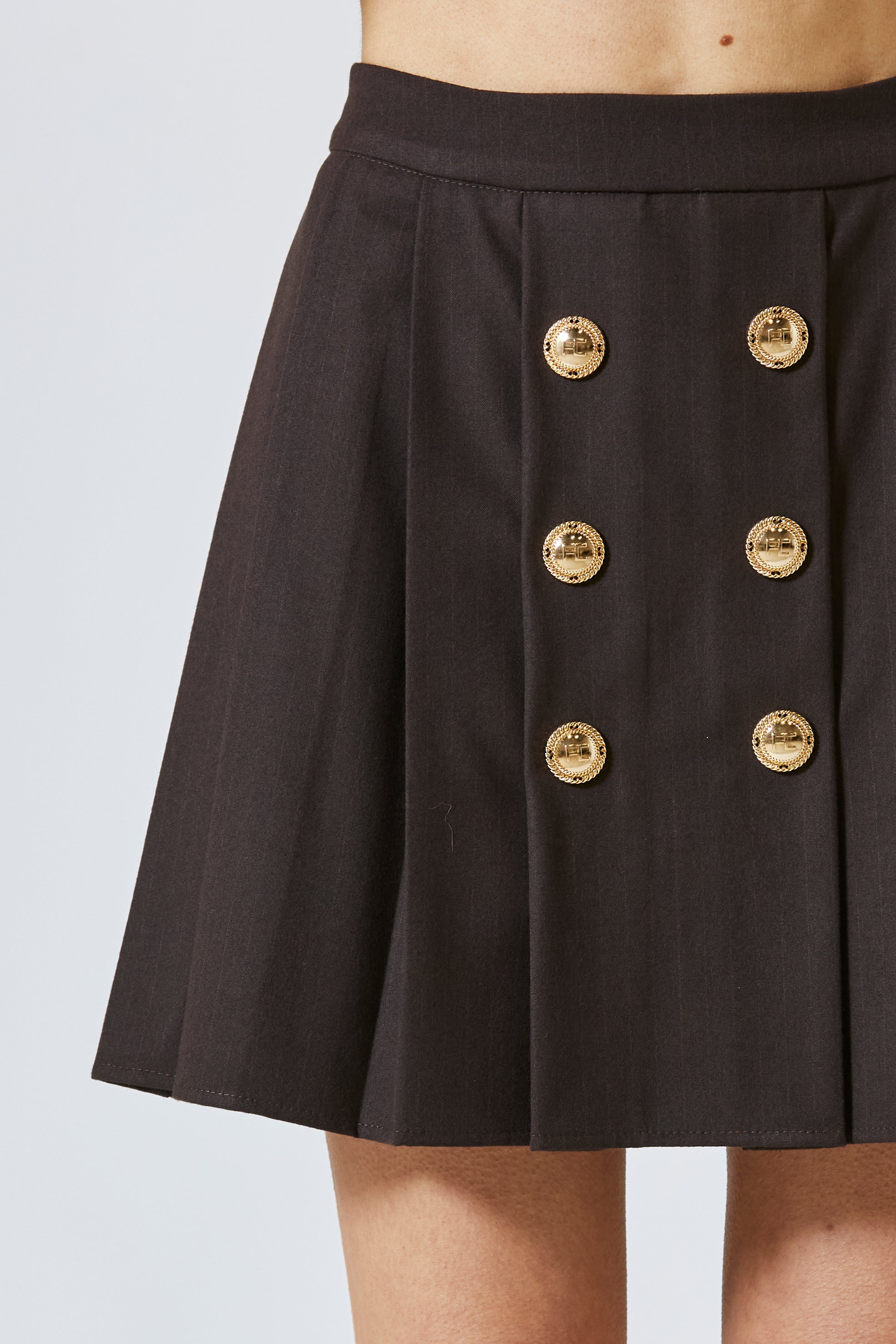 La lunghezza mini è audace ma mai eccessiva, perfettamente bilanciata dal rigore delle righe gessate e dalla struttura delle pieghe. Una gonna pensata per donne che amano un look deciso, curato, ma sempre in movimento.