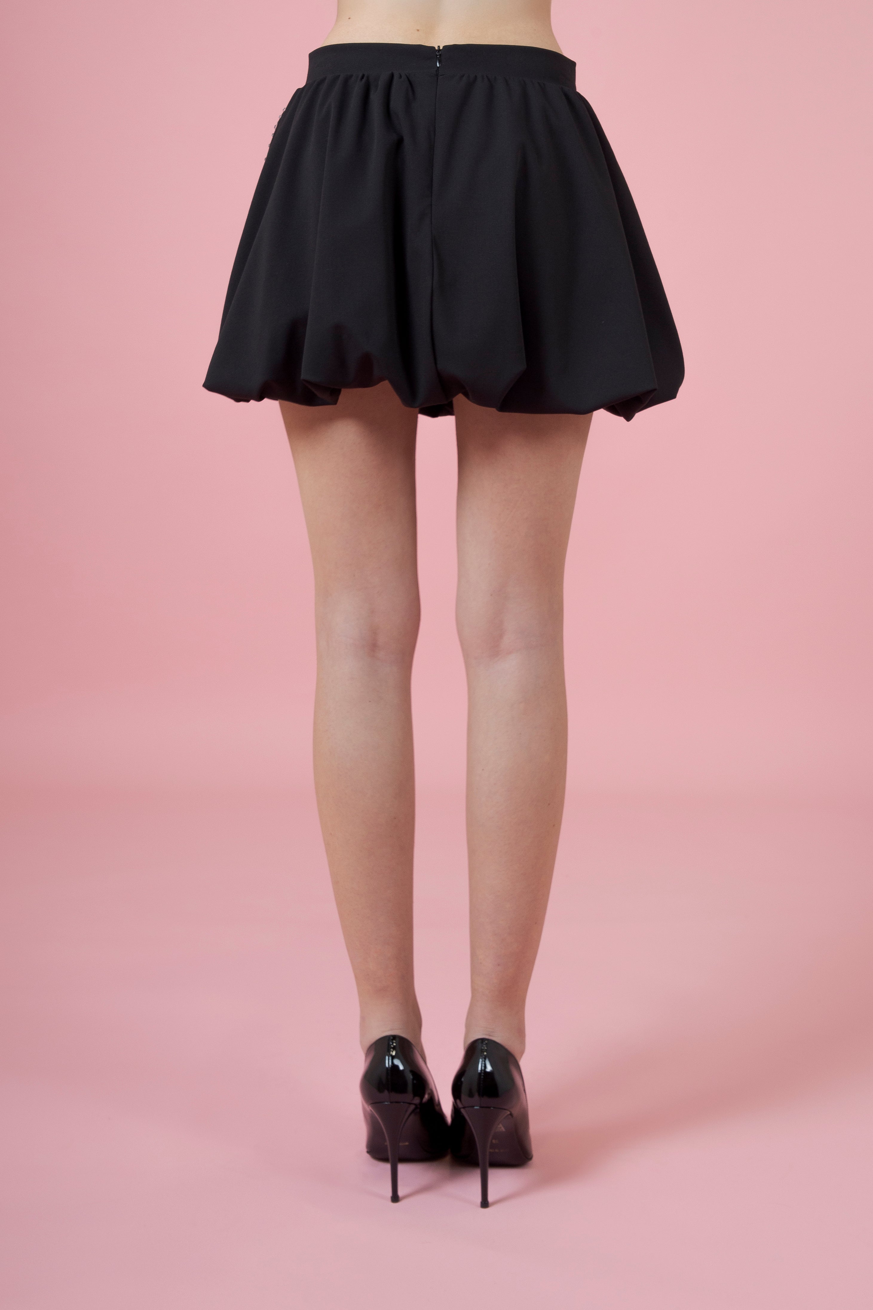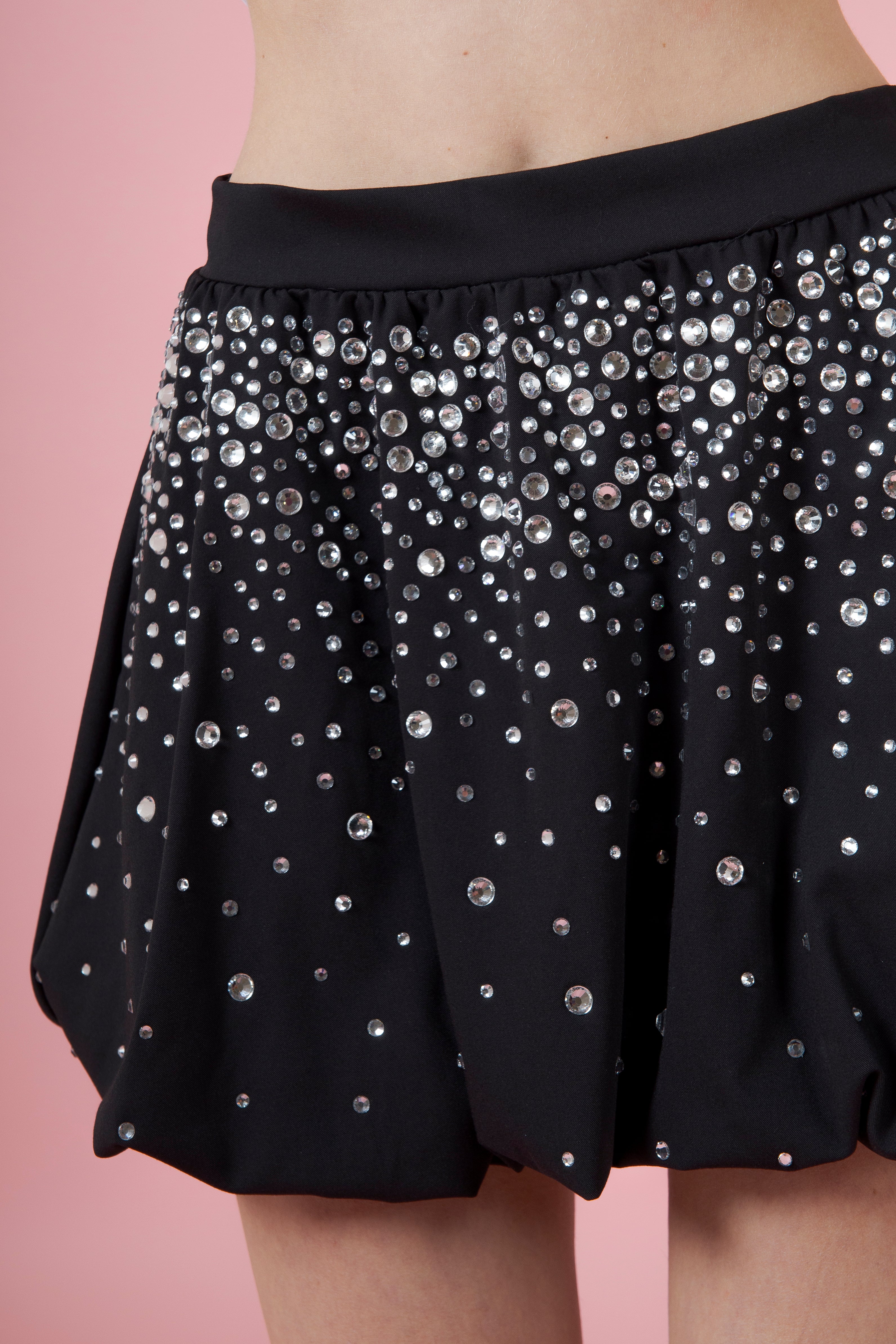 Immagina una gonna corta a palloncino con applicazioni di strass come un piccolo bagliore catturato dall’aria, un sogno che prende forma e danza insieme a te. La sua linea a palloncino sembra trattenere un respiro leggero, un’onda di tessuto che si gonfia con delicatezza ad ogni movimento, creando un gioco di volumi che è poesia in azione. Ogni passo diventa un gesto sospeso, una piccola coreografia invisibile che racconta eleganza e leggerezza.