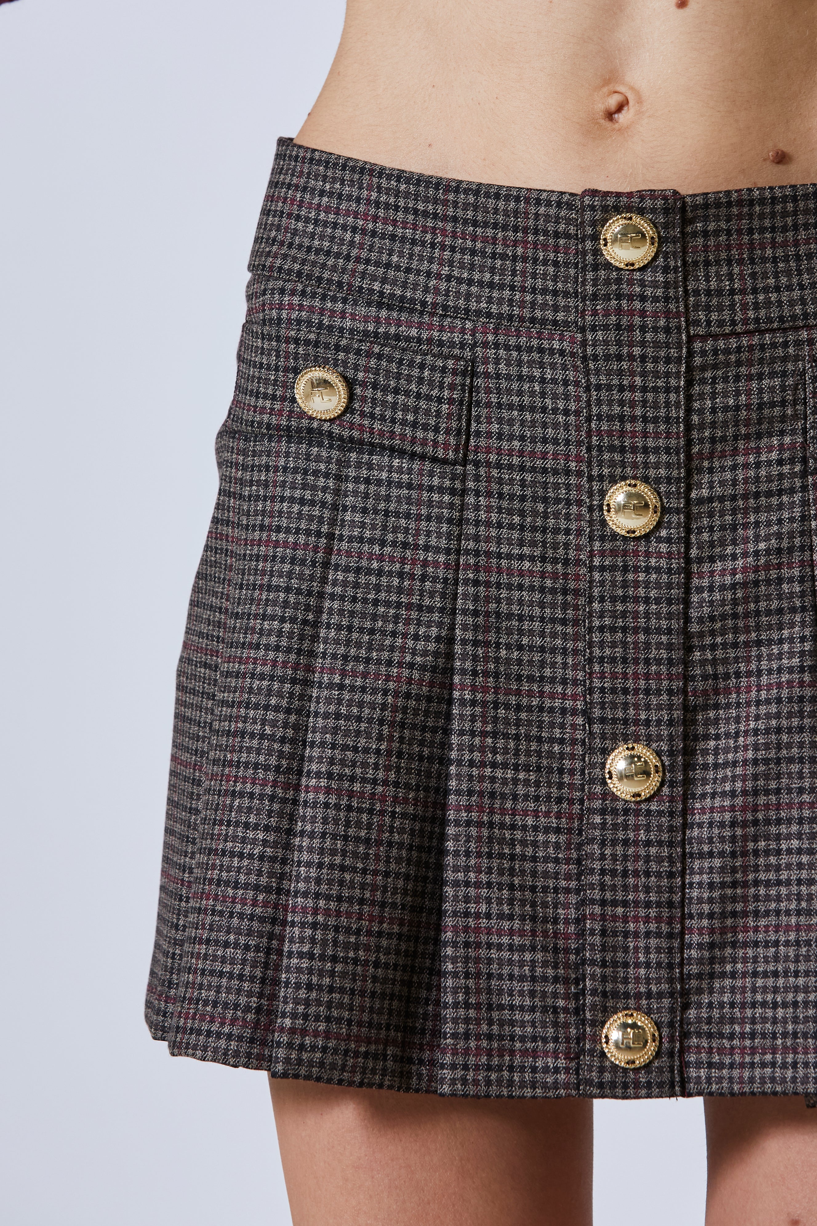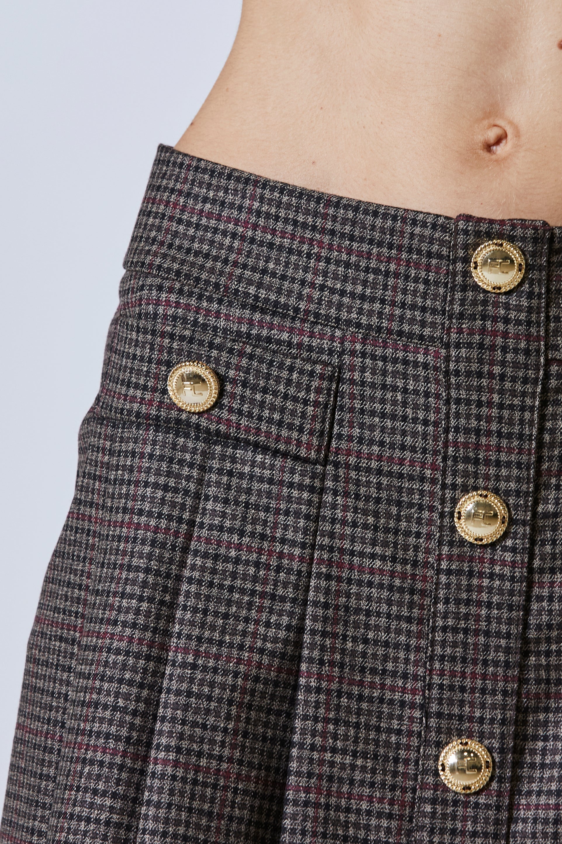Sui lati, due tasche appena accennate ma perfettamente integrate nella struttura. Anche lì, due bottoni oro, gemelli silenziosi di quelli in vita, a completare il disegno con simmetria intelligente. Erano dettagli che dicevano molto più di quanto mostrassero — come sguardi brevi, carichi di sottintesi.