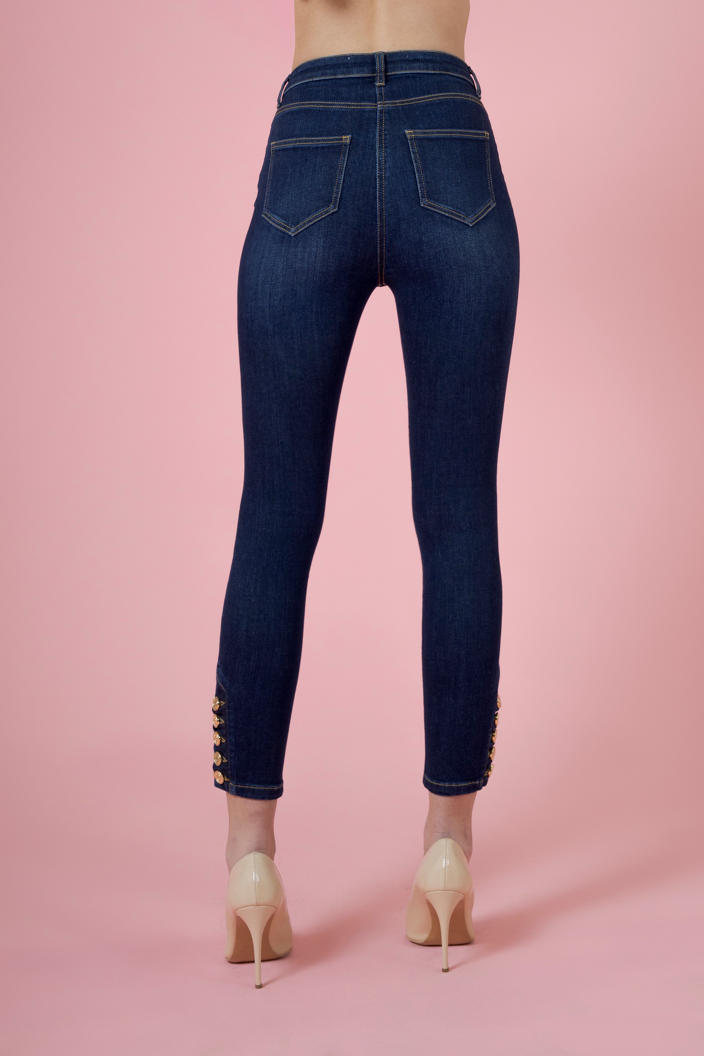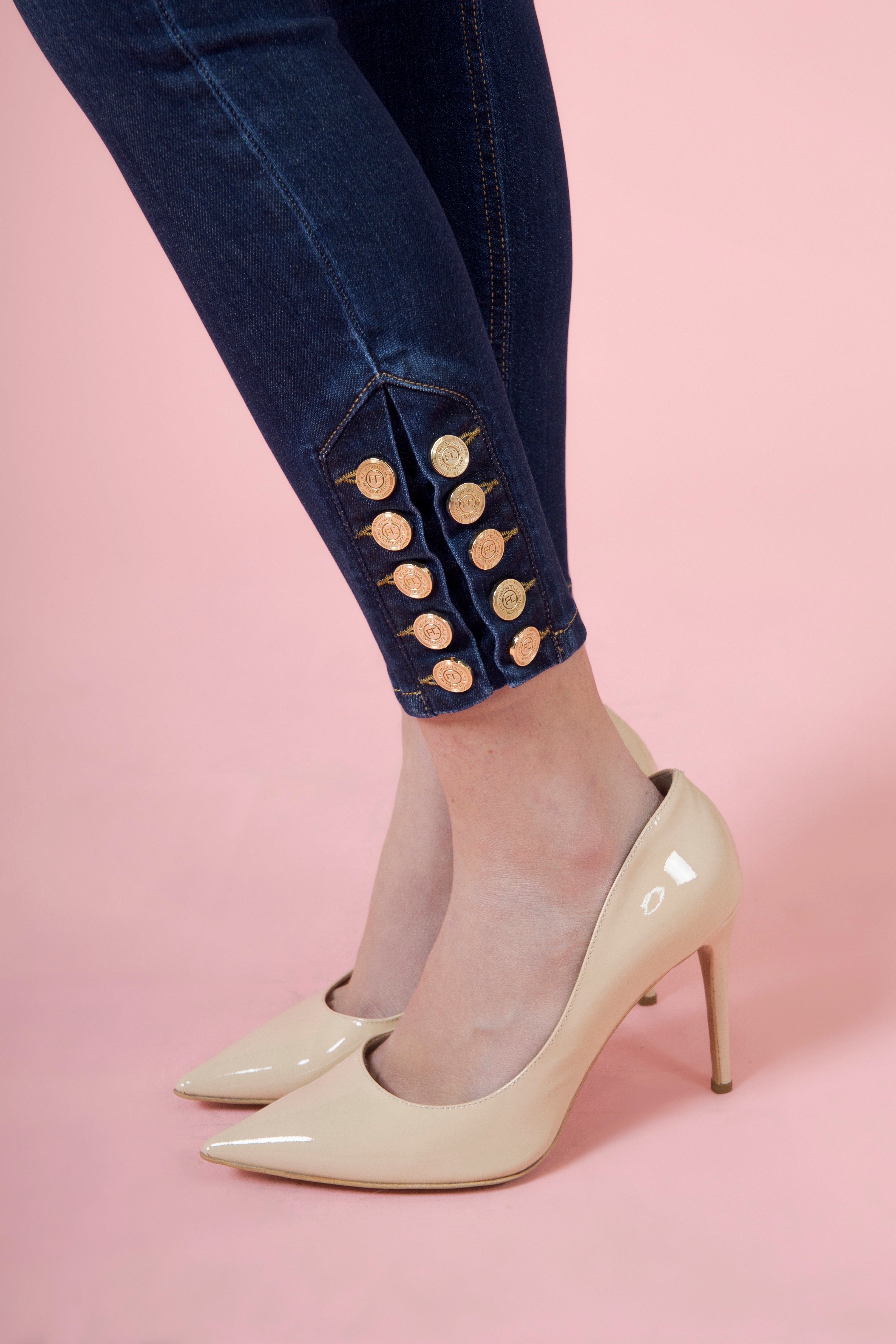 A impreziosire l’orlo, proprio lì dove il passo si fa gesto, brillano i bottoni dorati sulla caviglia, piccole scintille di luce che trasformano un capo essenziale in un dettaglio di stile ricercato. Sono come gioielli discreti, un tocco luminoso che accompagna il movimento del piede, un accento che cattura l’occhio senza mai rubare la scena. Ogni bottone è una nota d’oro sul pentagramma del denim, una firma elegante che conferisce carattere e personalità.