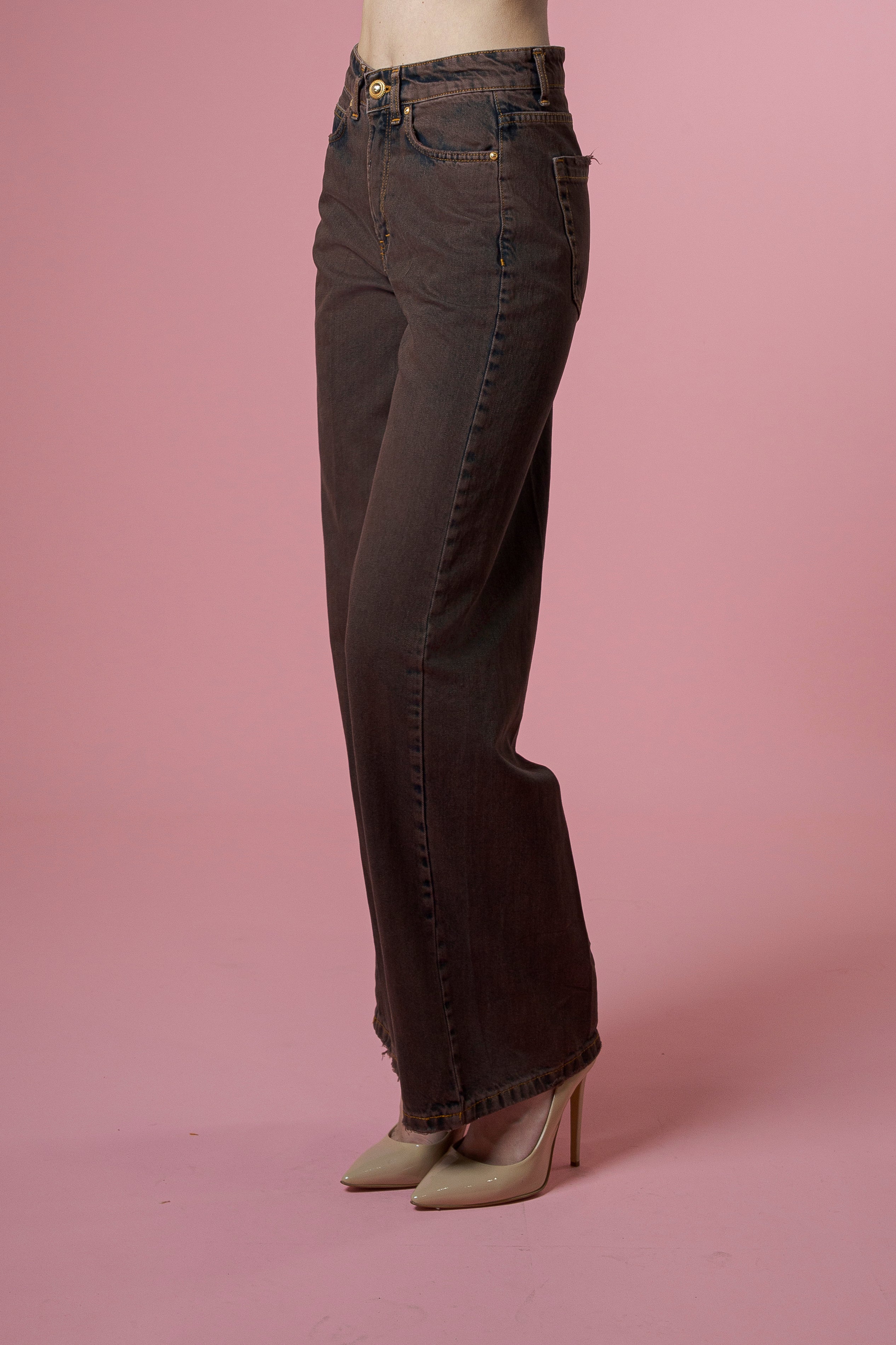 Immagina un jeans ampio dal lavaggio marrone stone wash che sembra catturare la memoria del tempo stesso, come se il tessuto avesse assorbito ogni passo, ogni gesto, ogni giornata trascorsa sotto il sole e tra le ombre. Non è un semplice denim: è un racconto da indossare.