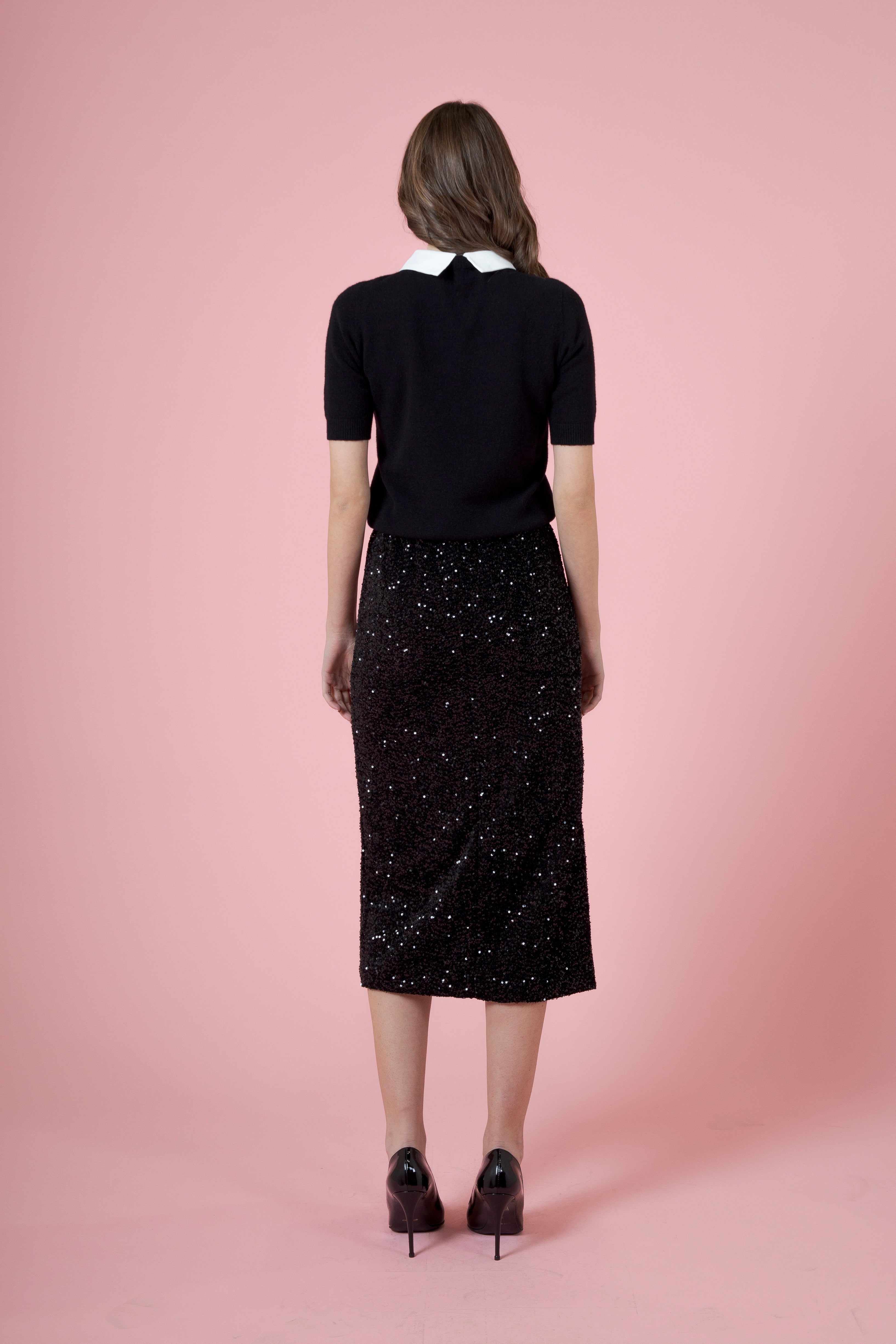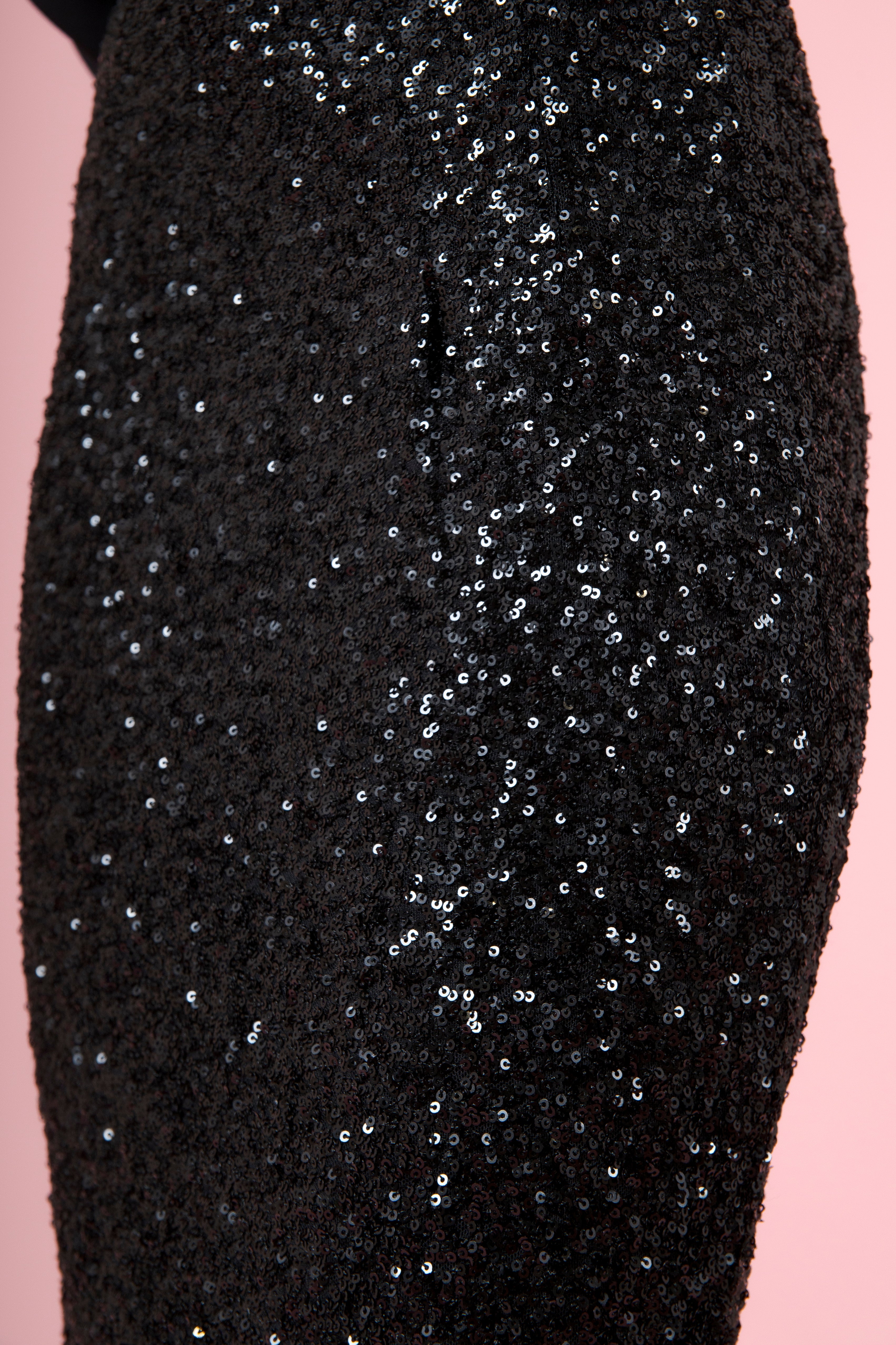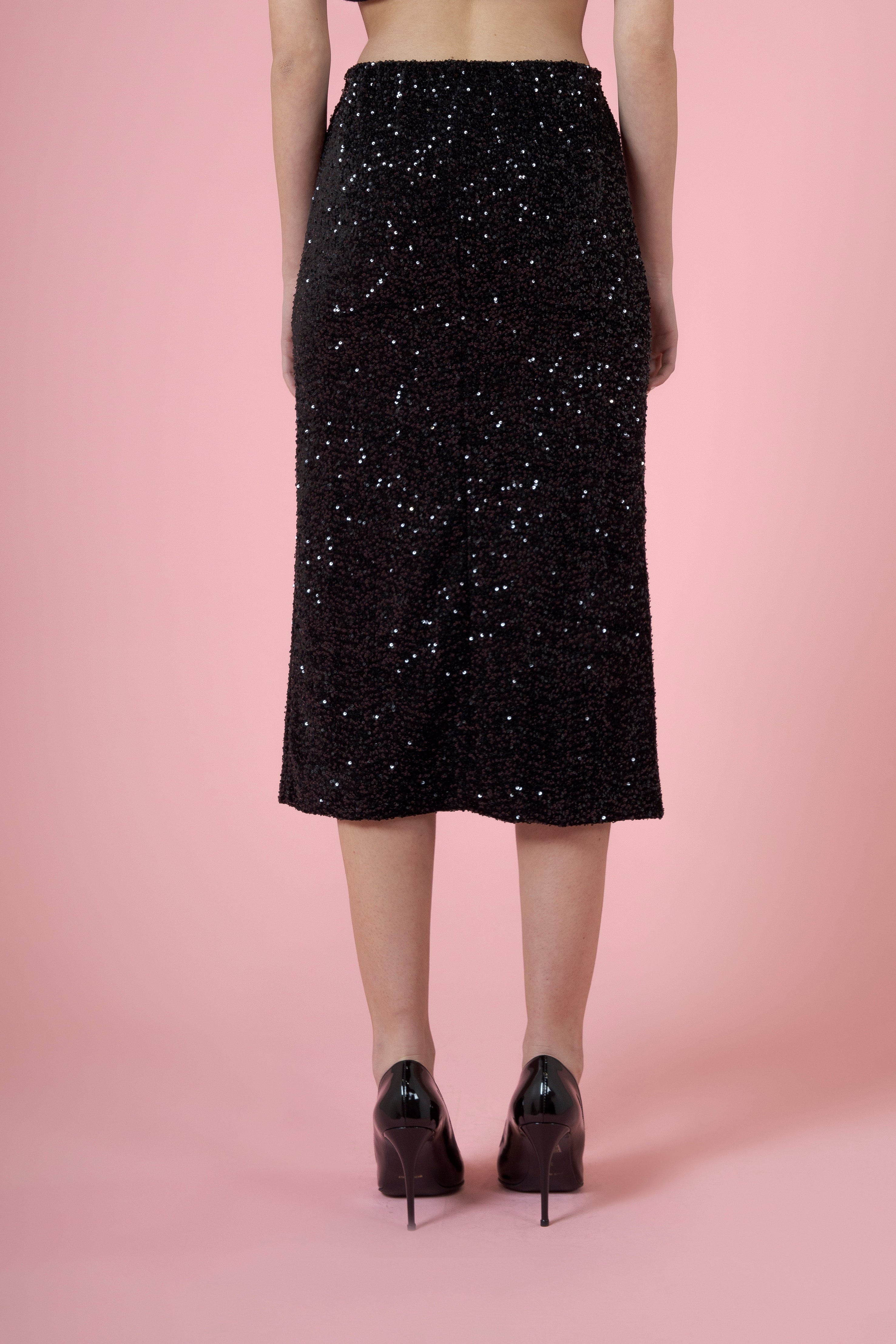 le paillettes, minuscoli specchi di luce, cuciti uno accanto all’altro come fossero piccoli segreti brillanti. A ogni passo si muovono, respirano, cambiano tono, regalando alla longuette una vitalità tutta sua, una vibrazione dorata o argentata che illumina chi la indossa.