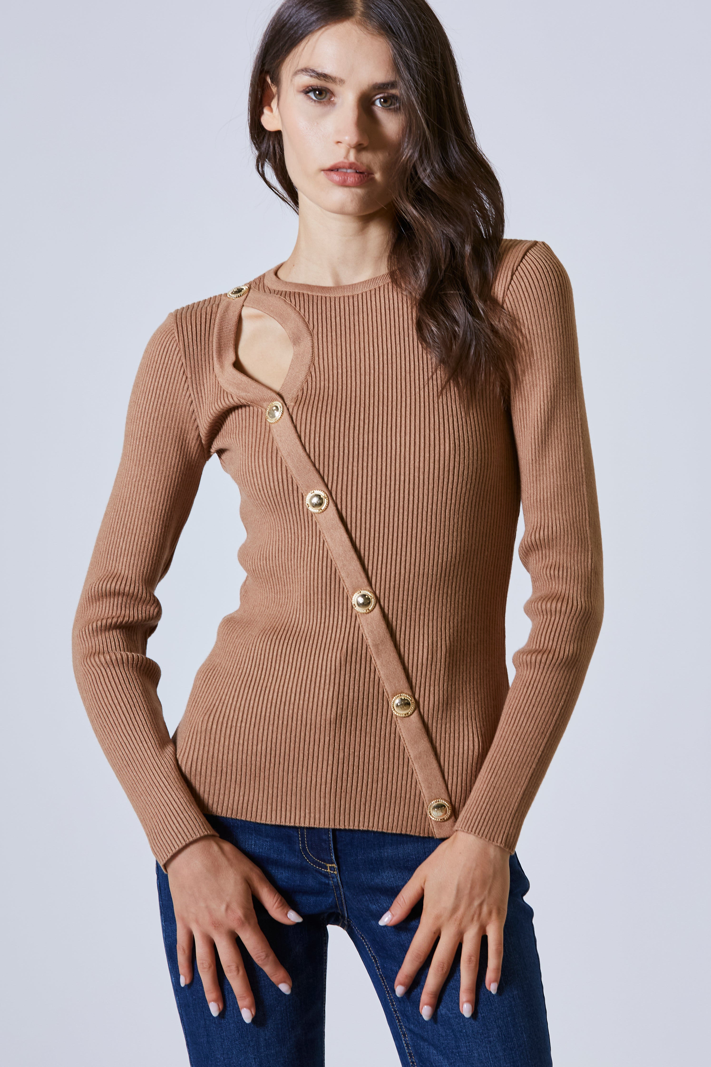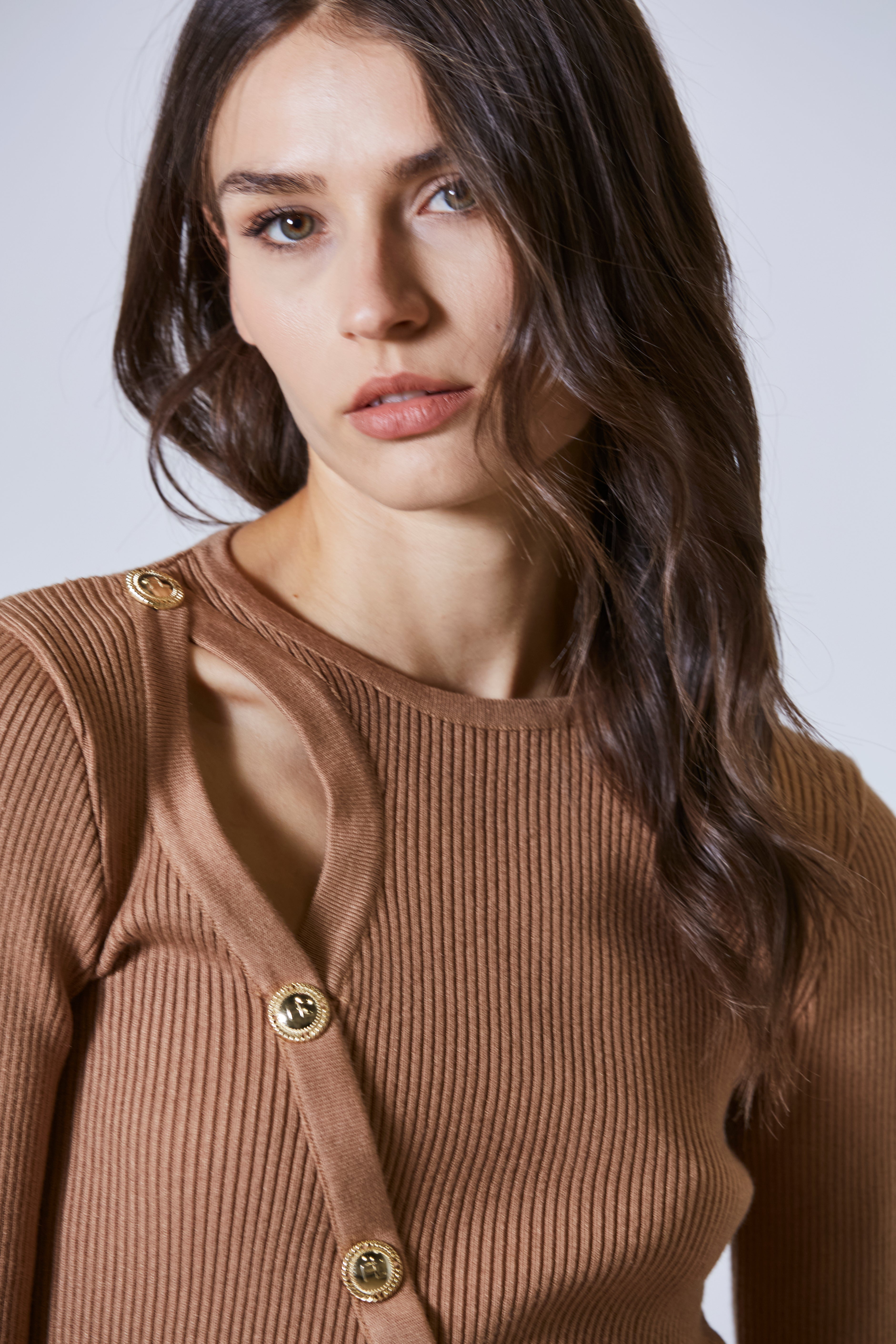 un’abbottonatura in diagonale, decisa ma raffinata, che attraversa la spalla come una linea di pensiero fuori dagli schemi.