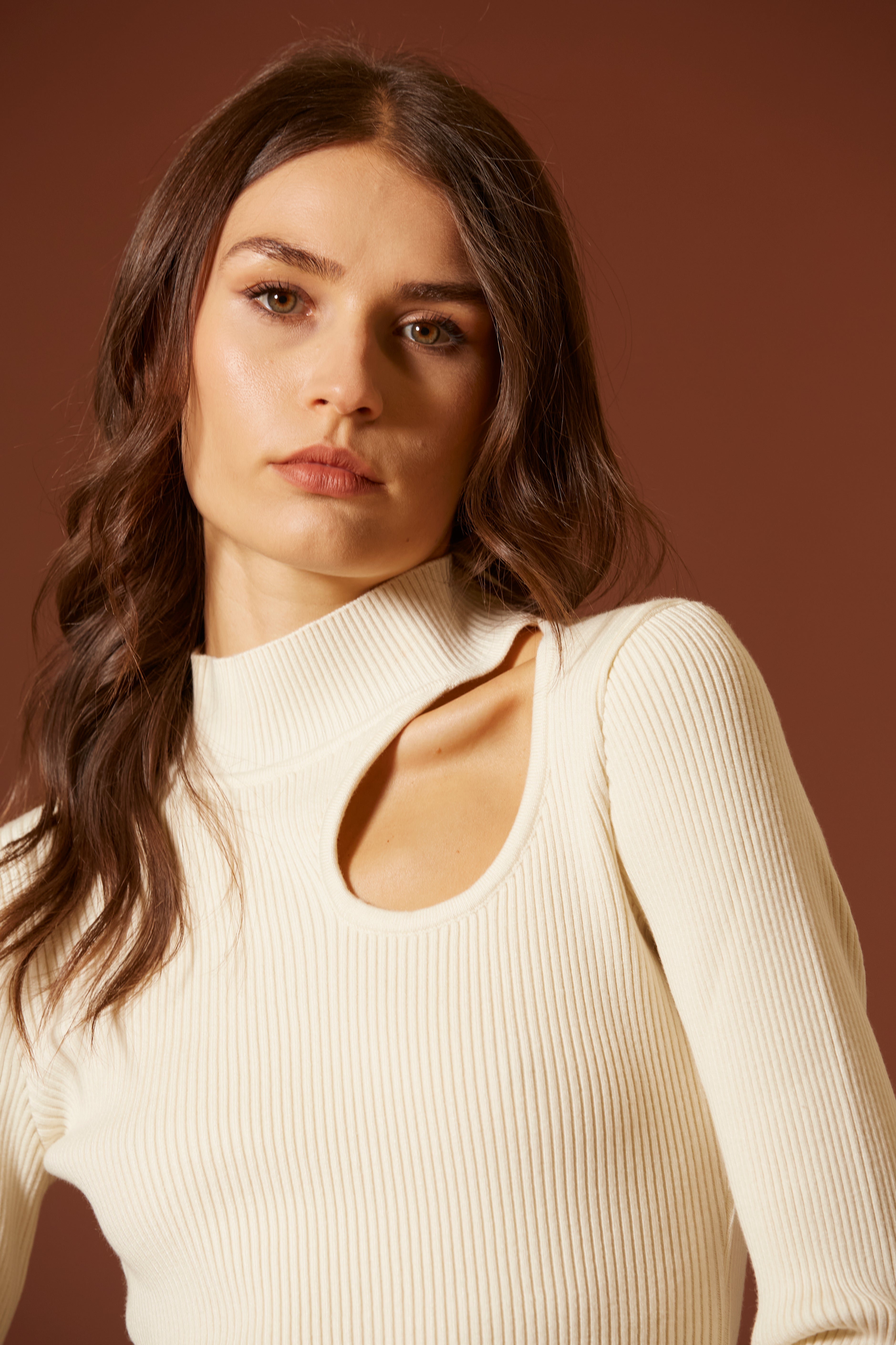 Era una maglia che non aveva bisogno di alzare la voce per farsi notare. Stava lì, silenziosa e sicura, come certe donne che non cercano l’attenzione, ma la raccolgono comunque, una distrazione alla volta. Costina fine, in un misto di viscosa che sembrava parlare la lingua della pelle, come se fosse stata pensata non tanto per essere indossata, quanto per appartenere.
