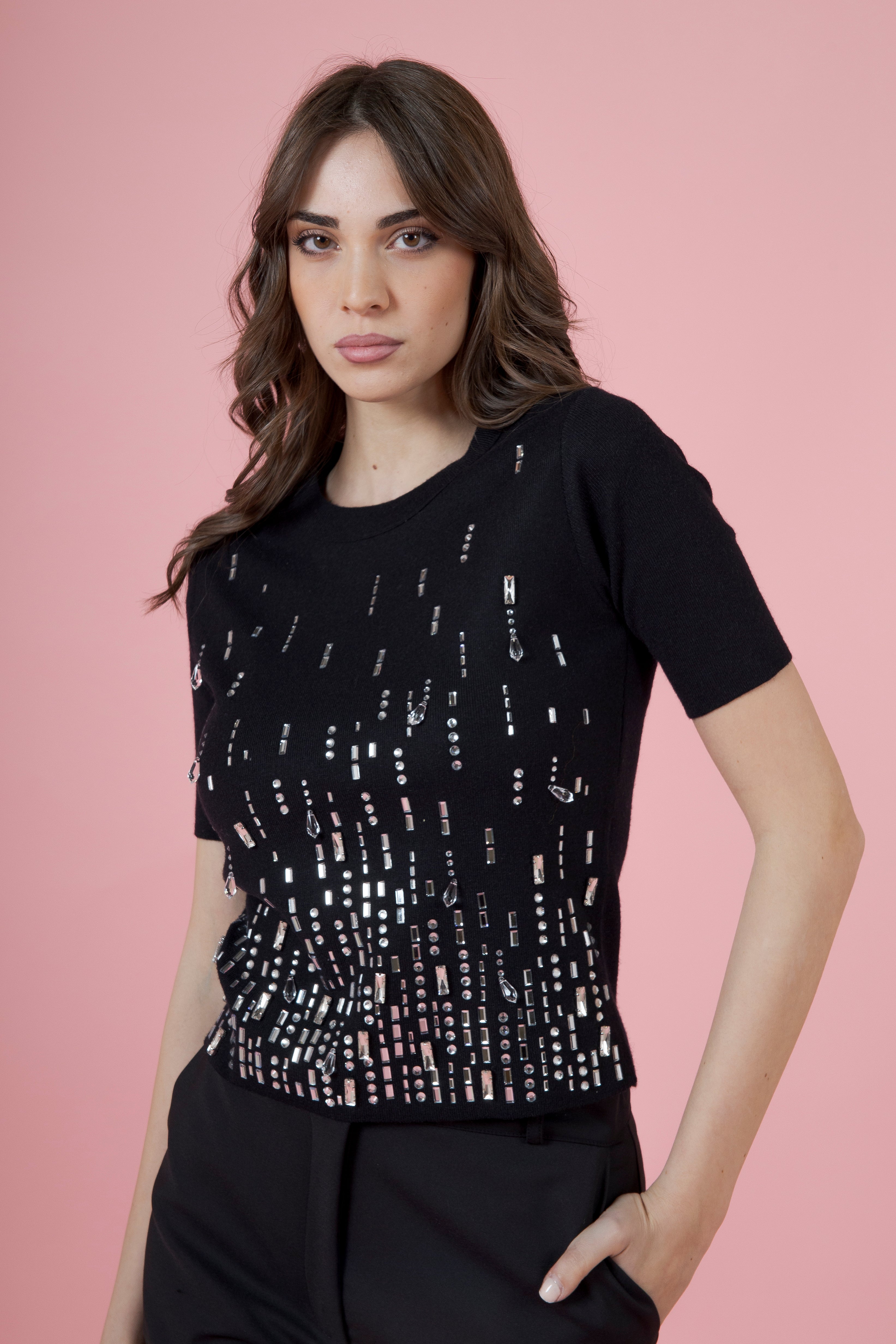 C’è una magia sottile in una maglia a manica corta con paricollo e ricamo di punti luce, qualcosa che non si vede subito ma si percepisce appena la si sfiora. Non è solo un capo: è un piccolo racconto di eleganza delicata, cucito con pazienza e attenzione nei dettagli.