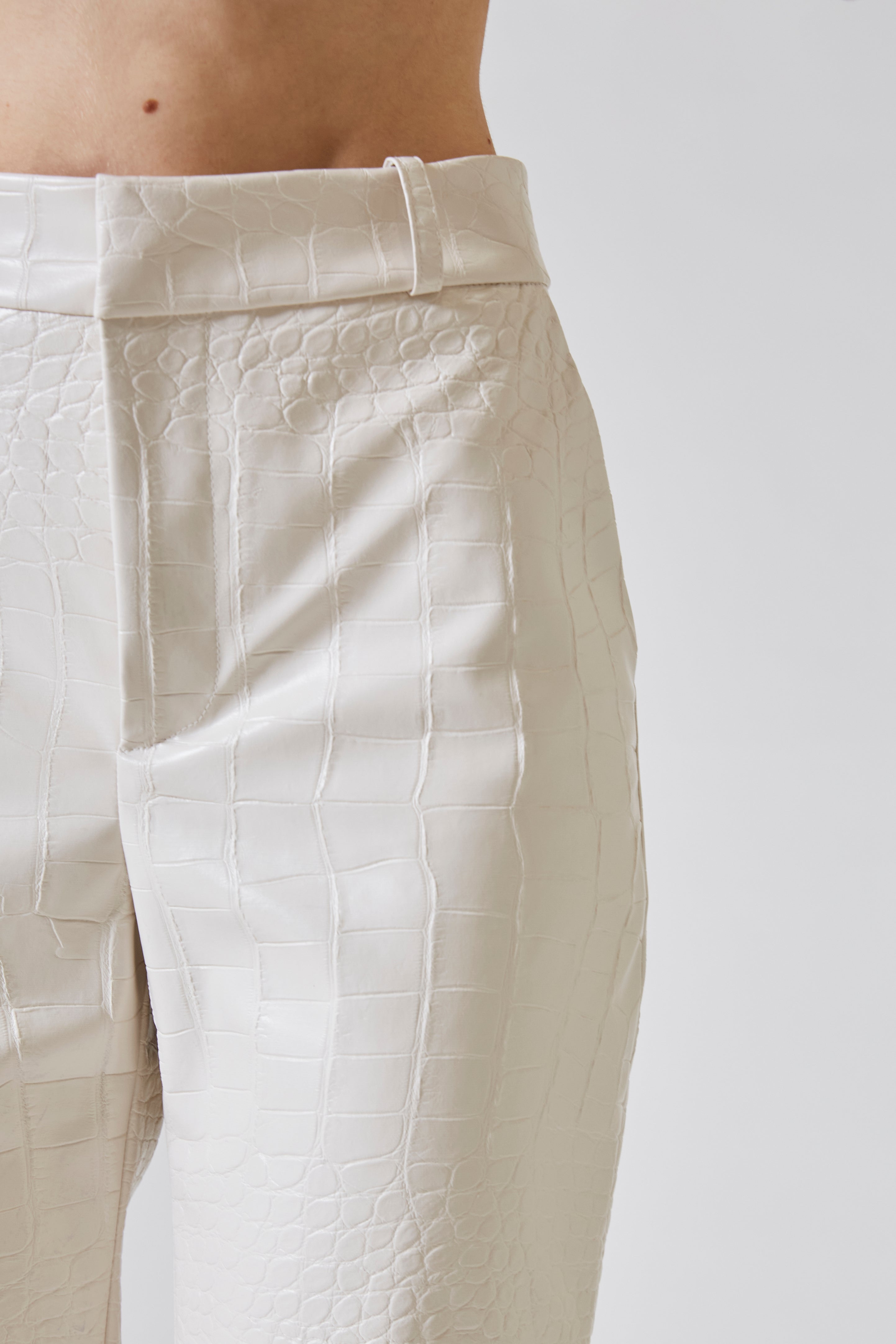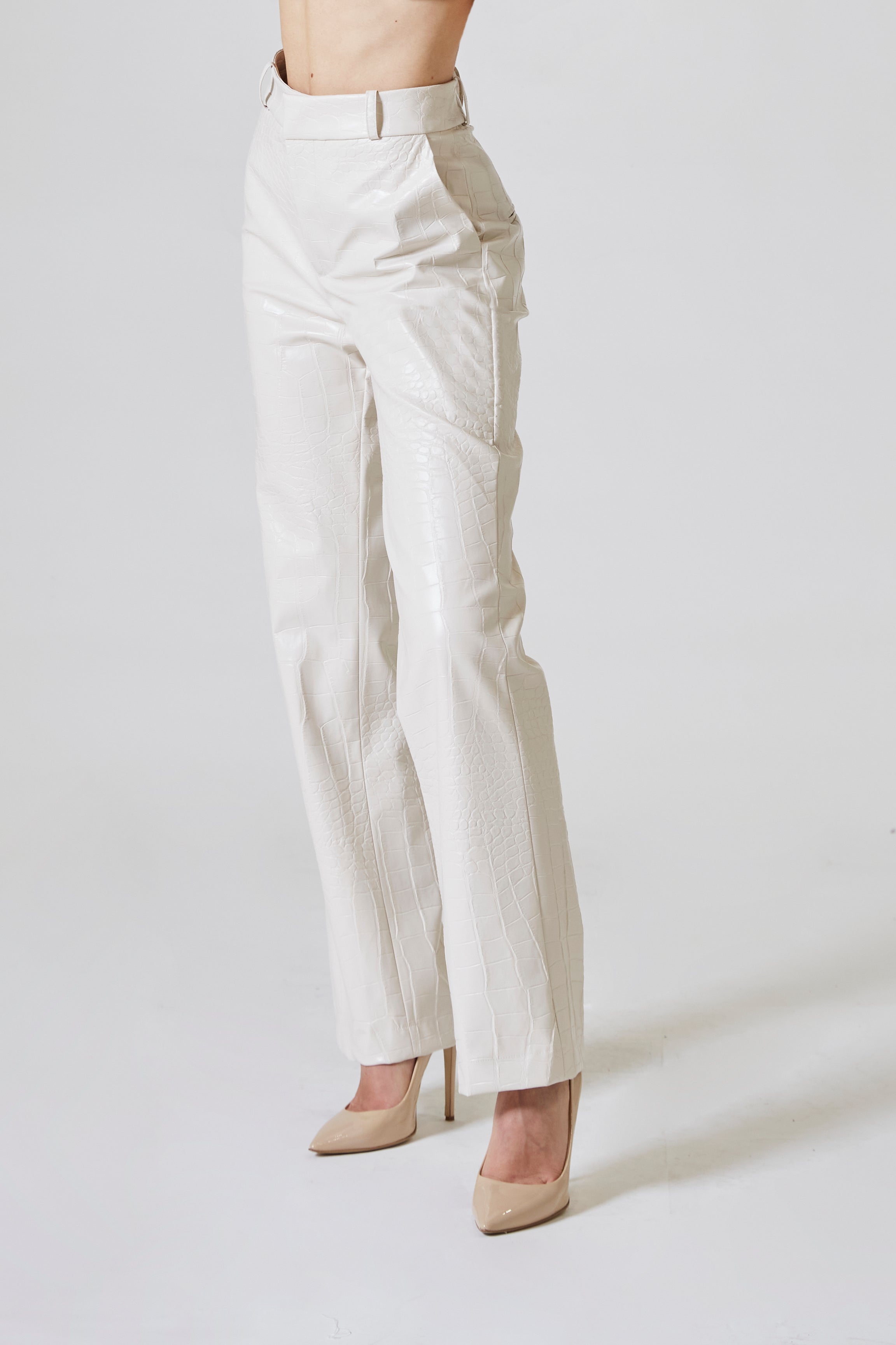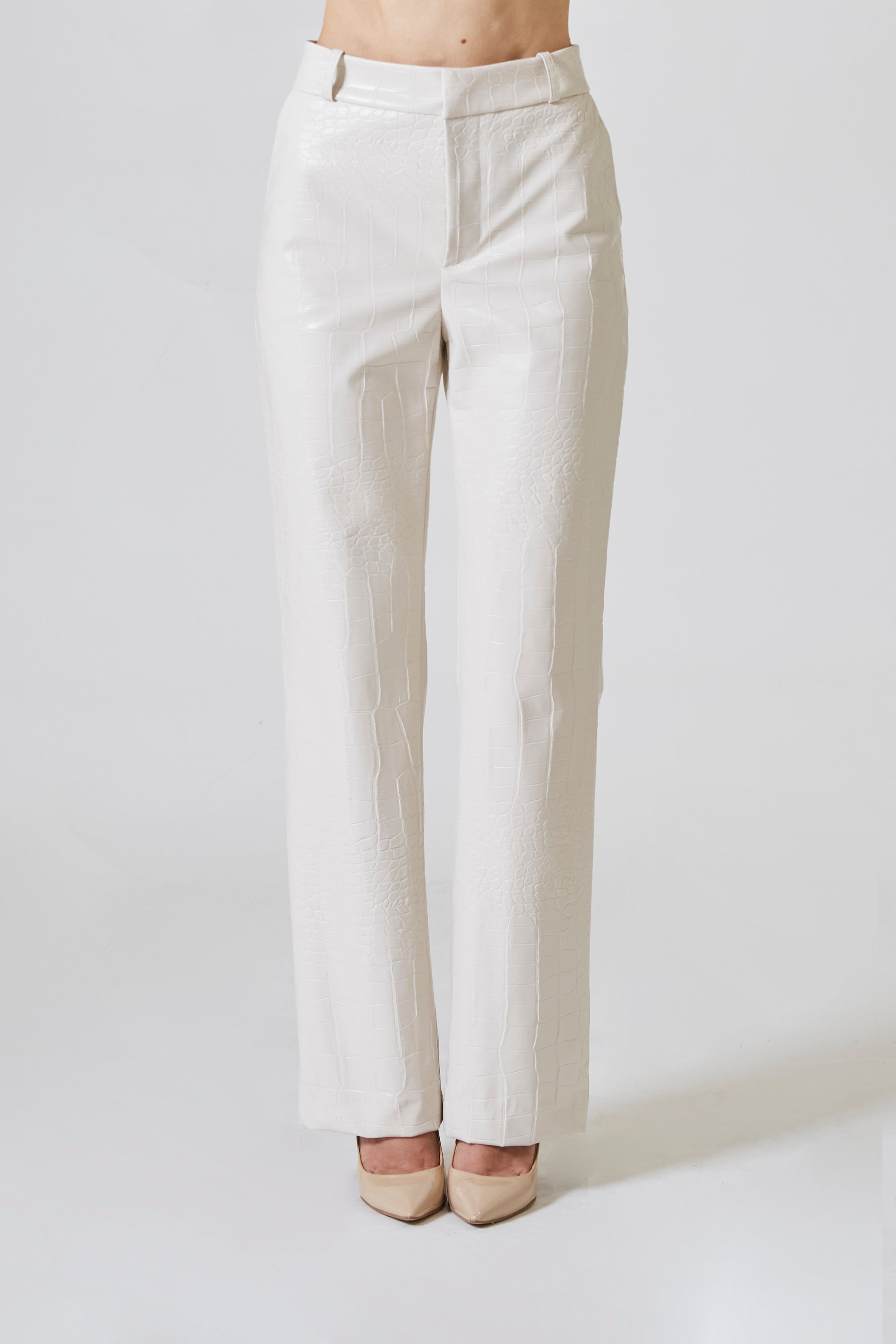 La linea era netta, decisa, priva di esitazioni. Un taglio dritto, preciso, disegnato per seguire il corpo senza rincorrerlo, per accompagnarlo senza dominarlo. Il pantalone in pelle pitonata si presentava come un manifesto silenzioso di forza e raffinatezza, un equilibrio audace tra sensualità materica e rigore sartoriale.