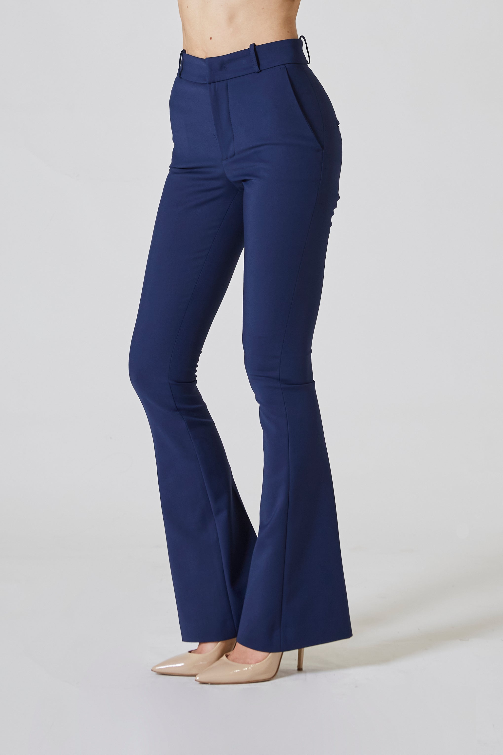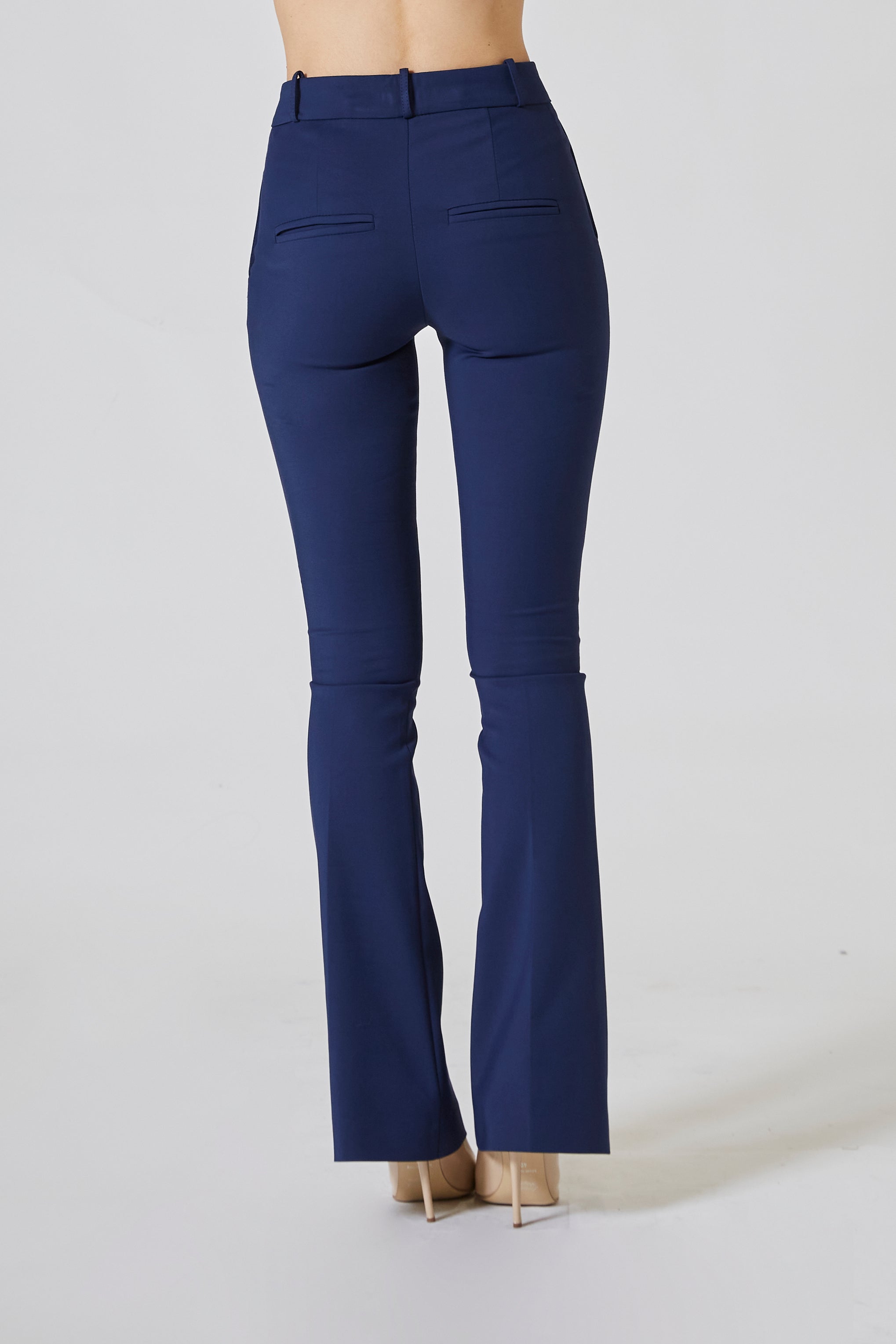 Il punto vita alto abbraccia le forme con discrezione, valorizzando la silhouette e allungando otticamente la gamba. La linea asciutta sulle cosce si apre con garbo a partire dal ginocchio, creando una morbida svasatura che sfiora il pavimento e accompagna ogni movimento con fluidità. È un pantalone che dona slancio e leggerezza, trasformando la semplicità della forma in pura eleganza dinamica.